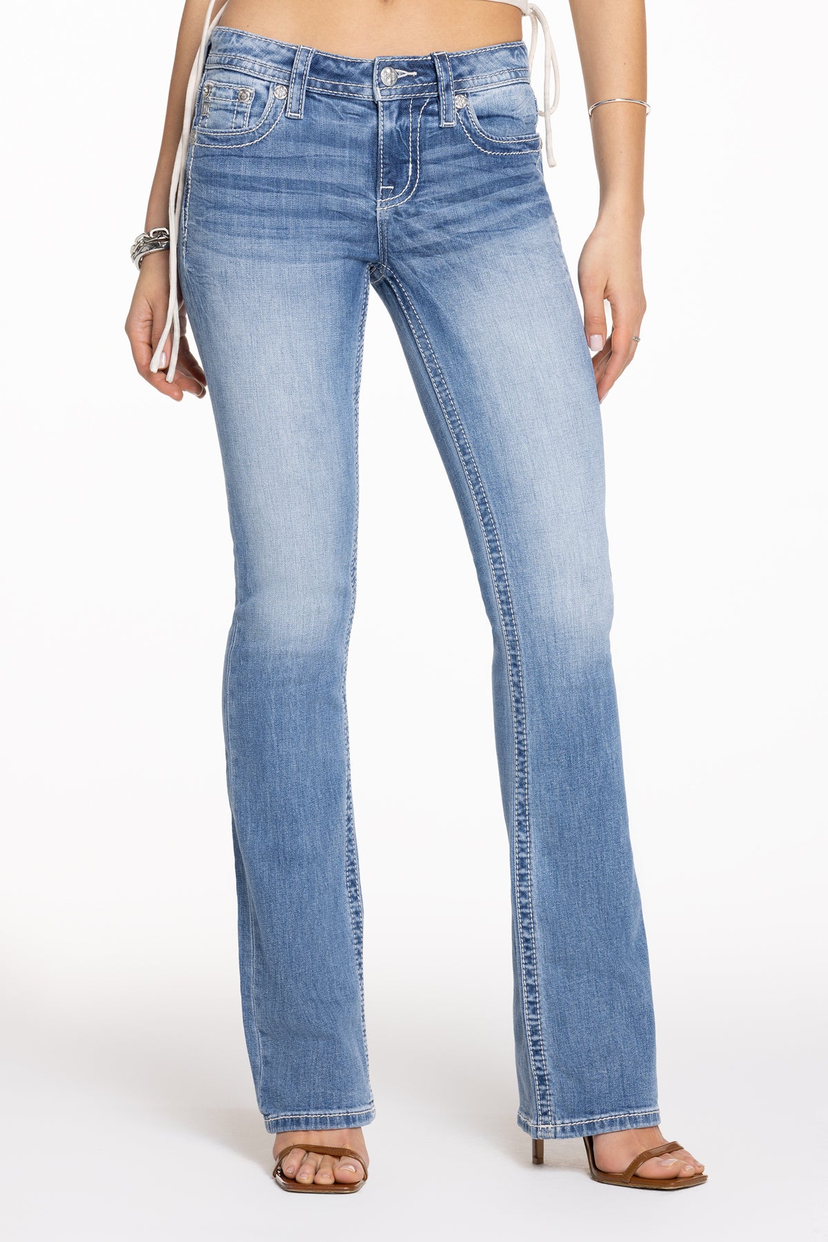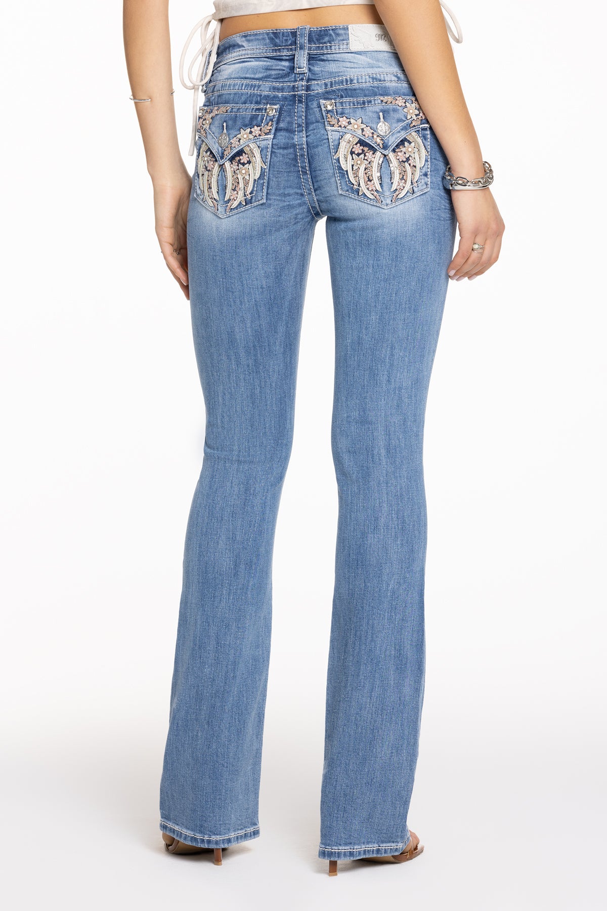 Washed, mid-rise bootcut jeans – Embroidered floral downward wing design – Leather appliqué accents with rhinestone rivets – Faux pearl and sequin highlights – Embossed white leather wing Miss Me brand patch – Whiskering details – 5-pocket design Model is wearing size: 25 Model Measurements: Height: 5??.5??Bust: 34??Waist: 24??Hips: 35??Fabric Content: 99% Cotton, 1% Elastane Care: Gentle machine wash inside-out with like colors in cold water. Tumble dry low. Style No. M5082B192L-L303, M5082B192V-L303