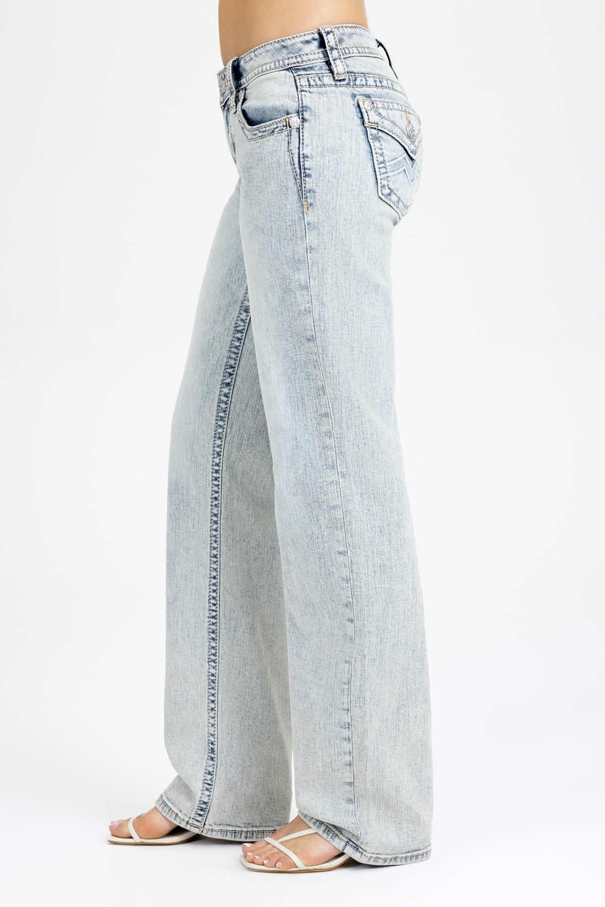 Washed, low-rise slim wide jeans – Embroidered chevron “M” design – Embossed white studded leather cross Miss Me brand patch – 5-pocket design Model is wearing size: 25 Model Measurements: Height: 5’9″ Bust: 34B Waist: 25″ Hips: 36″ Fabric Content: 99% Cotton, 1% Elastane Care: Gentle machine wash inside-out with like colors in cold water. Tumble dry low. Style No. L3742SW21L-V138, L3742SW21S-V138, L3742SW21V-V138