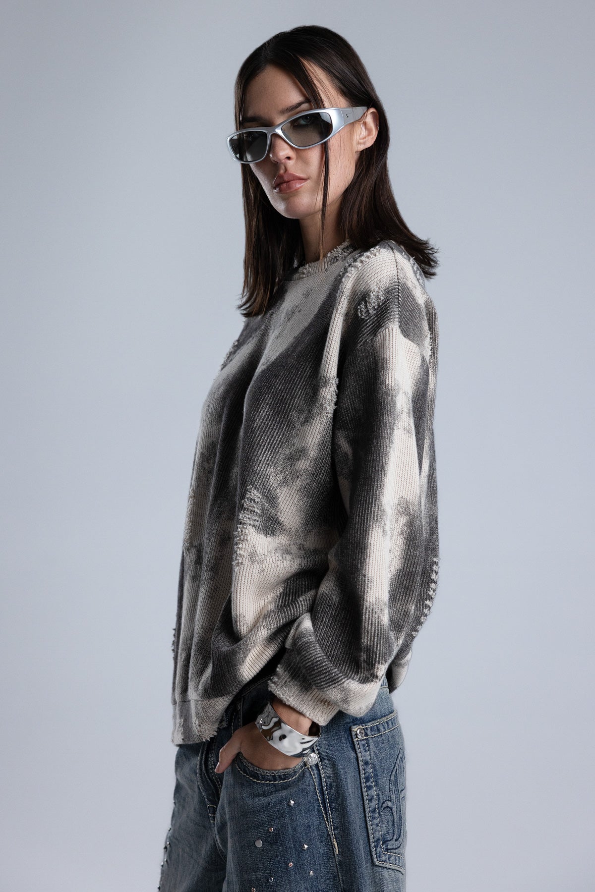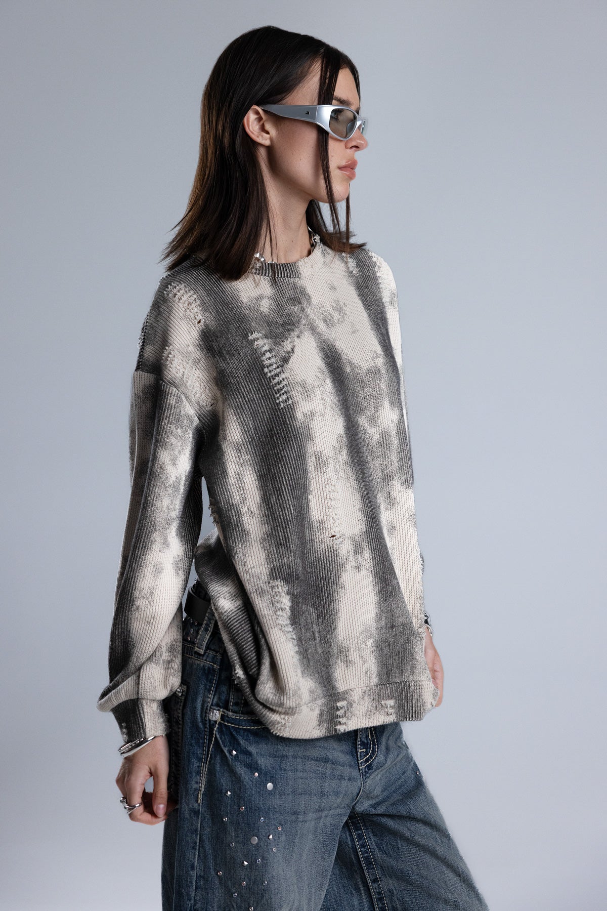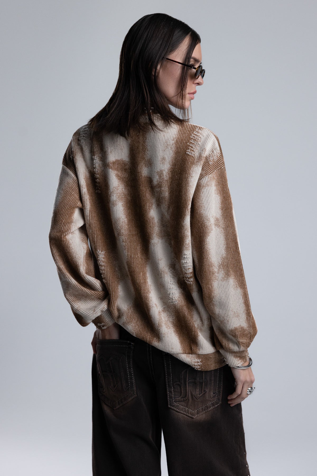 Relaxed fit, knit sweater – Soft ribbed knit construction – Tie-dye wash effect – Intermittent distress detailing – Ribbed cuffs and hem – Classic crew neckline Style No. BMSW0029L-MULTI BEIGE, BMSW0029L-MULTI GRY