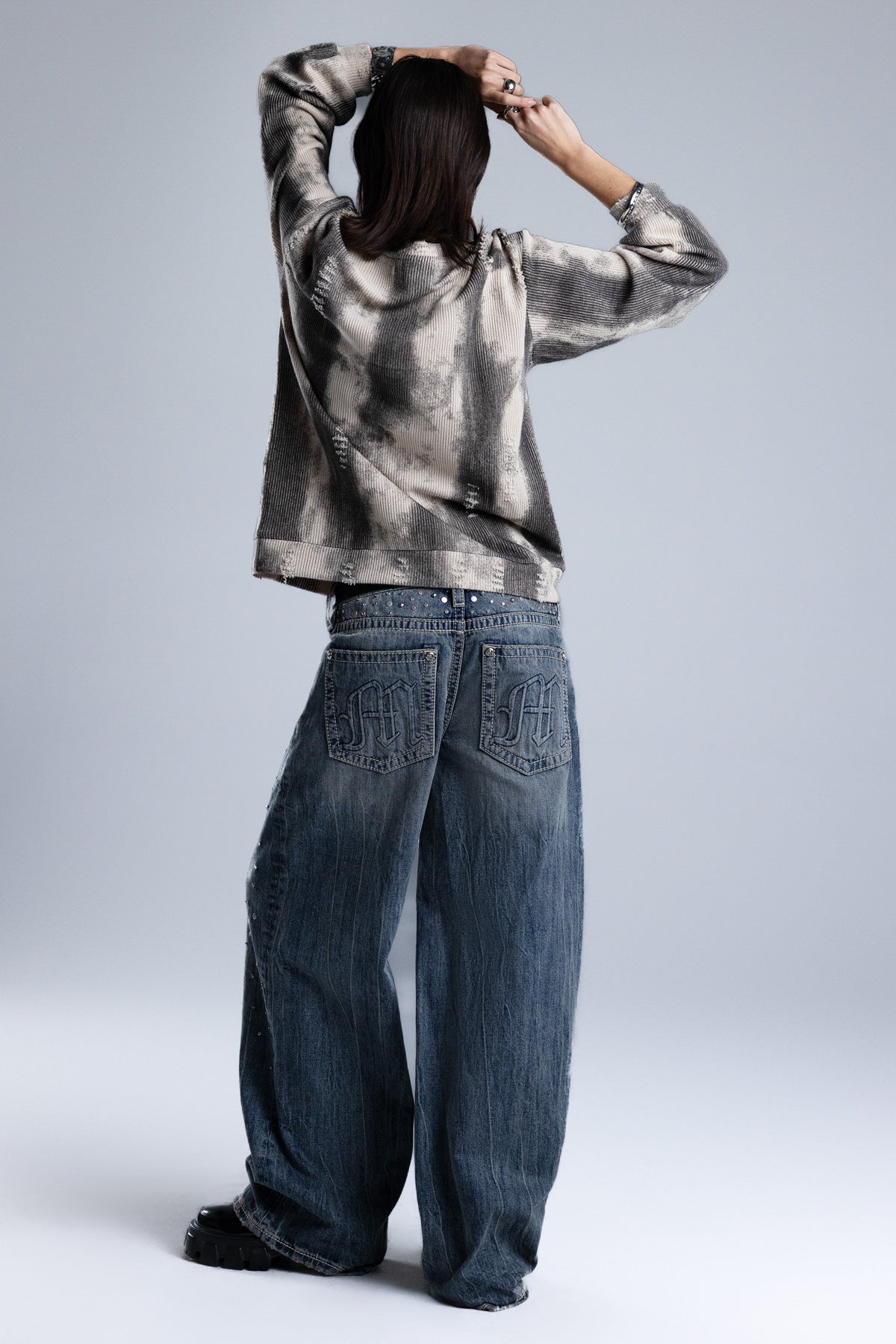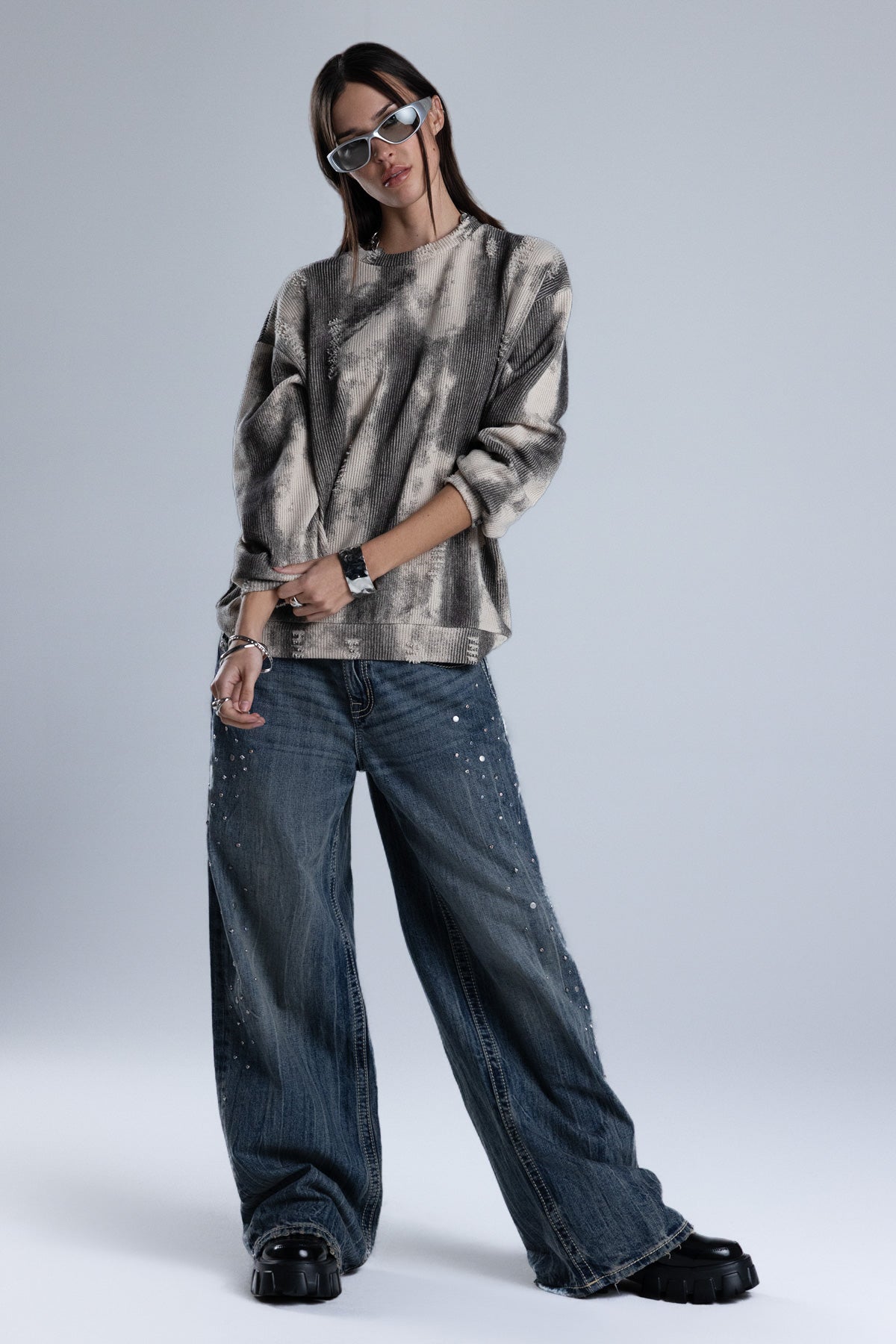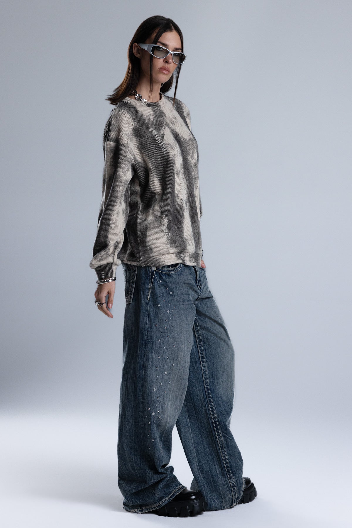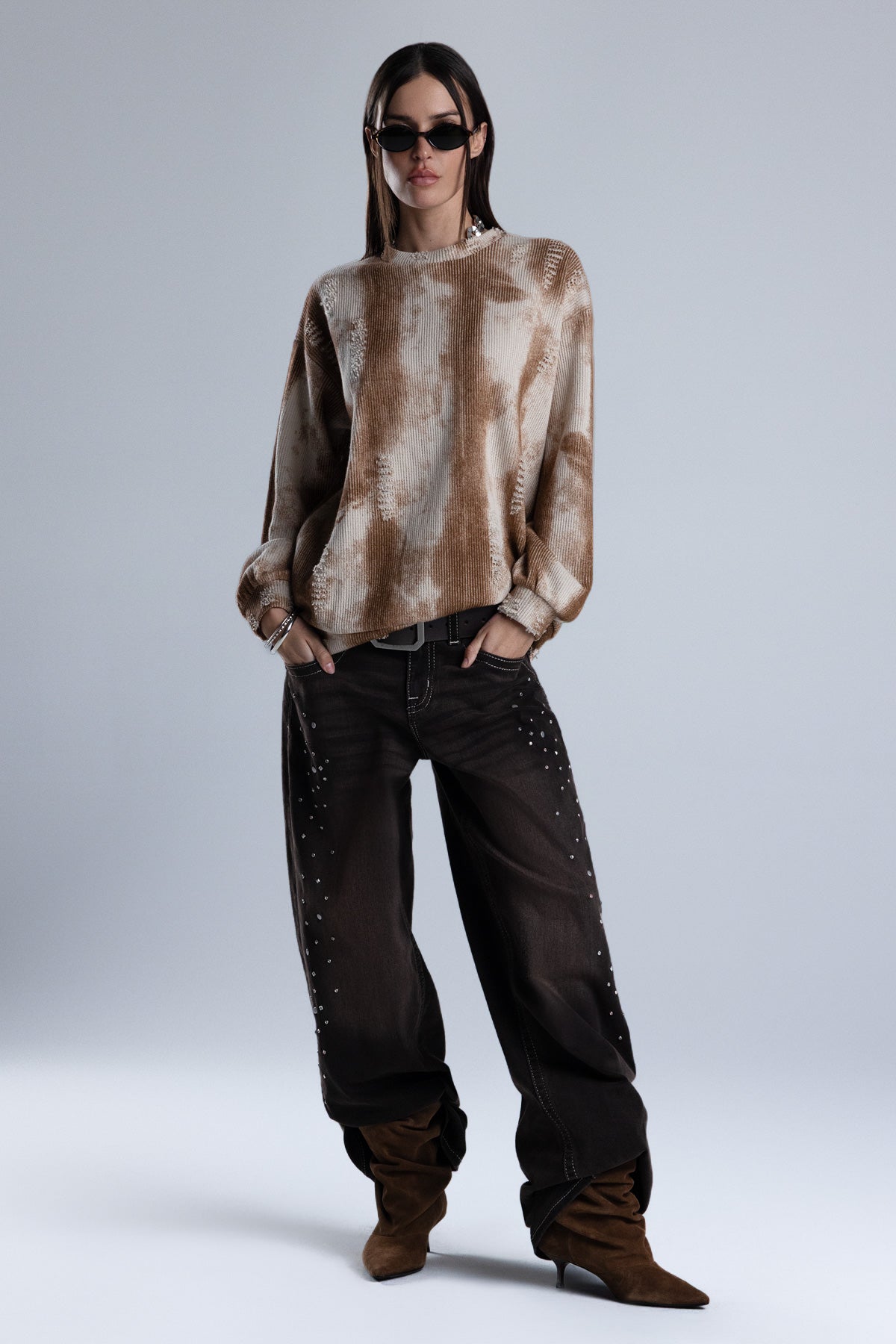 Relaxed fit, knit sweater – Soft ribbed knit construction – Tie-dye wash effect – Intermittent distress detailing – Ribbed cuffs and hem – Classic crew neckline Style No. BMSW0029L-MULTI BEIGE, BMSW0029L-MULTI GRY