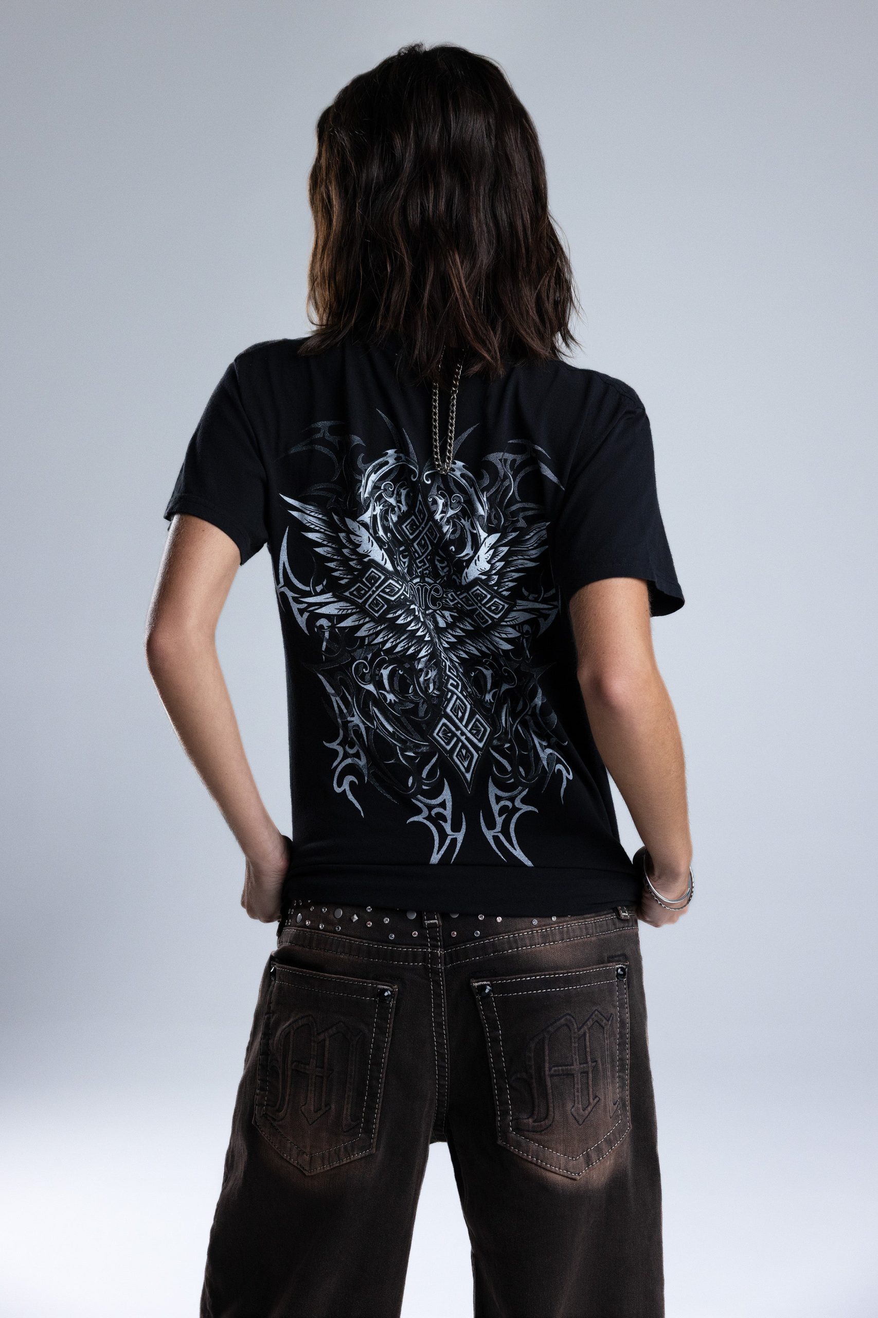 Relaxed fit graphic tee – Gothic winged cross graphic design – Tribal flame-inspired scroll accents – Miss Me monogram centerpiece – Classic crew neckline Style No. BMT0175S-CHRC BLK, BMT0175S-WHITE