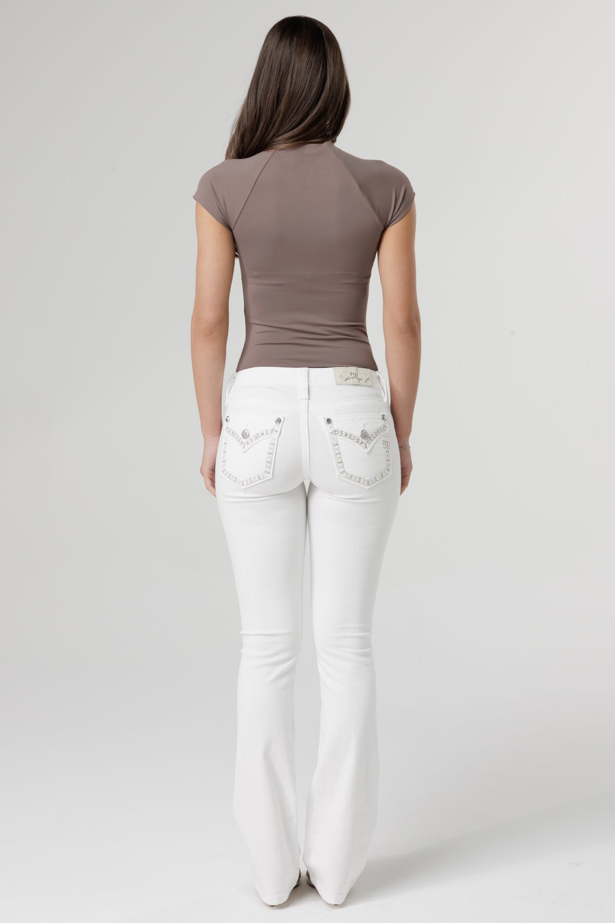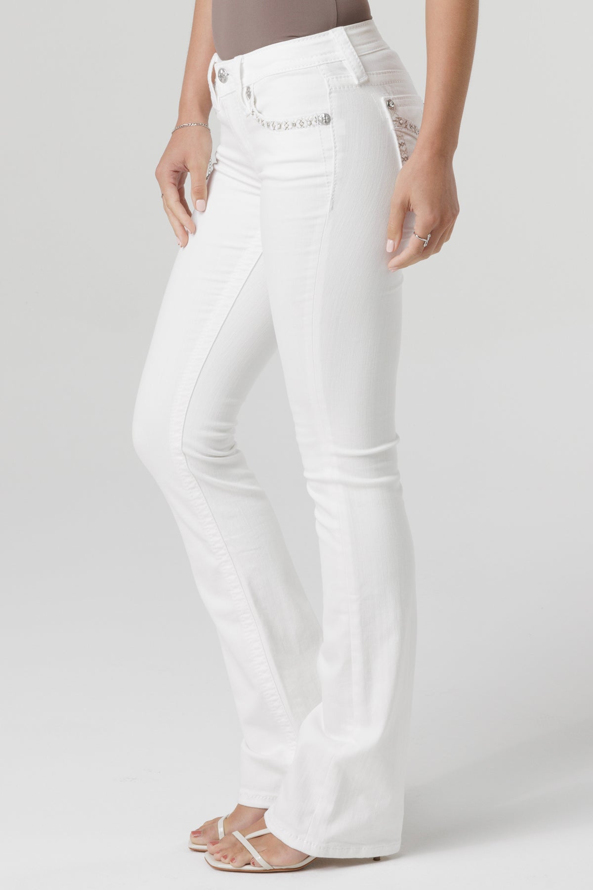 Mid-rise, white bootcut jeans – Border stitch design with M embroidery on back pocket – Faux flap pocket with rhinestone rivets – Embossed white leather cross Miss Me brand patch – 5-pocket design Style No. M9289B-W01, M9289BS-W01, M9289BV-W01