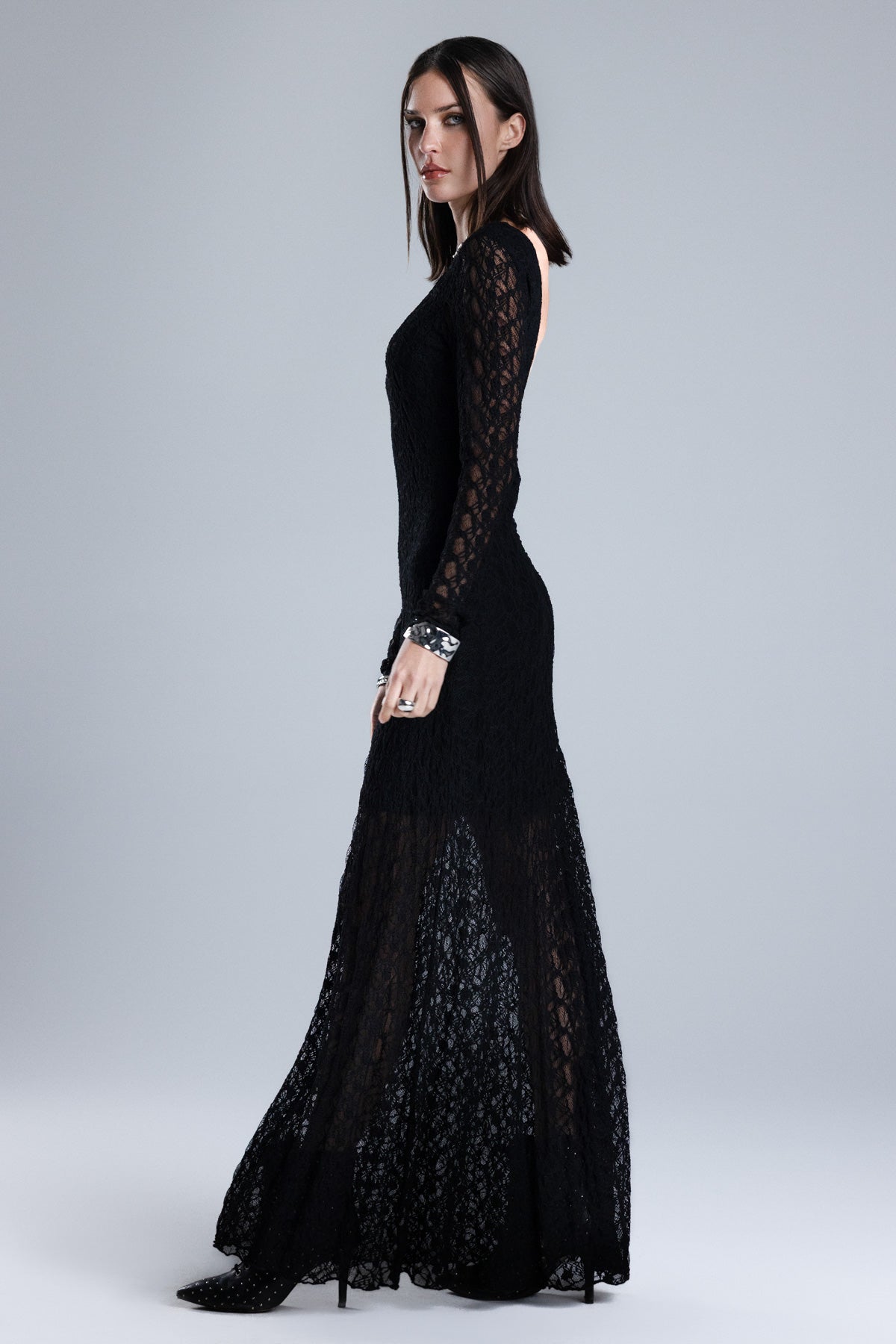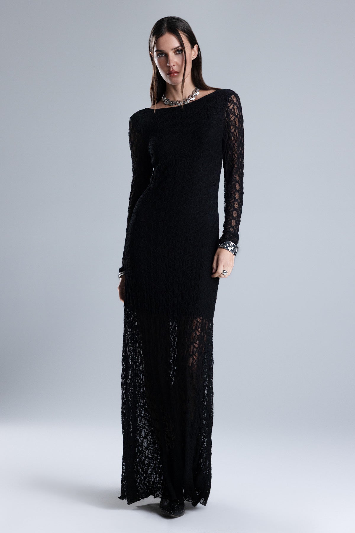 Slim fit, sheer maxi dress – Textured floral lace construction – Soft woven interior lining – Scalloped cuffs and hems – Wide scoop back – Bateau neckline Style No. BMD0012L-BLACK