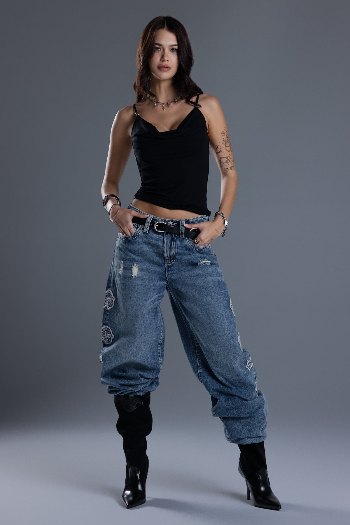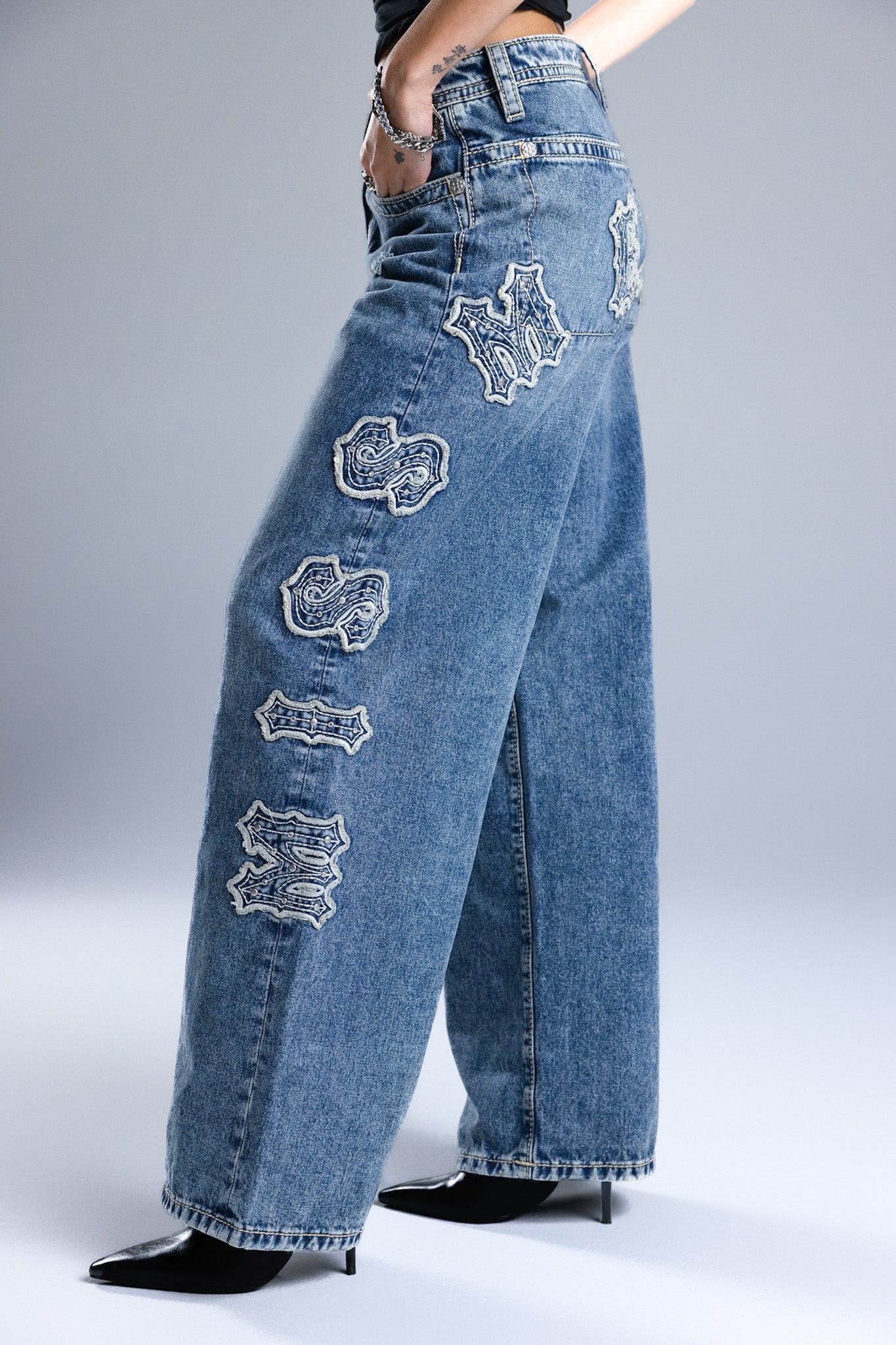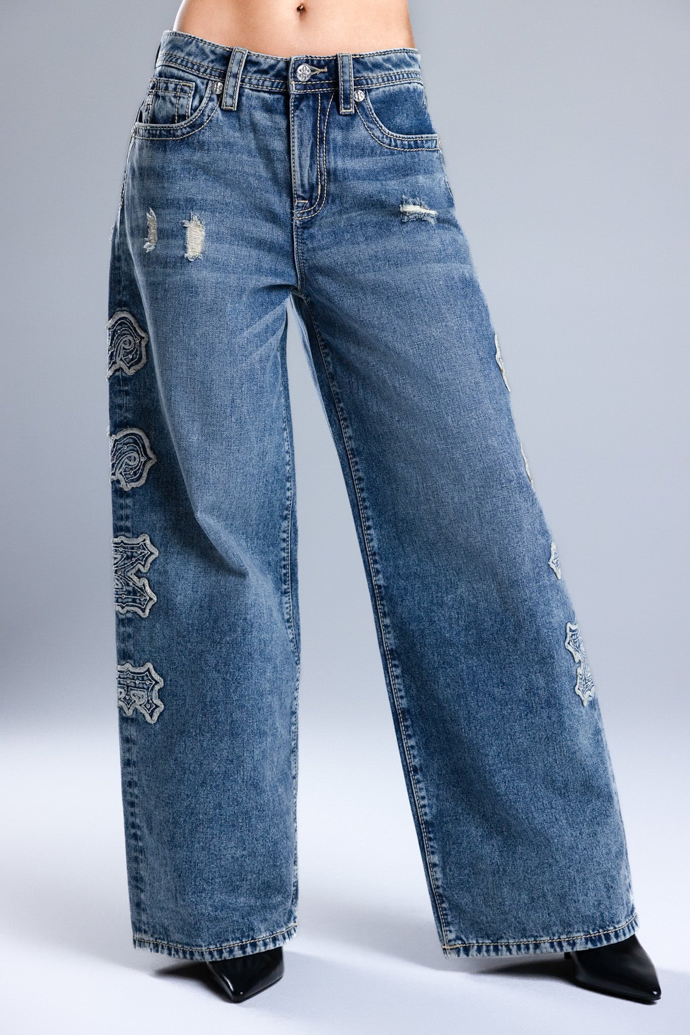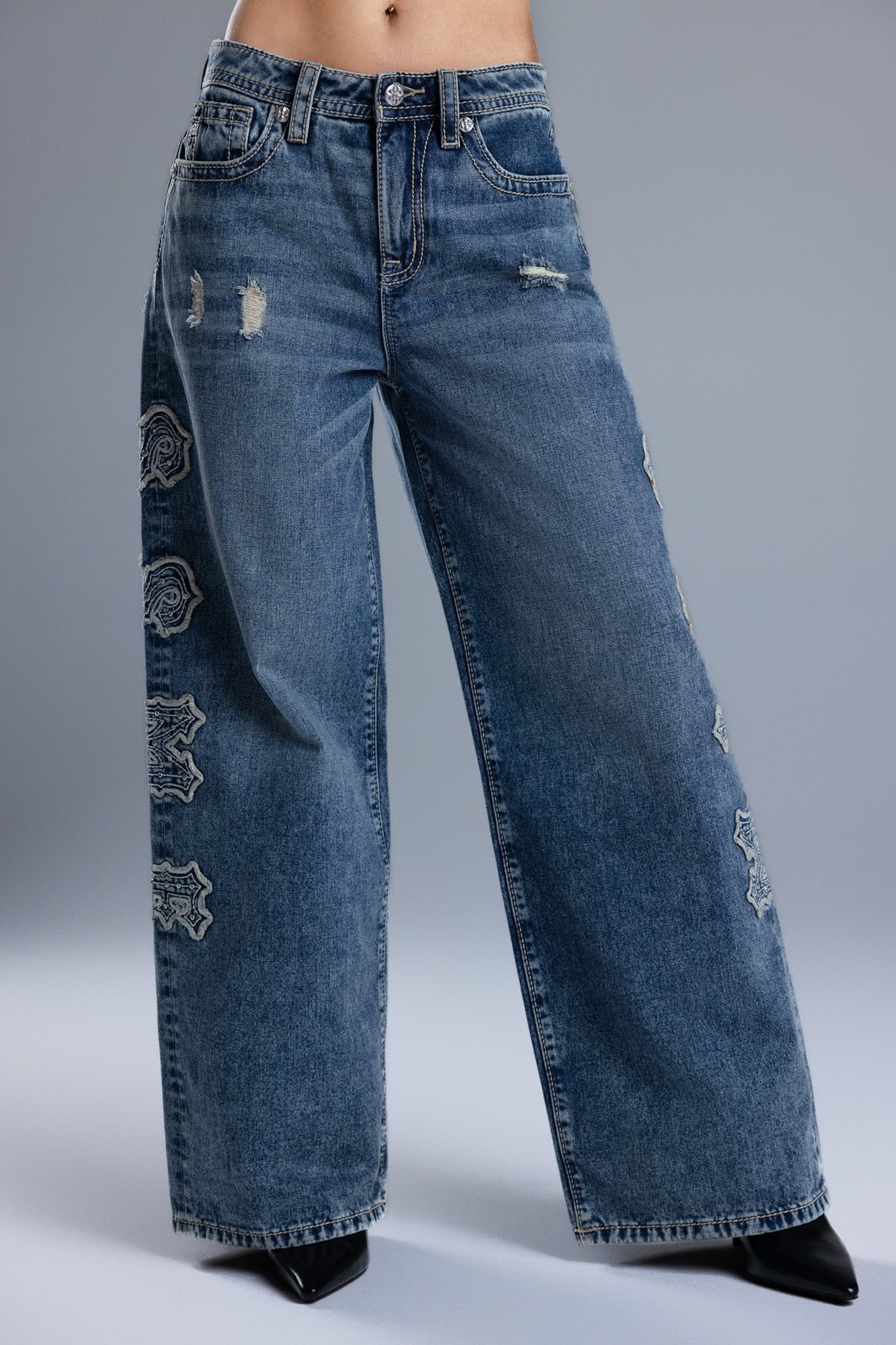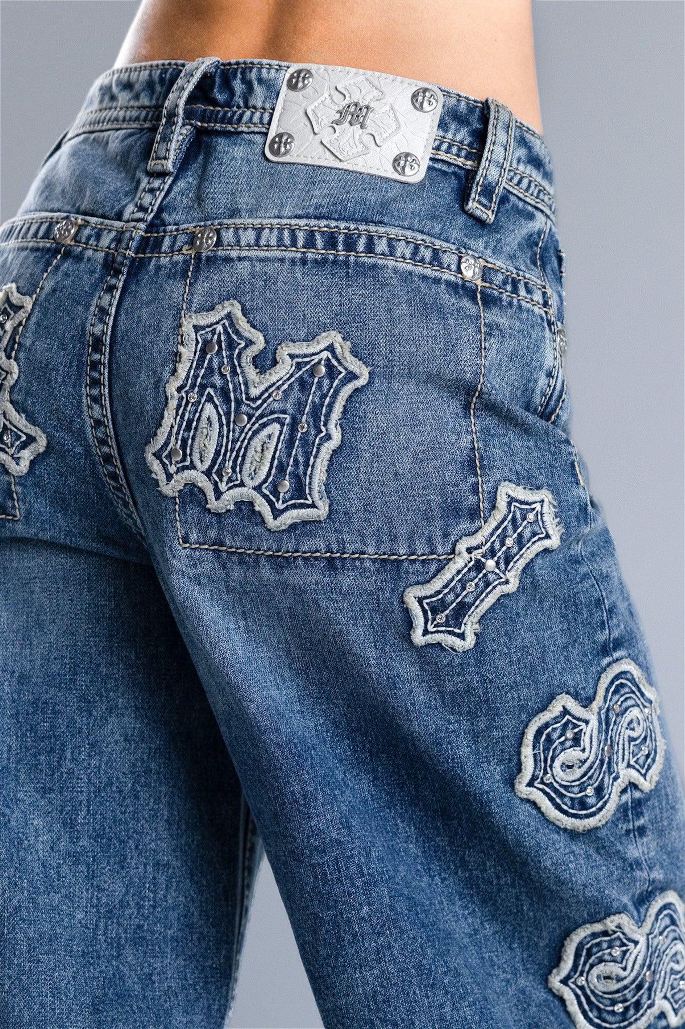 Washed finish, mid-rise baggy wide jeans – Oversized embroidered Miss Me script motif – Stud and rhinestone rivet accents – Structured square back pocket design – Embossed white studded leather cross Miss Me brand patch – Whiskering details with light distress – 5-pocket design Style No. M2392BWS-M1101, M2392BWV-M1101