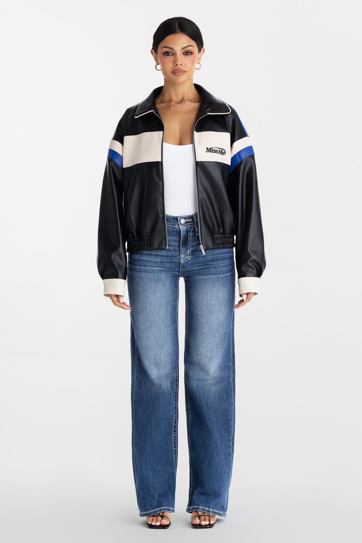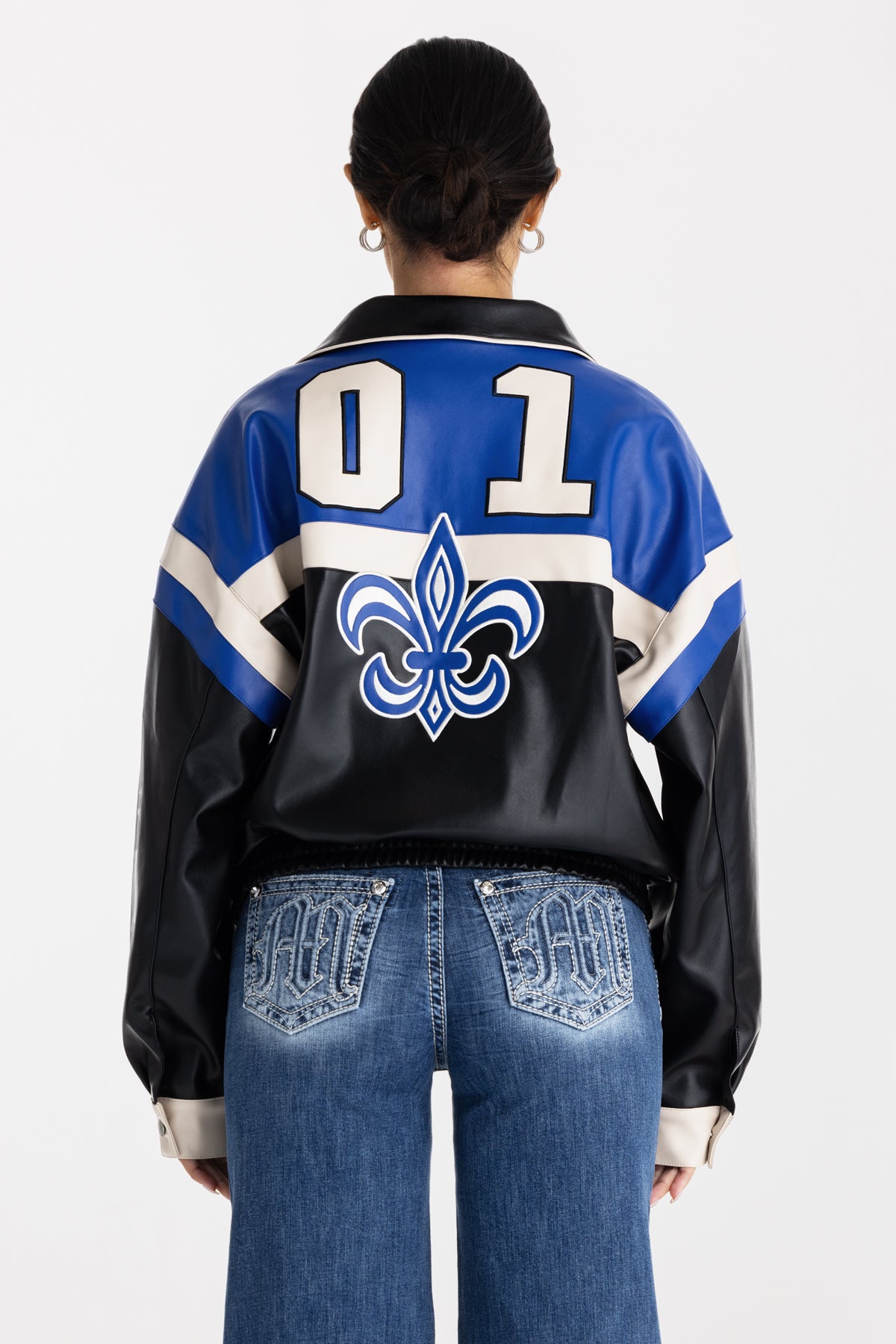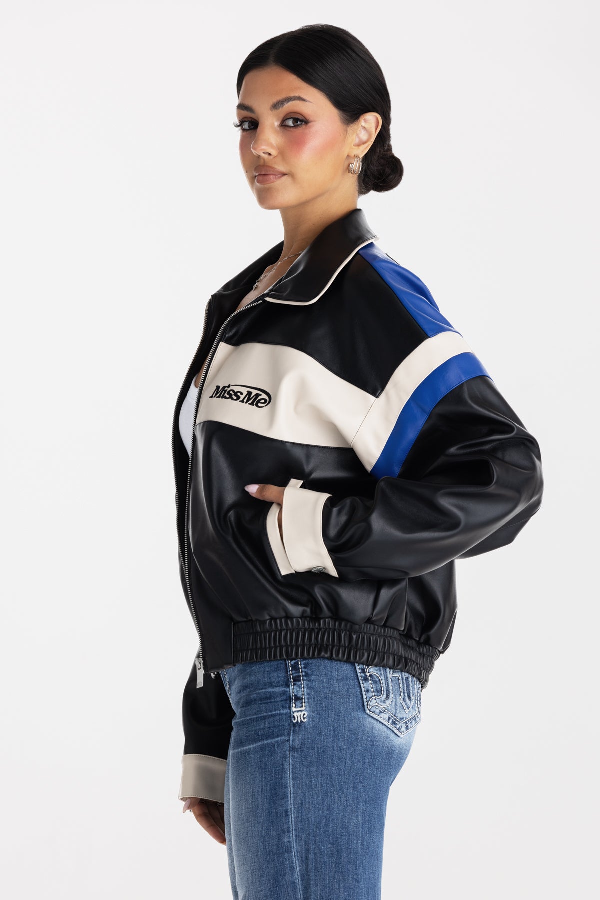 Faux tri-panel leather jacket – Embroidered vintage-inspired Miss Me branding – Embossed 01 and fleur-de-lis design – Cinched waist hem – Sleeve button closure detail – 2-pocket design – Zip-front closure Model is wearing size: S Model Measurements: Height: 5????Bust: 34B Waist: 25??Hips: 36??Fabric Content: Self/Faux: 50% Polyurethane, 50% Polyester; Cont1/Faux: 50% Polyurethane, 50% Polyester; Cont2/Faux: 50% Polyurethane, 50% Polyester Care: Gentle machine wash inside-out with like colors in cold water. Hang to dry Style No. BMJ0044L-BLACK