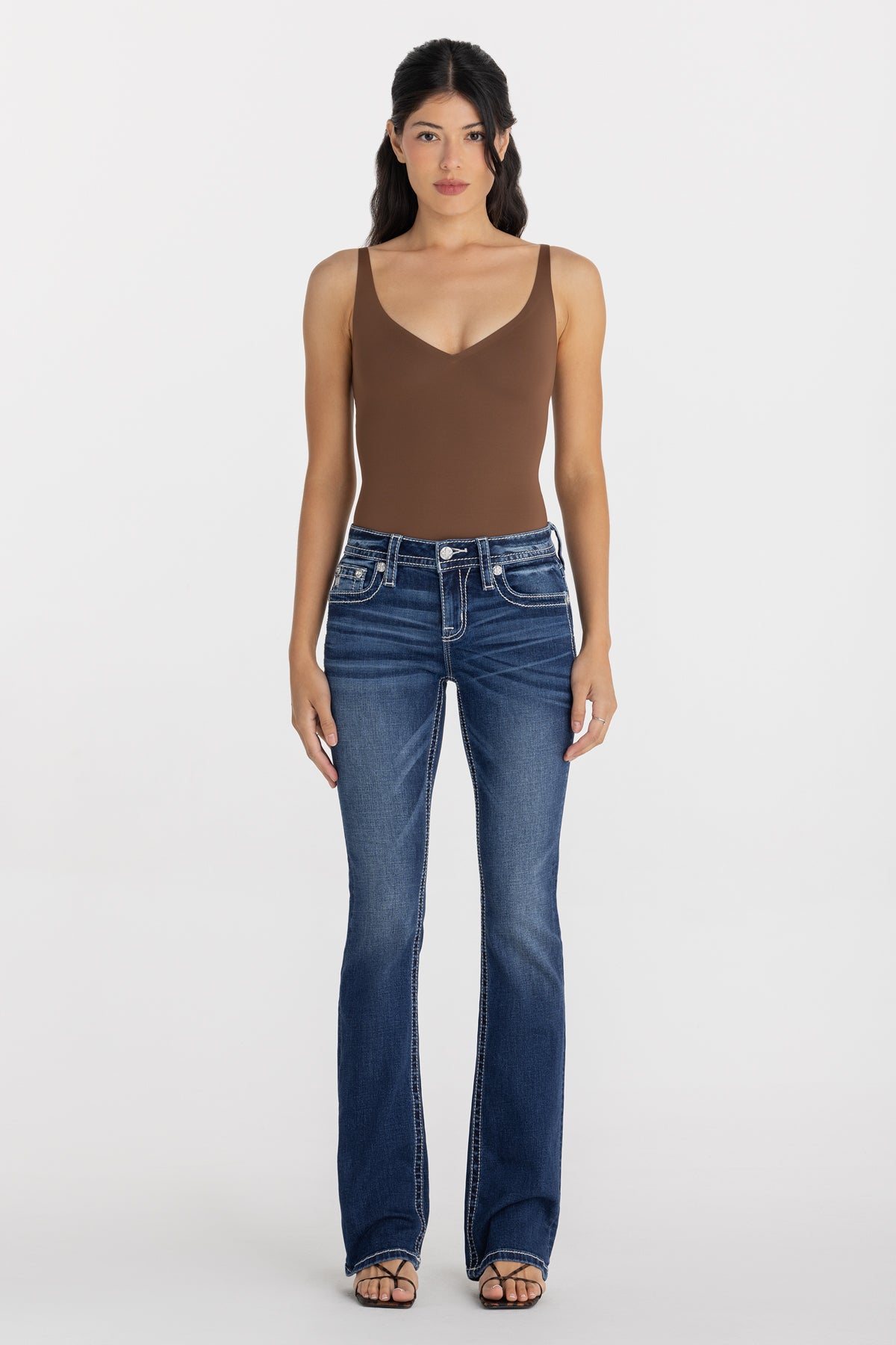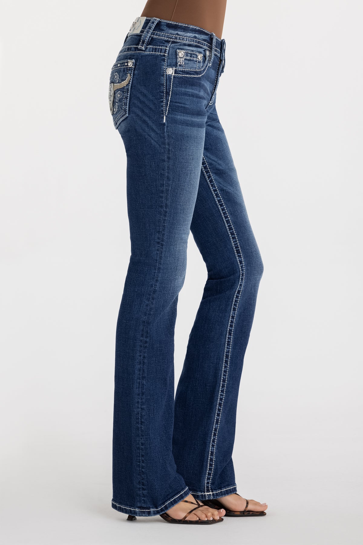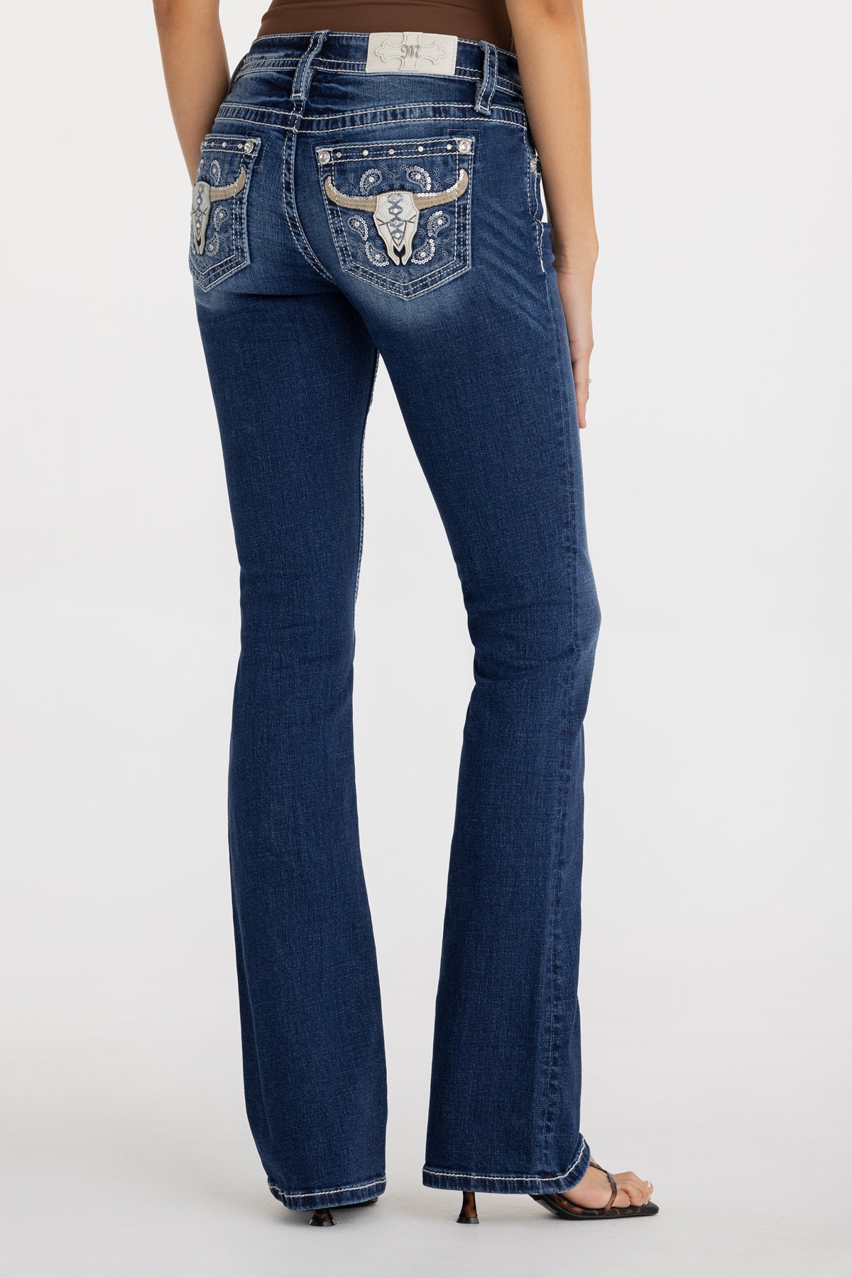 Washed, mid-rise bootcut jeans – Embroidered leather appliqué longhorn design – Stitched paisley filigree detailing – Sequins, faux pearl, and rhinestone rivet accents – Embossed white leather cross Miss Me brand patch – Whiskering details – 5-pocket design Model is wearing size: 25 Model Measurements: Height: 5’8″ Bust: 32B Waist: 25″ Hips: 35″ Fabric Content: 99% Cotton, 1% Elastane Care: Gentle machine wash inside-out with like colors in cold water. Tumble dry low. Style No. M9526BL-K1521, M9526BV-K1521