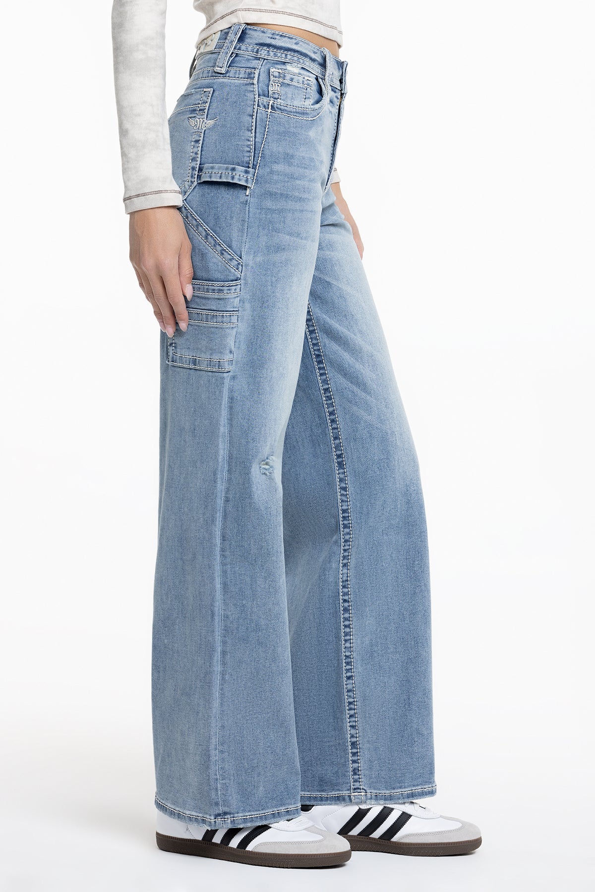 Washed, high-rise cargo wide leg jeans – Embroidered mini winged Miss Me logo – Dual front pockets – Right layered and left open cargo pocket design – Whiskering details with intermittent distress – 5-pocket design Model is wearing size: 25 Model Measurements: Height: 5’9″ Bust: 34″ Waist: 25″ Hips: 37″ Fabric Content: 66% Cotton, 14% Lyocell, 18% Viscose, 2% Elastane Care: Gentle machine wash inside-out with like colors in cold water. Tumble dry low. Style No. H3636GW104S-L295, H3636GW104L-L295