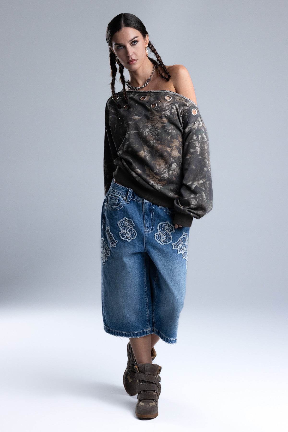 Relaxed fit, one-shoulder long sleeve camo top – 01 and triple star graphic print design – Eyelets, rhinestone rivets, and diamond-shaped stud accents – Ribbed cuffs and hem – Layered raw-edge asymmetric neckline Style No. BMT0109L-CAMO GRN