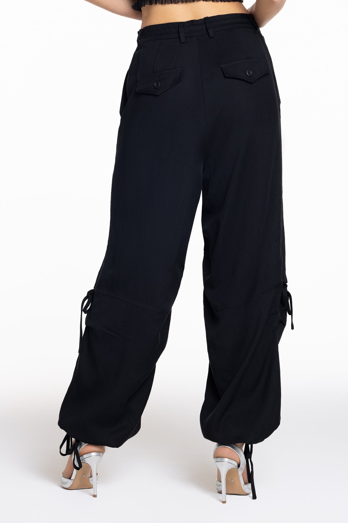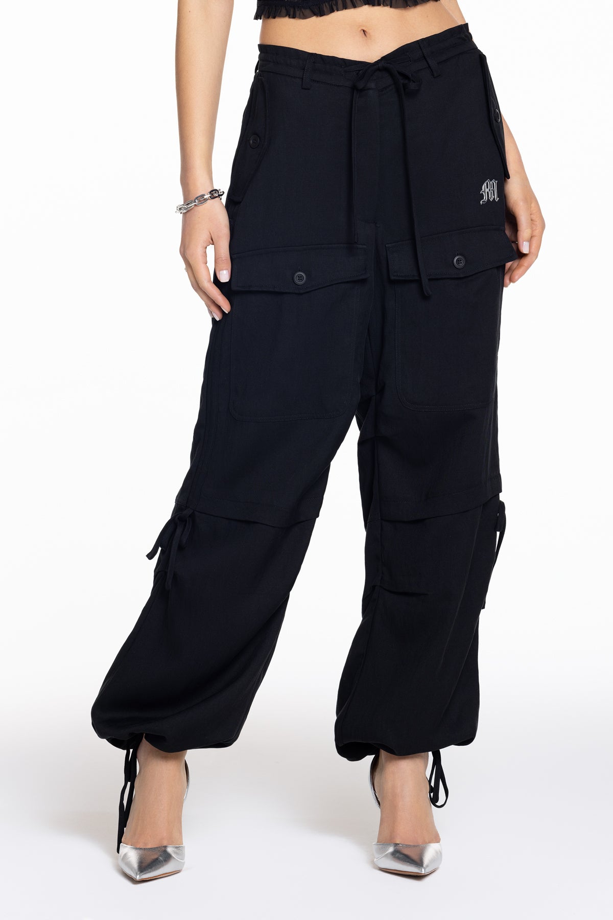 Light-weight cargo pants – Breathable crepe fabric texture – Embossed mini gothic Miss Me logo branding – Dual cargo pockets with button closures – Functional front pockets with flap closure – Faux back pockets – Adjustable drawstrings at waist, knees and hem Model is wearing size: S Model Measurements: Height: 5’9.5″ Bust: 34″ Waist: 24″ Hips: 35″ Fabric Content: Self: 65% Tencel, 30% Rayon, 5% Nylon; Lining: 100% Rayon Care: Gentle machine wash inside-out with like colors in cold water. Tumble dry low. Style No. BMP0003L-BLACK, BMP0003L-WHITE