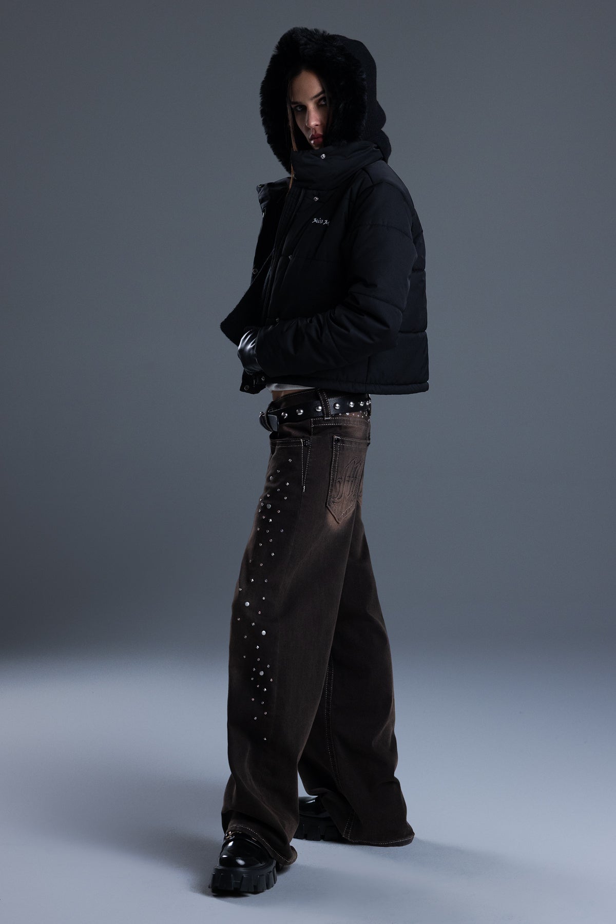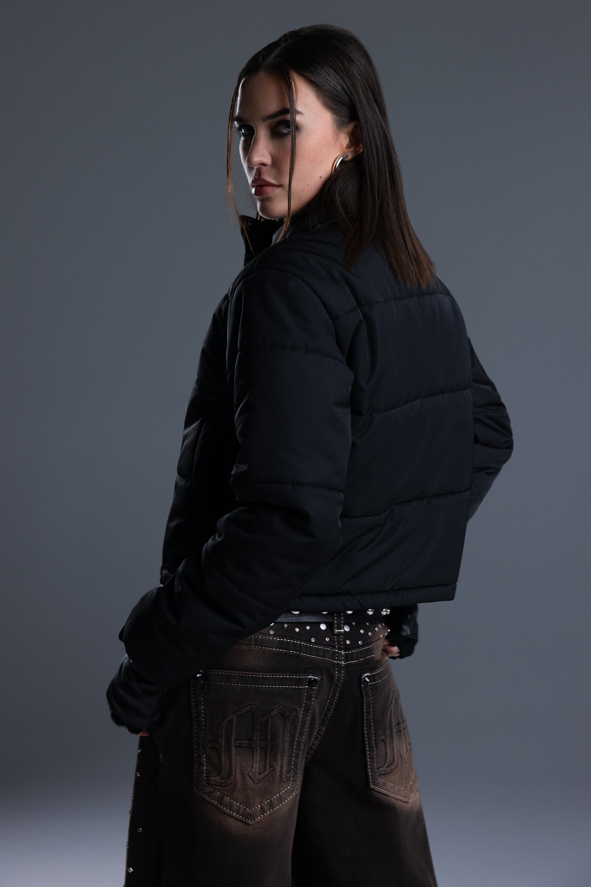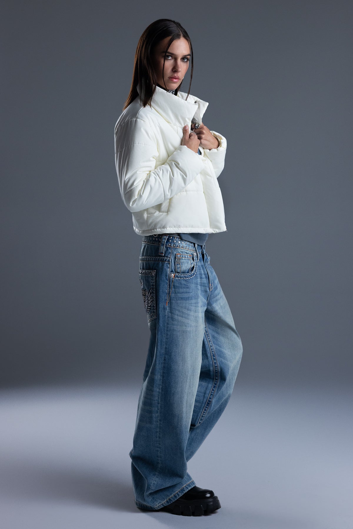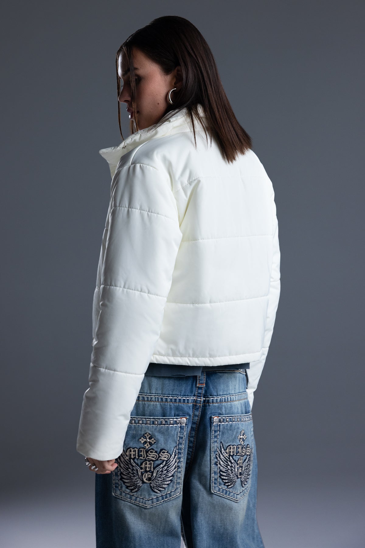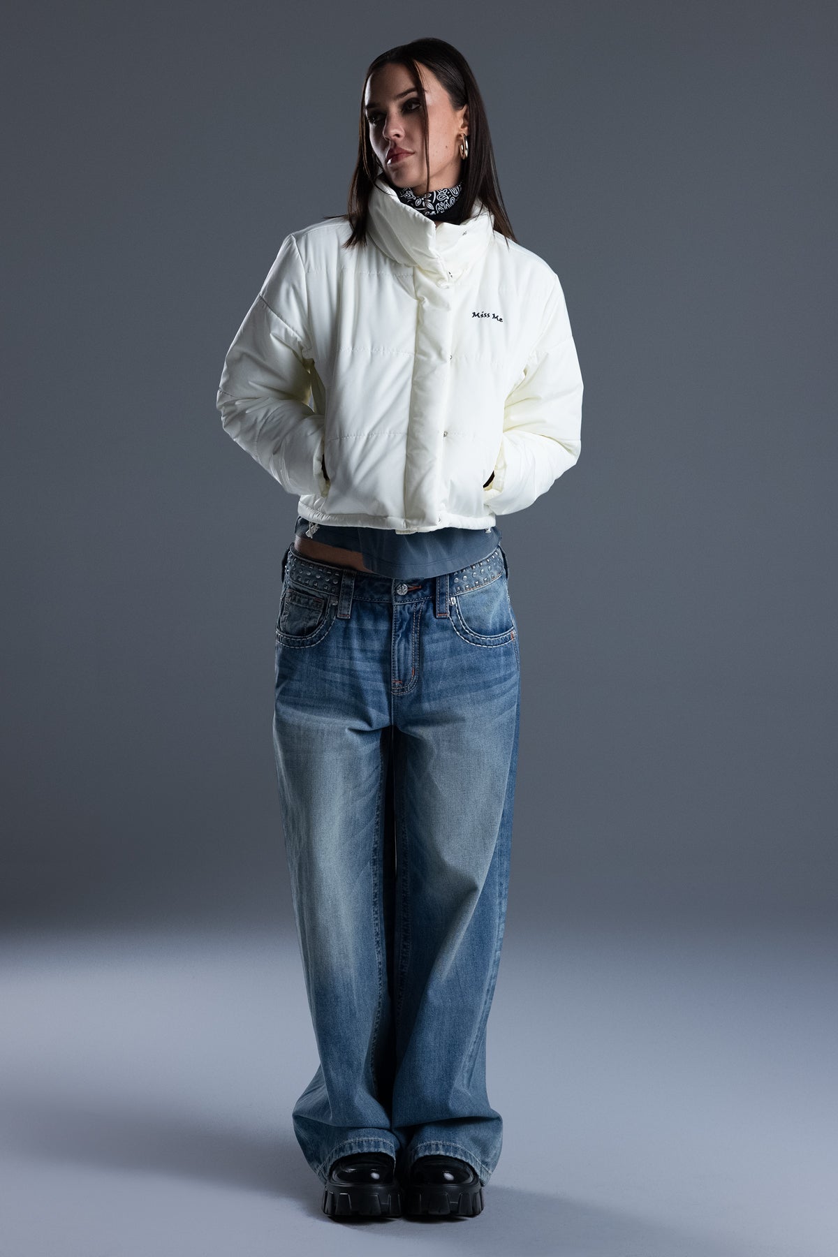 Boxy, cropped puffer jacket – Lightly padded quilted construction – Embroidered contrast Miss Me script – Zipper and snap front closure – Side welt pockets – Stand neckline Style No. BMJ0076L-BLACK, BMJ0076L-OFF WHT