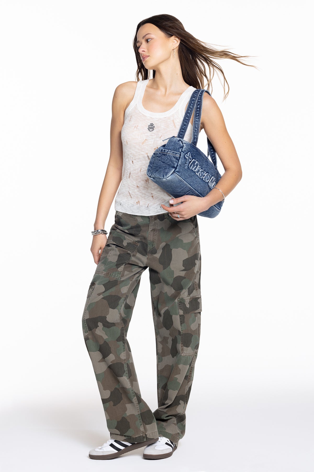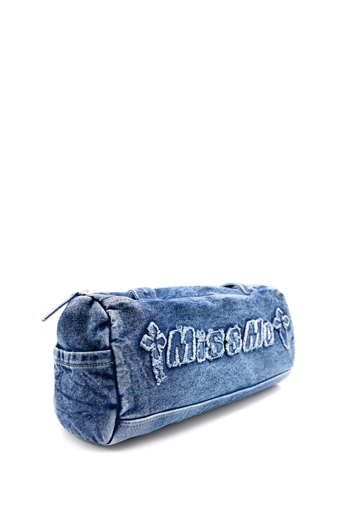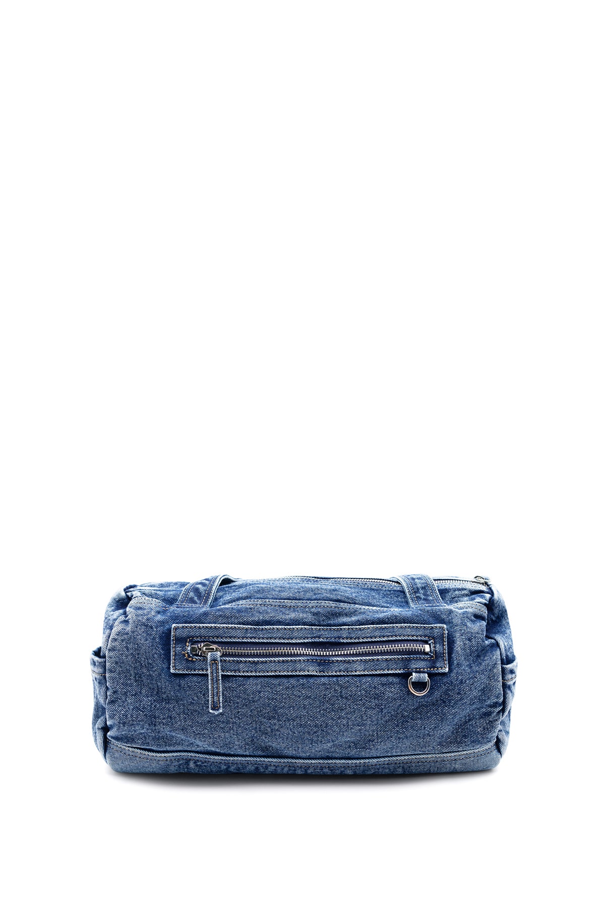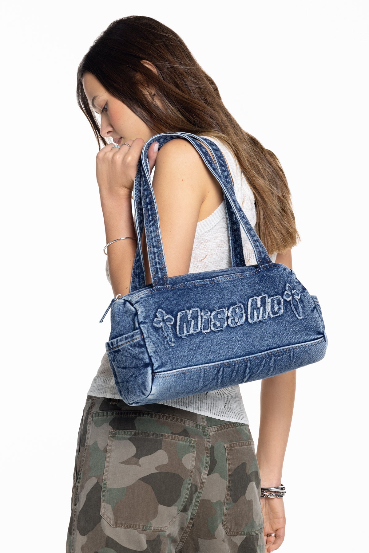 – Embossed and frayed branded design – Zip-top closure – Interior and exterior zip pockets – Open side pockets Fabric Content: 100% Cotton Care: Do not wash. Style No. BGS0135-BLUE
