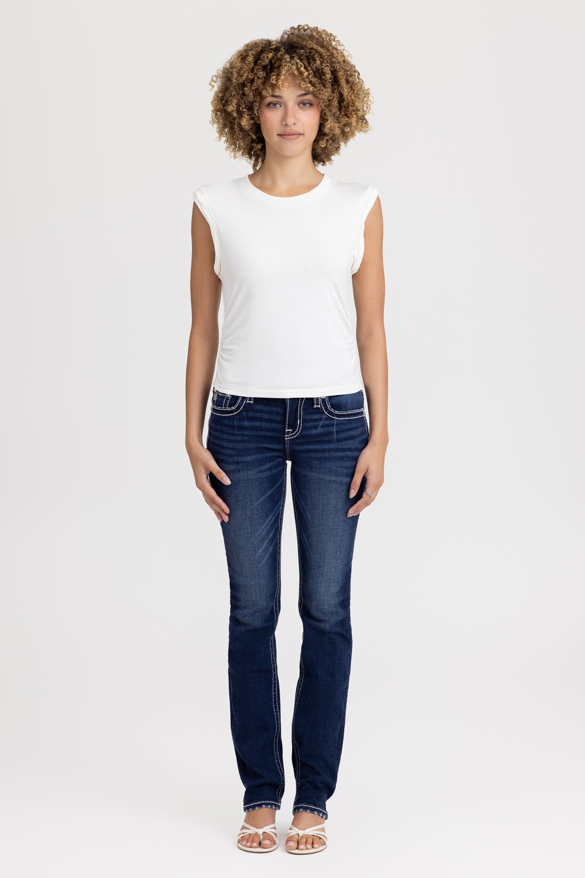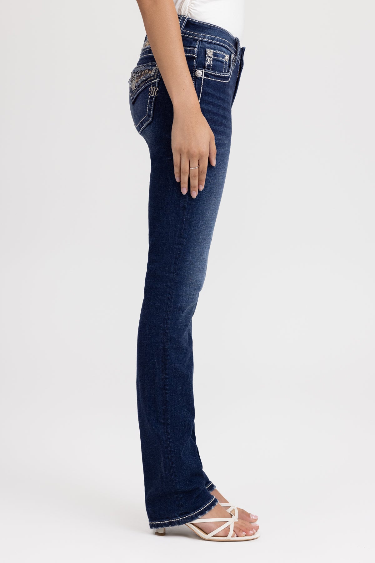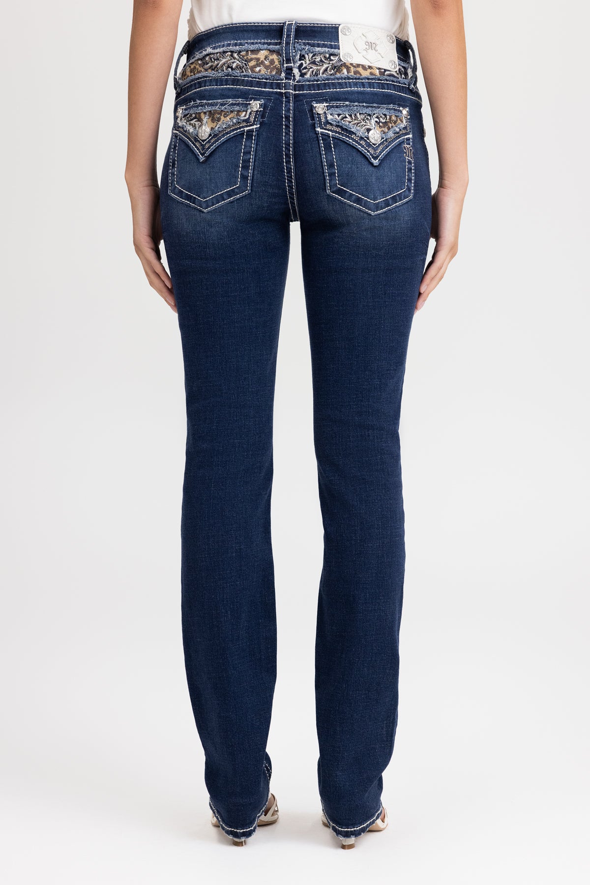Washed, mid-rise straight jeans – Embroidered leopard motif with filigree design – Gems and rhinestone rivet highlights – Metallic crosshatch mesh accents – Distressed yoke and faux flap detailing – Embossed white studded leather cross Miss Me brand patch – Whiskering details – Functional back pockets – 5-pocket design Model is wearing size: 25 Model Measurements: Height: 5????Bust: 32B Waist: 25??Hips: 34??Fabric Content: 99% Cotton, 1% Elastane Care: Gentle machine wash inside-out with like colors in cold water. Tumble dry low. Style No. M9541TSS-D1153, M9541TVV-D1153