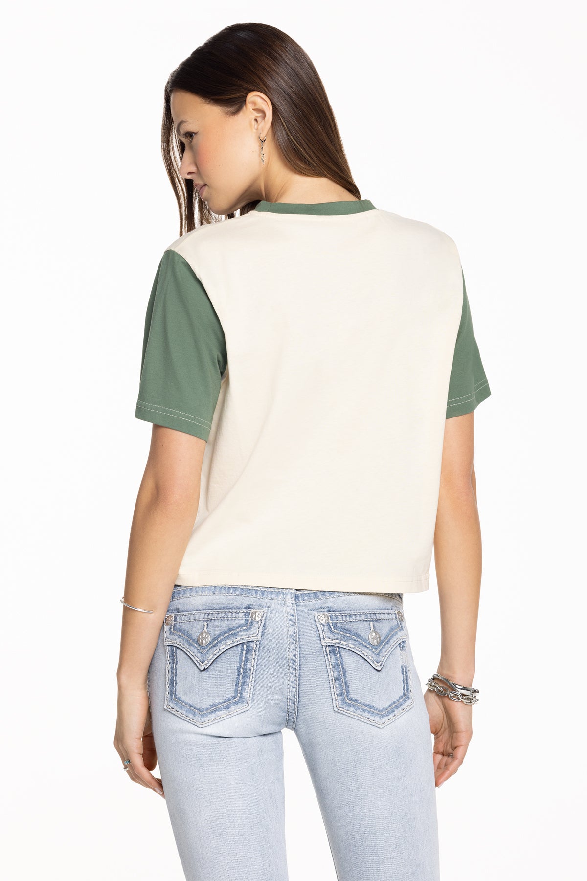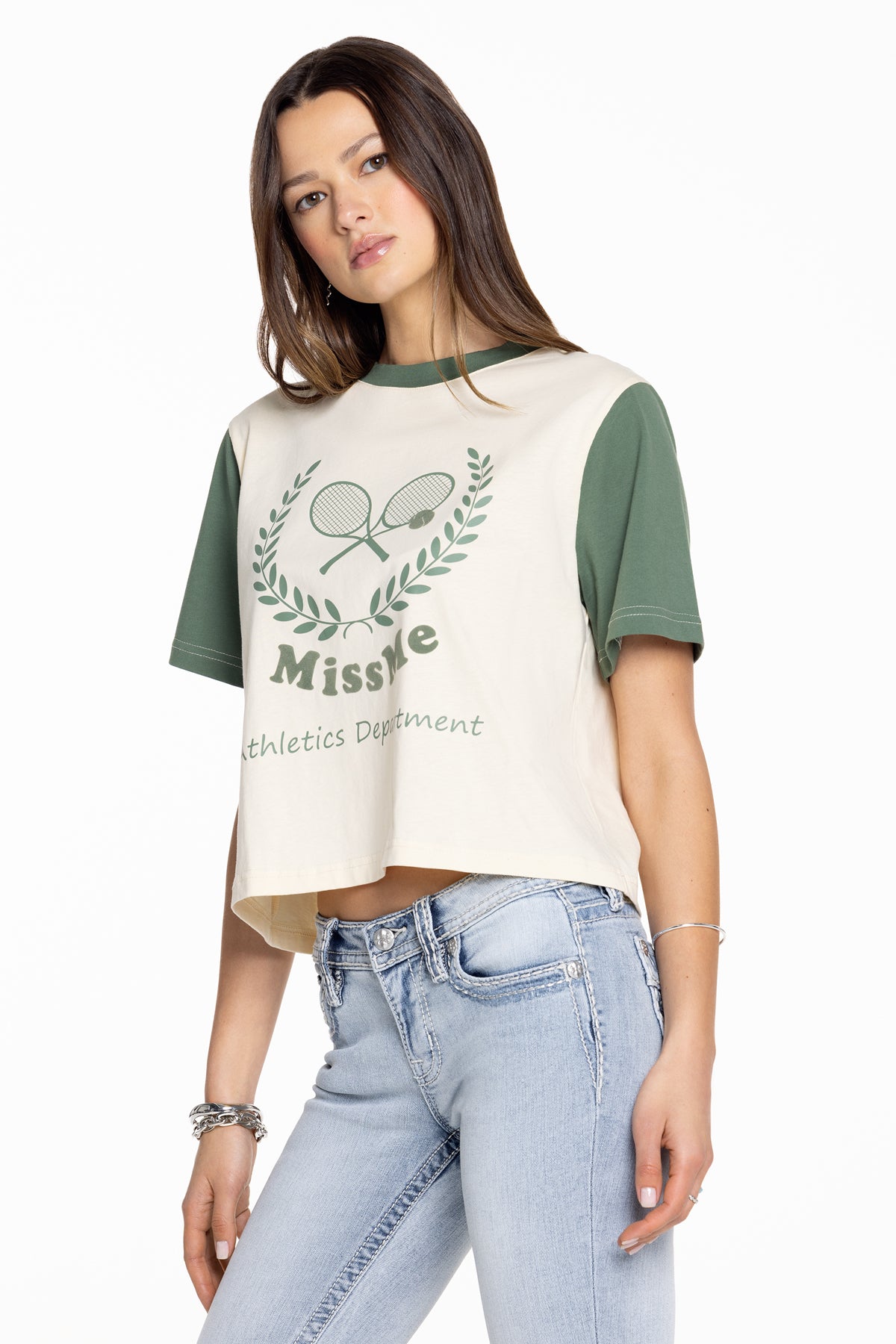 Cropped, graphic tee – Miss Me Athletics Department graphic design – Contrast sleeves and collar – Round neckline Model is wearing size: S Model Measurements: Height: 5’9.5″ Bust: 34″ Waist: 24″ Hips: 35″ Fabric Content: Self: 100% Cotton; Contrast: 100% Cotton Care: Gentle machine wash inside-out with like colors in cold water. Tumble dry low. Style No. BMT0020S-OLIVE GRN