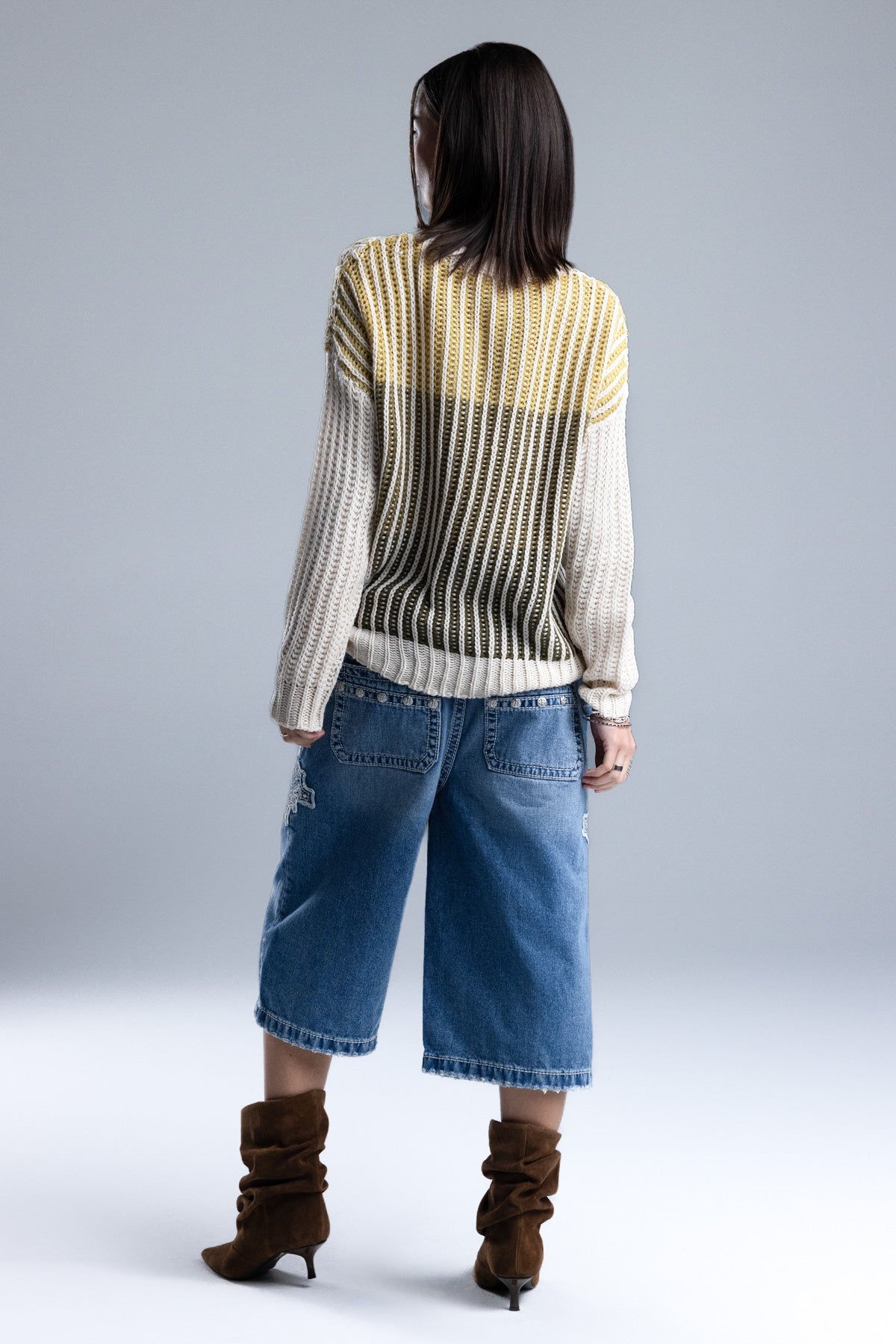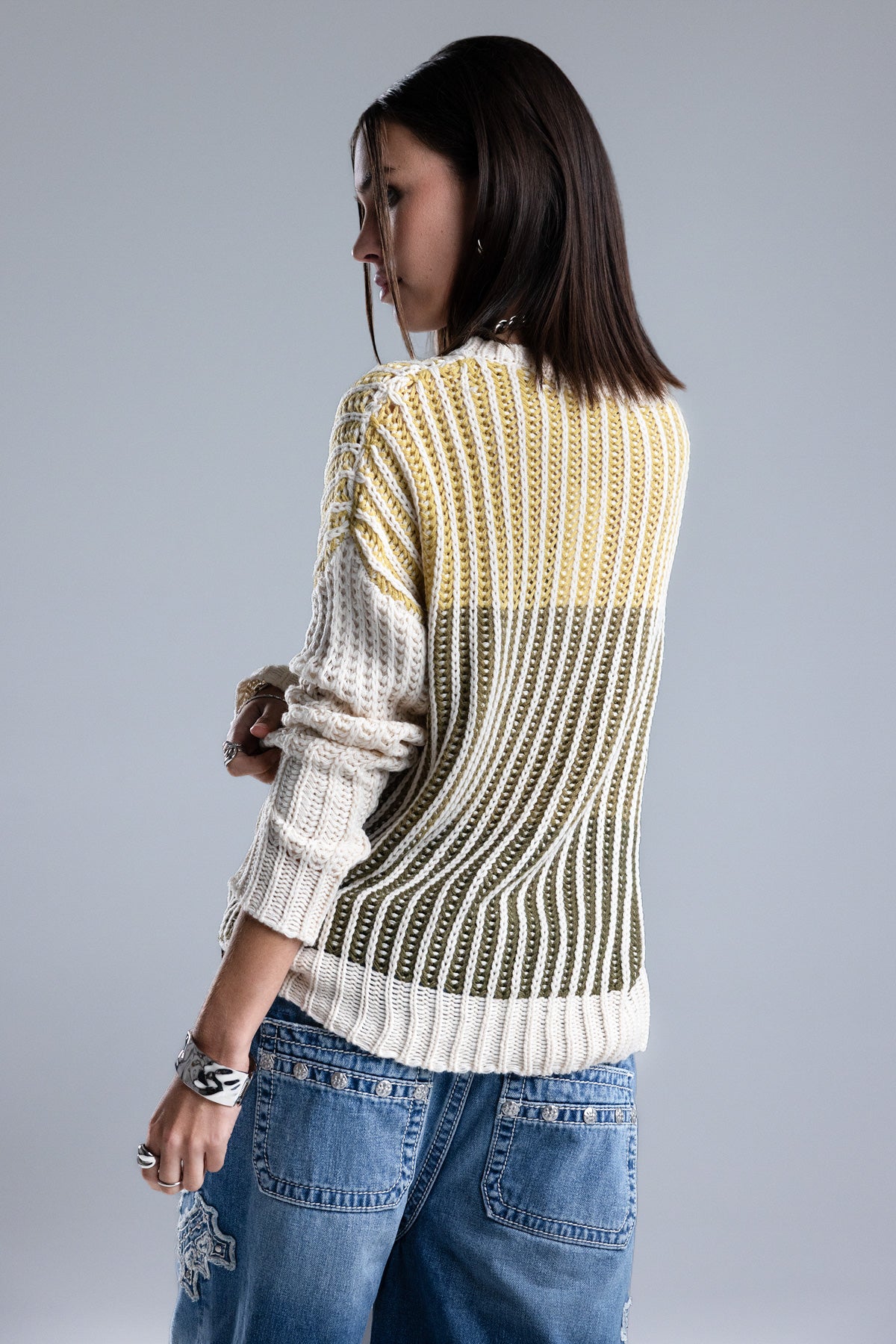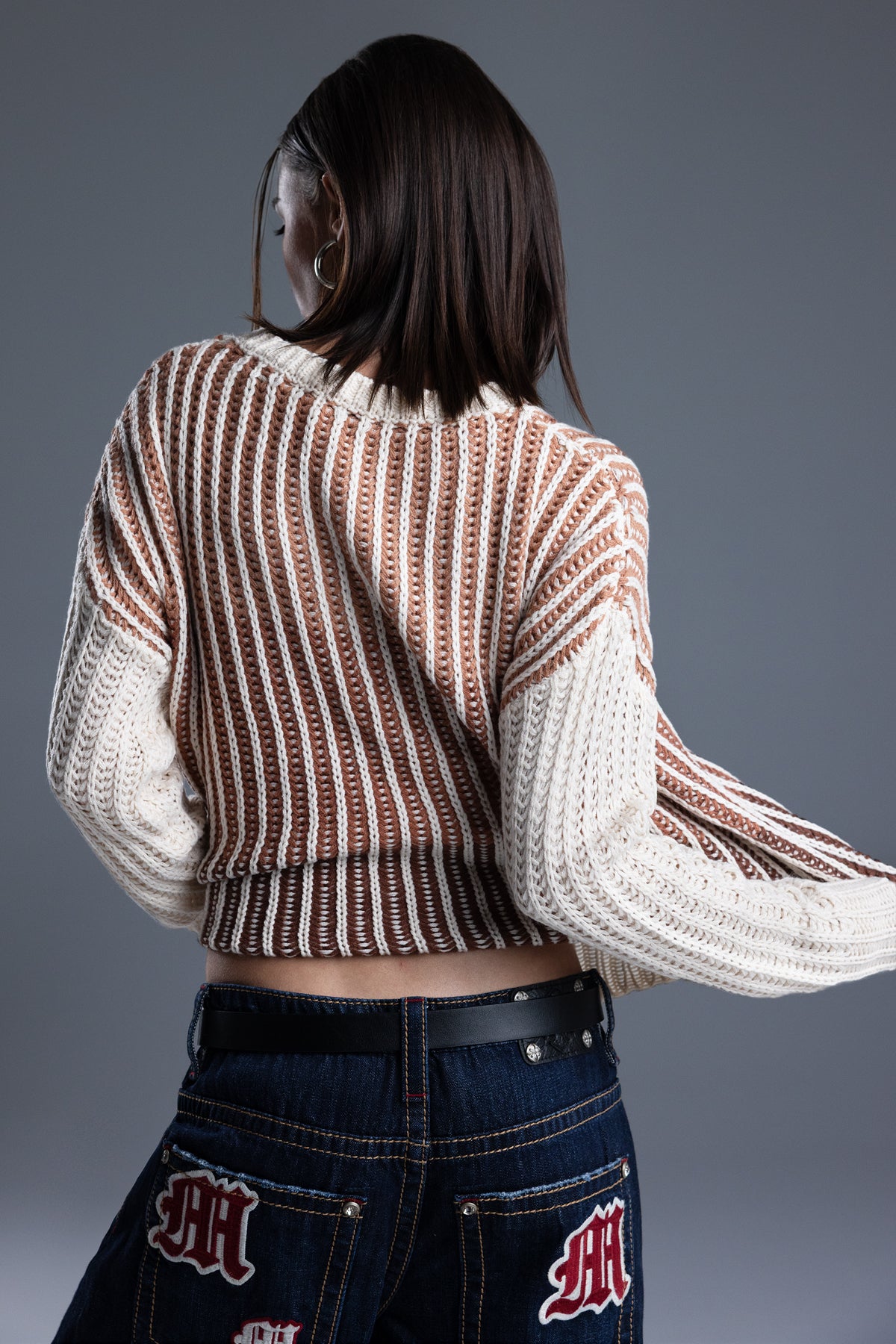 Crocheted crewneck sweater – Open-knit striped pattern – Gradient color block design – Crew neckline – Ribbed trim accents – Relaxed fit with dropped shoulders Style No. MSW0475L-CHOCO BRN, MSW0475L-OLIVE GRN