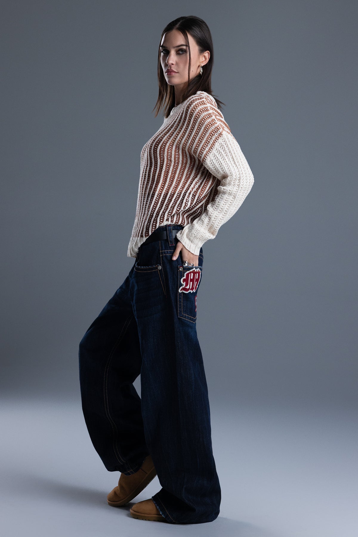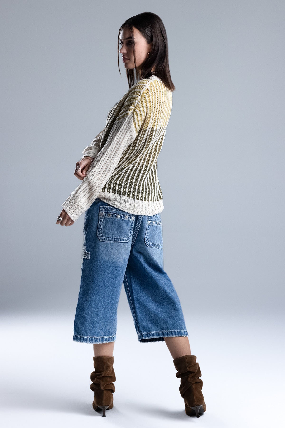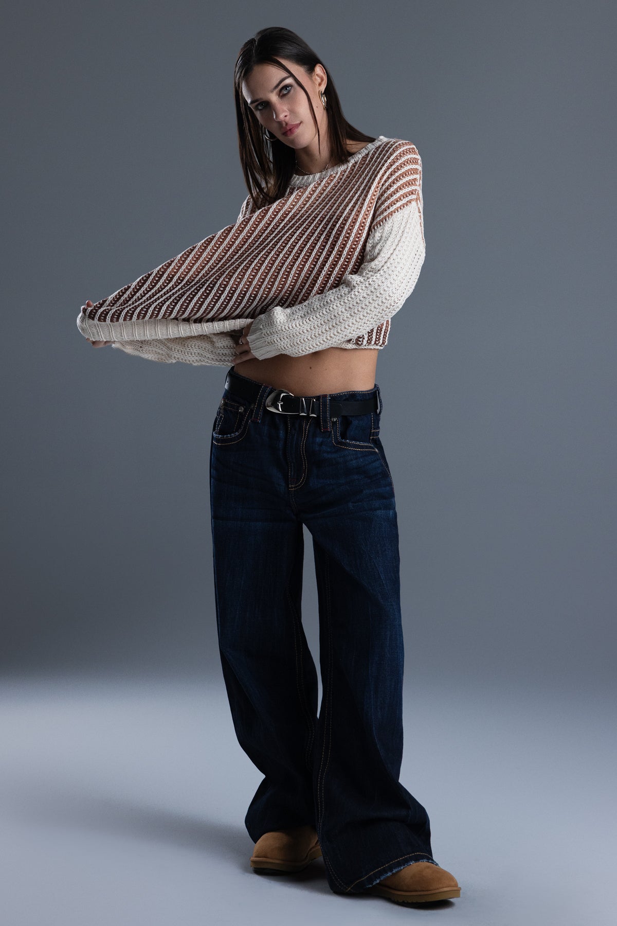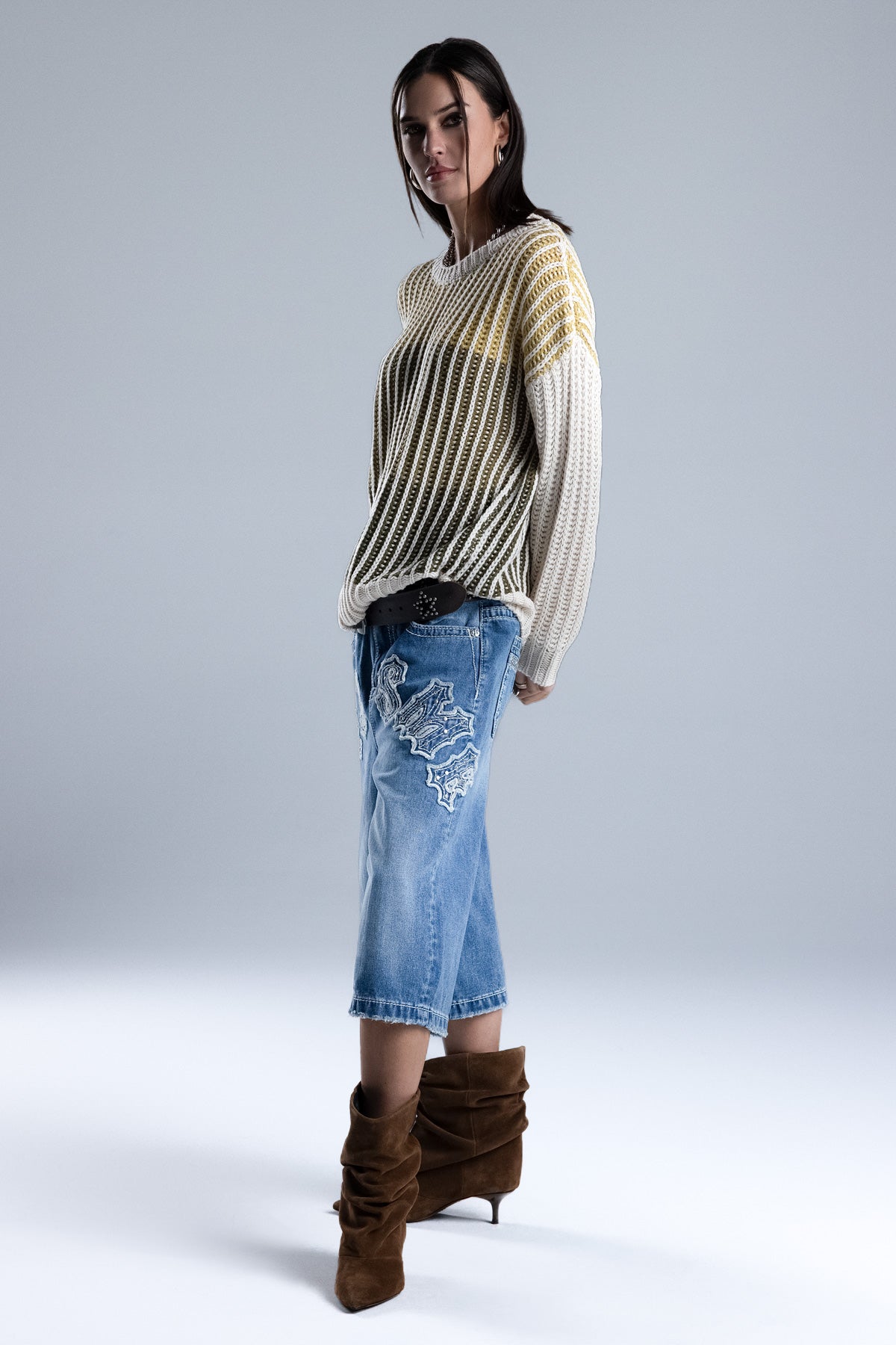 Crocheted crewneck sweater – Open-knit striped pattern – Gradient color block design – Crew neckline – Ribbed trim accents – Relaxed fit with dropped shoulders Style No. MSW0475L-CHOCO BRN, MSW0475L-OLIVE GRN