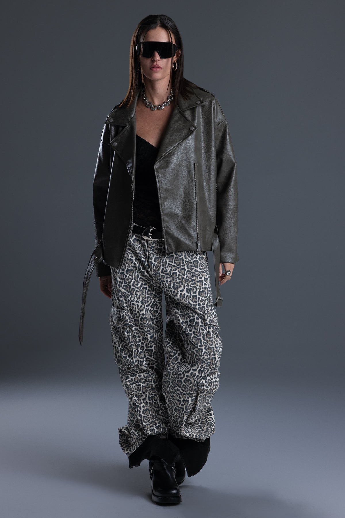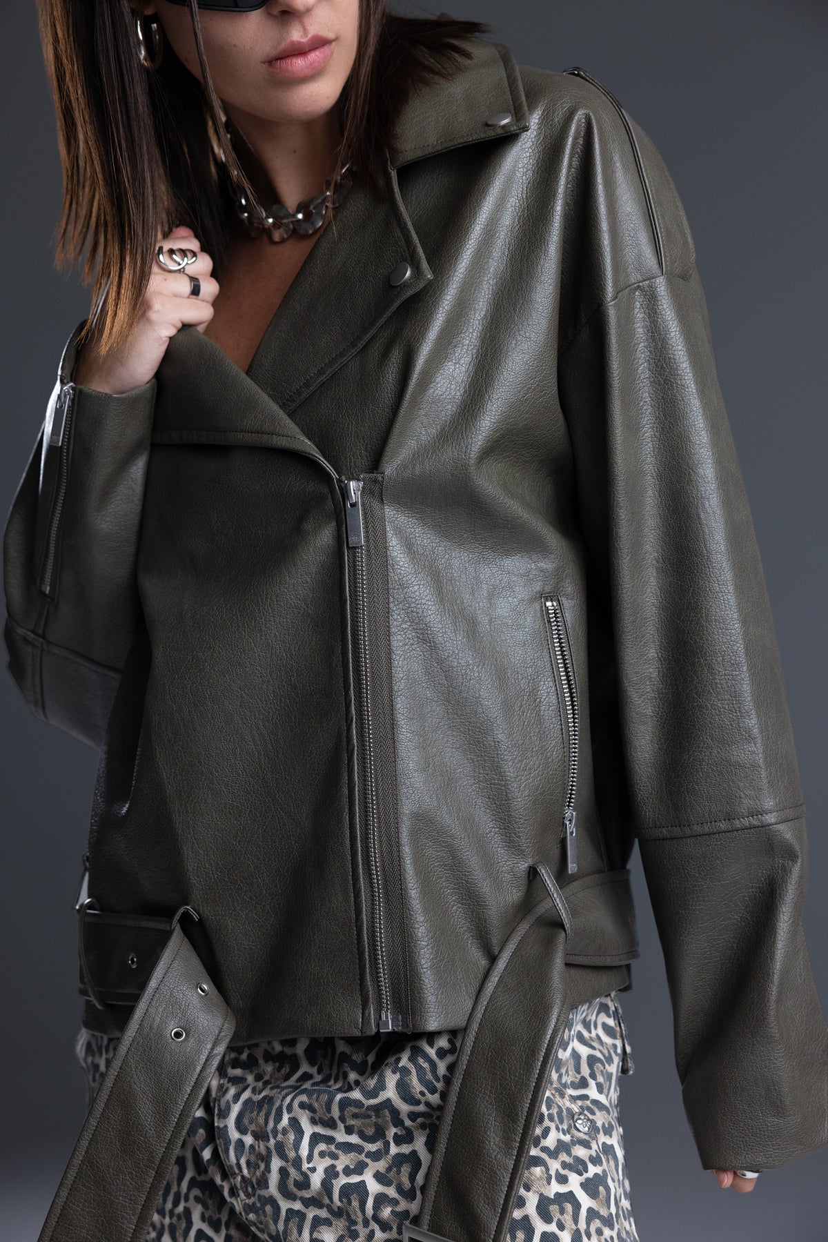 Oversized faux leather moto jacket – Snap-down lapel collar – Asymmetric front-zip design – Functional side zip pockets – Zippered sleeve vents – Paneled construction with adjustable belt – Smooth satin lining Model is wearing size: 25 Model Measurements: Height: 5????Bust: 32A Waist: 24??Hips: 34??Fabric Content: Self/Faux: 55% Cotton, 45% Pu / Lining: 100% Polyester Care: Gentle machine wash inside-out with like colors in cold water. Tumble dry low. Style No. BMJ0806L-GREEN