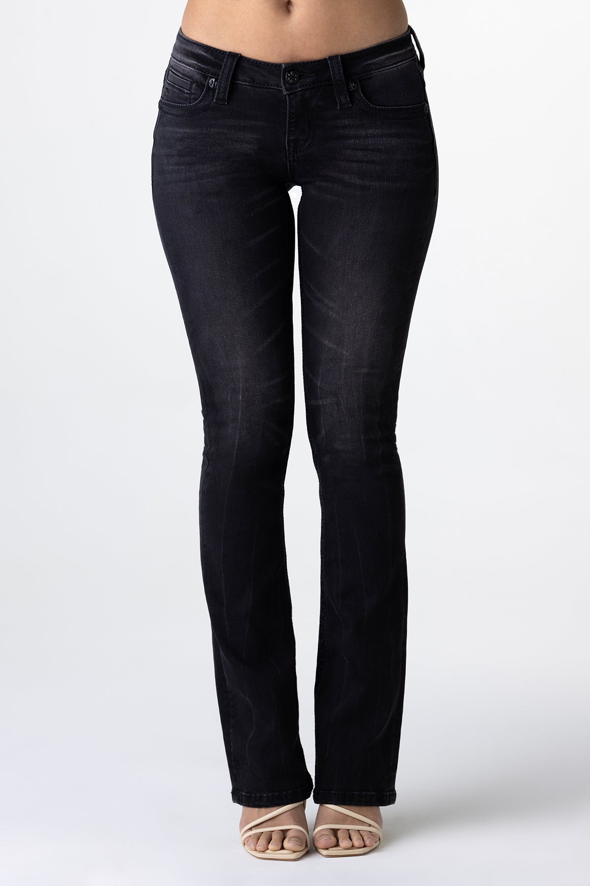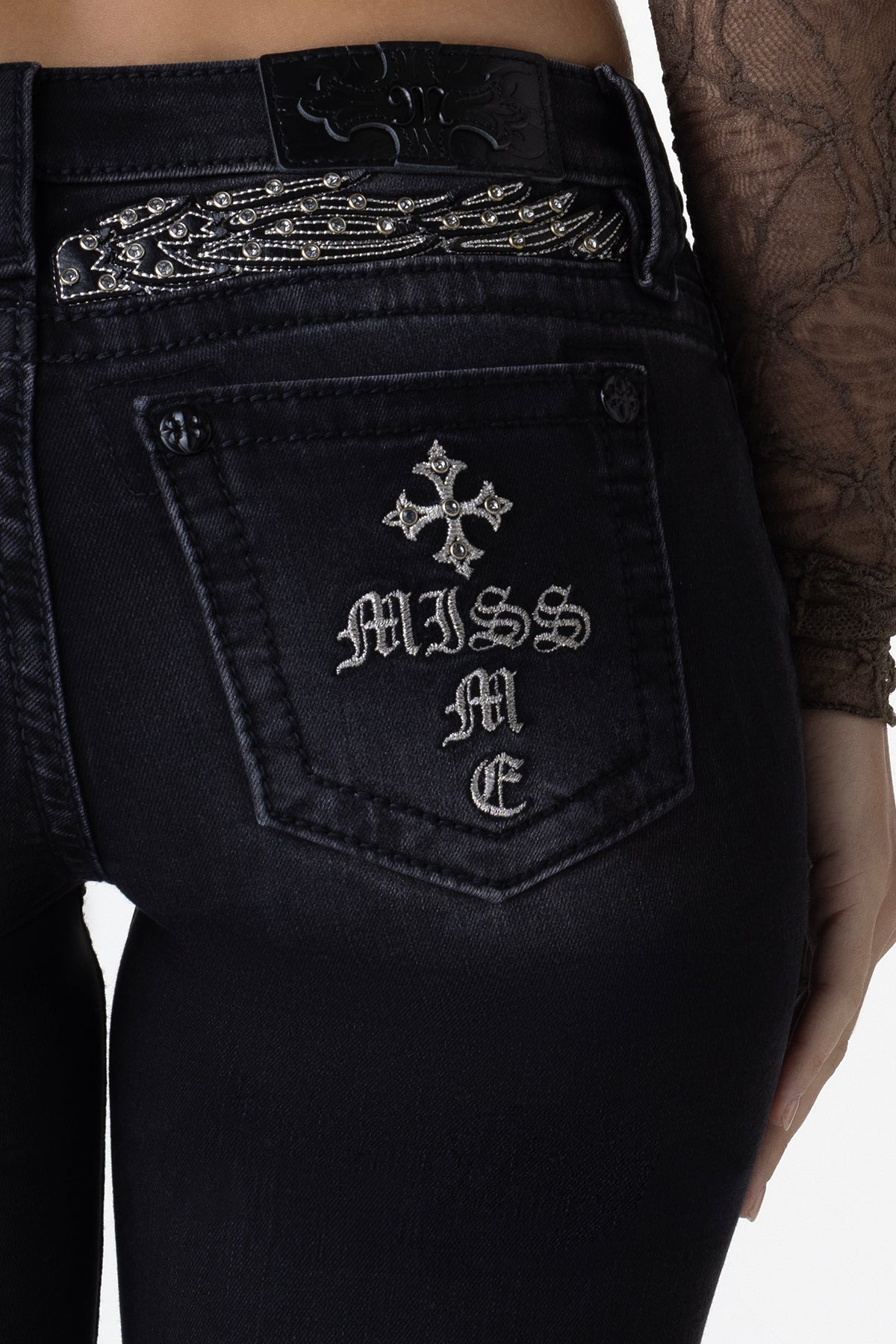 Washed, low-rise bootcut jeans – Embroidered Miss Me and cross logo on classic back pocket – Rhinestone studded leather appliqué winged yoke design – Embossed black leather cross Miss Me brand patch – Whiskering details – 5-pocket design Style No. L9469BL-B043, L9469BV-B043, L9469BS-B043