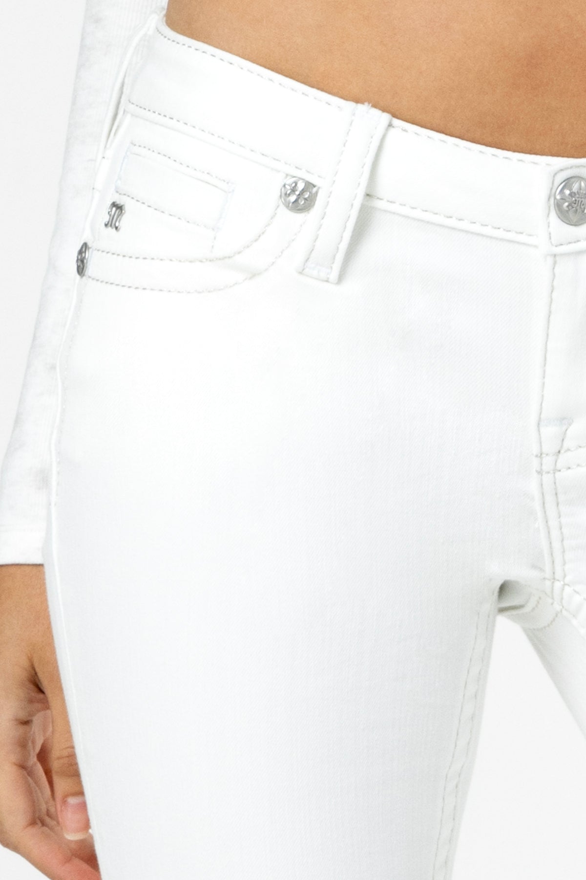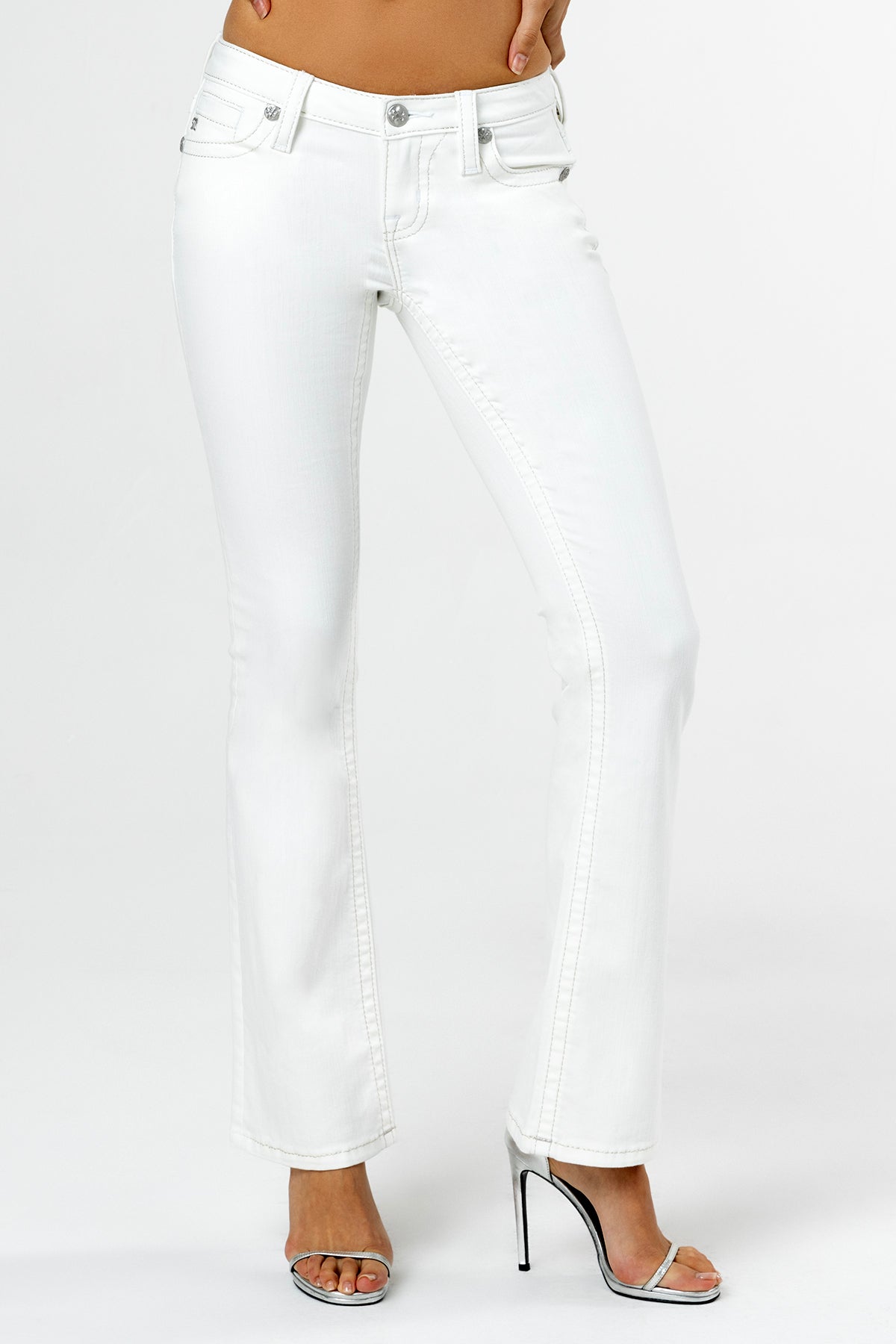 Low-rise bootcut jeans – Embroidered Miss Me and cross logo on classic back pocket – Rhinestone leather appliqué winged yoke design – Embossed white leather cross Miss Me brand patch – 5-pocket design Style No. L9469B2L-W01, L9469B2V-W01, L9469B2S-W01