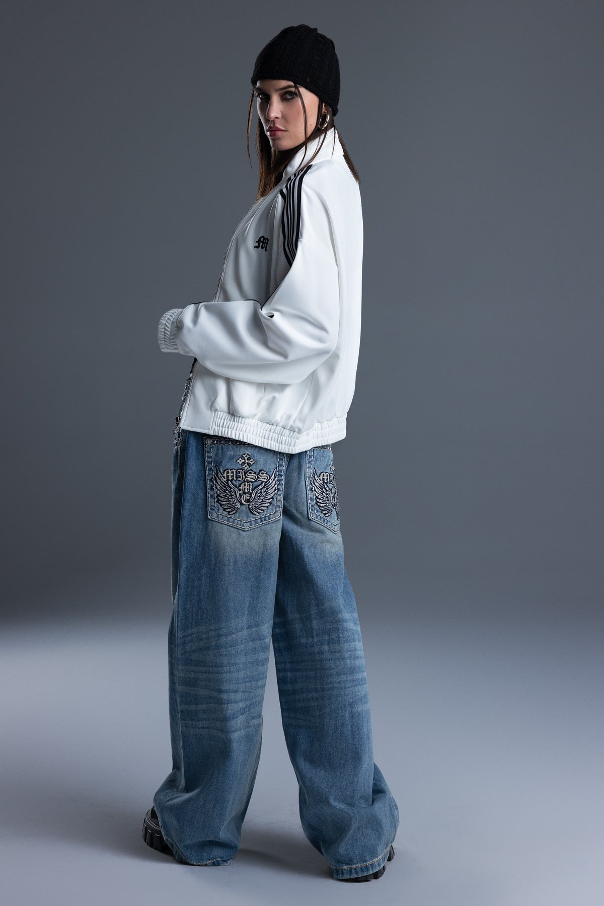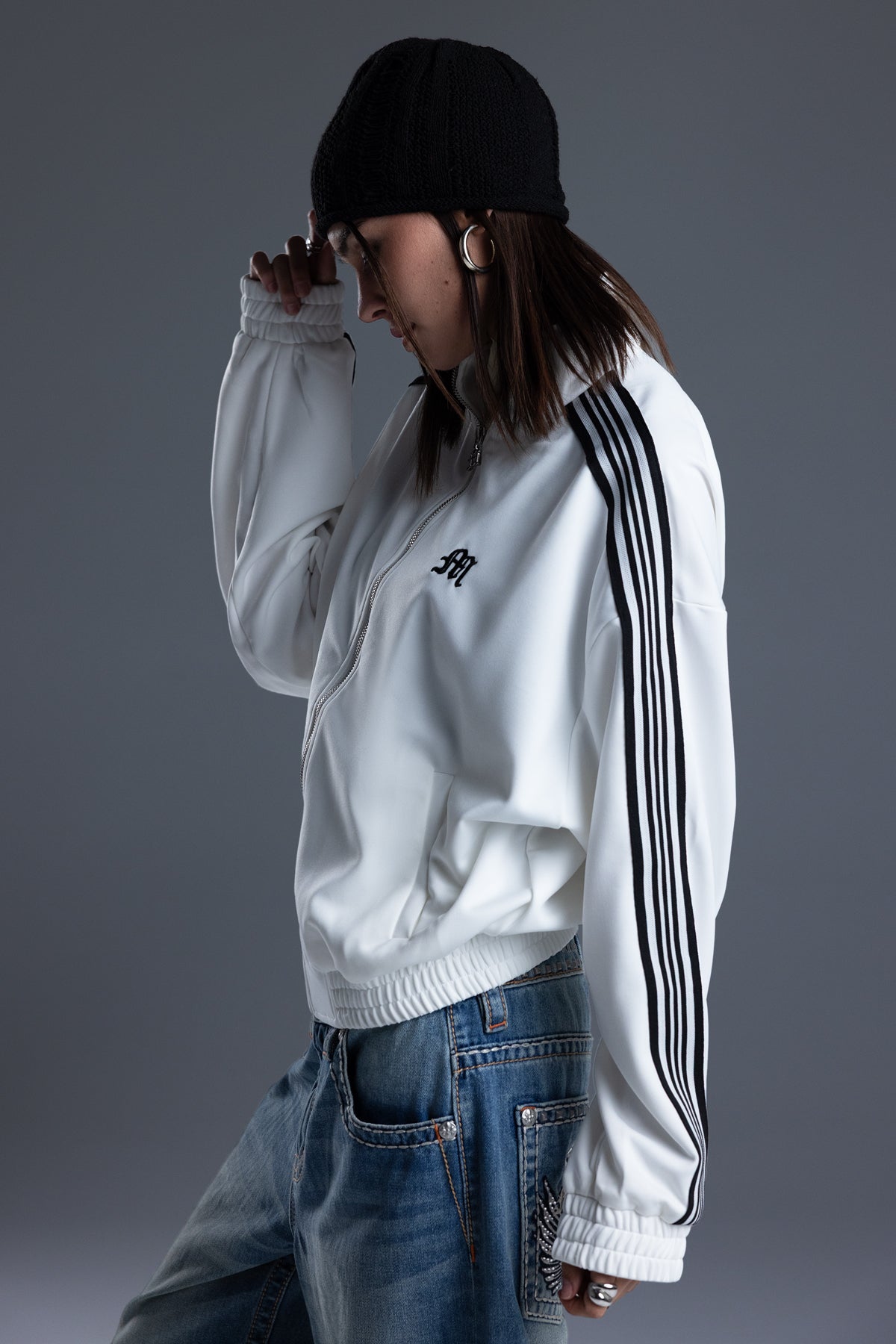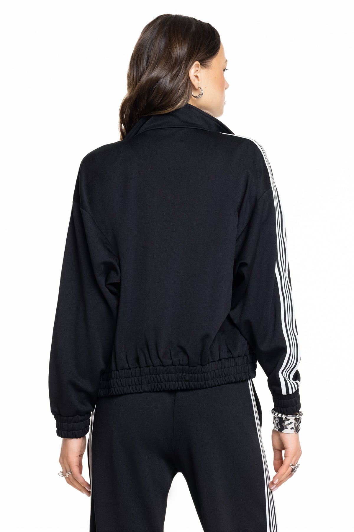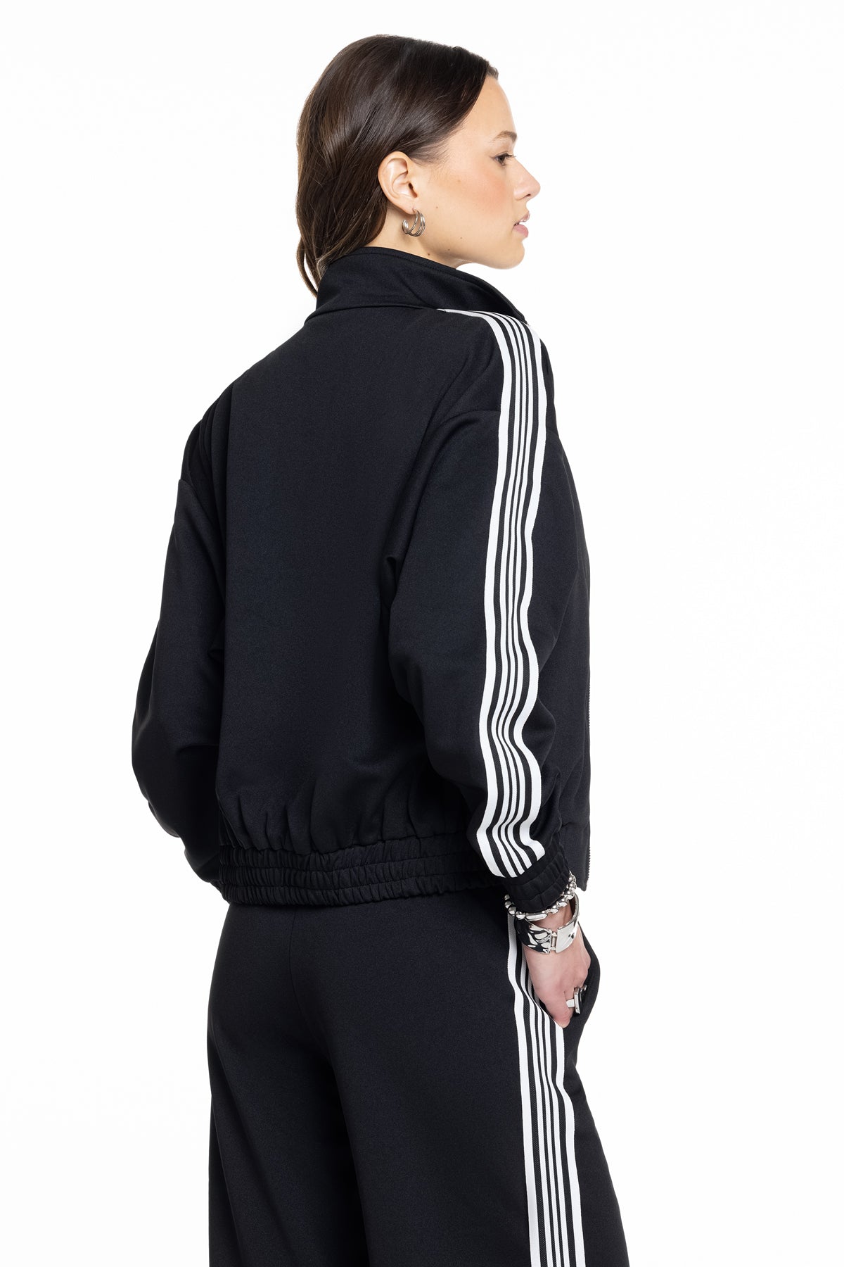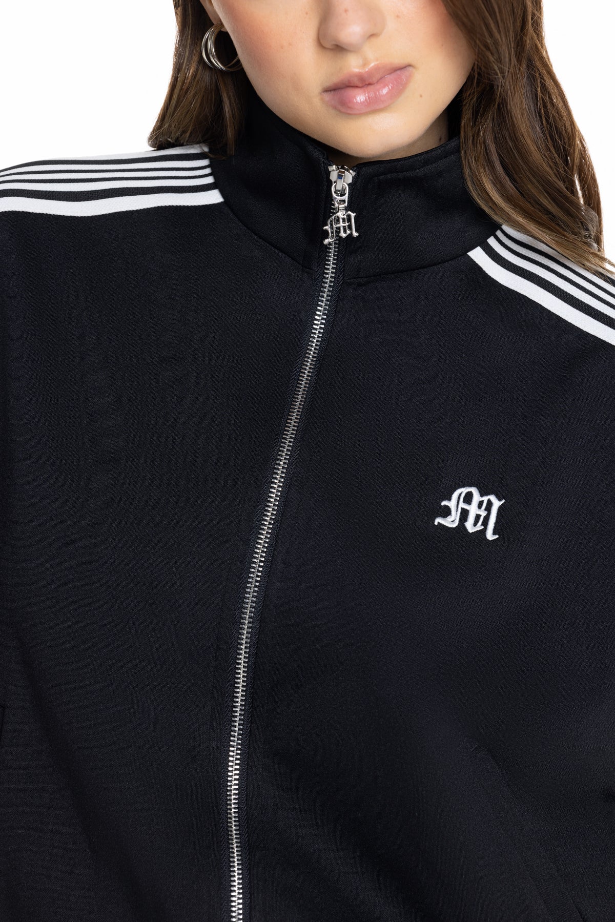 Long-sleeve track jacket – Contrast stripe sleeves – Gothic Miss Me branding – High-neck collar – Ribbed cuffs and hem – Zip-up front with logo pull tab Model is wearing size: S Model Measurements: Model is wearing size: S Black Model Measurements: Height: 5??.5??Bust: 34??Waist: 24??Hips:35 Model is wearing size: S White Model Measurements: Height: 5????Bust: 32A Waist: 24??Hips: 34??Fabric Content: Self: 100% Polyester; Trim: 100% Polyester Care: Gentle machine wash inside-out with like colors in cold water. Tumble dry low. Style No. MJ0780L-WHITE, MJ0780L-BLACK