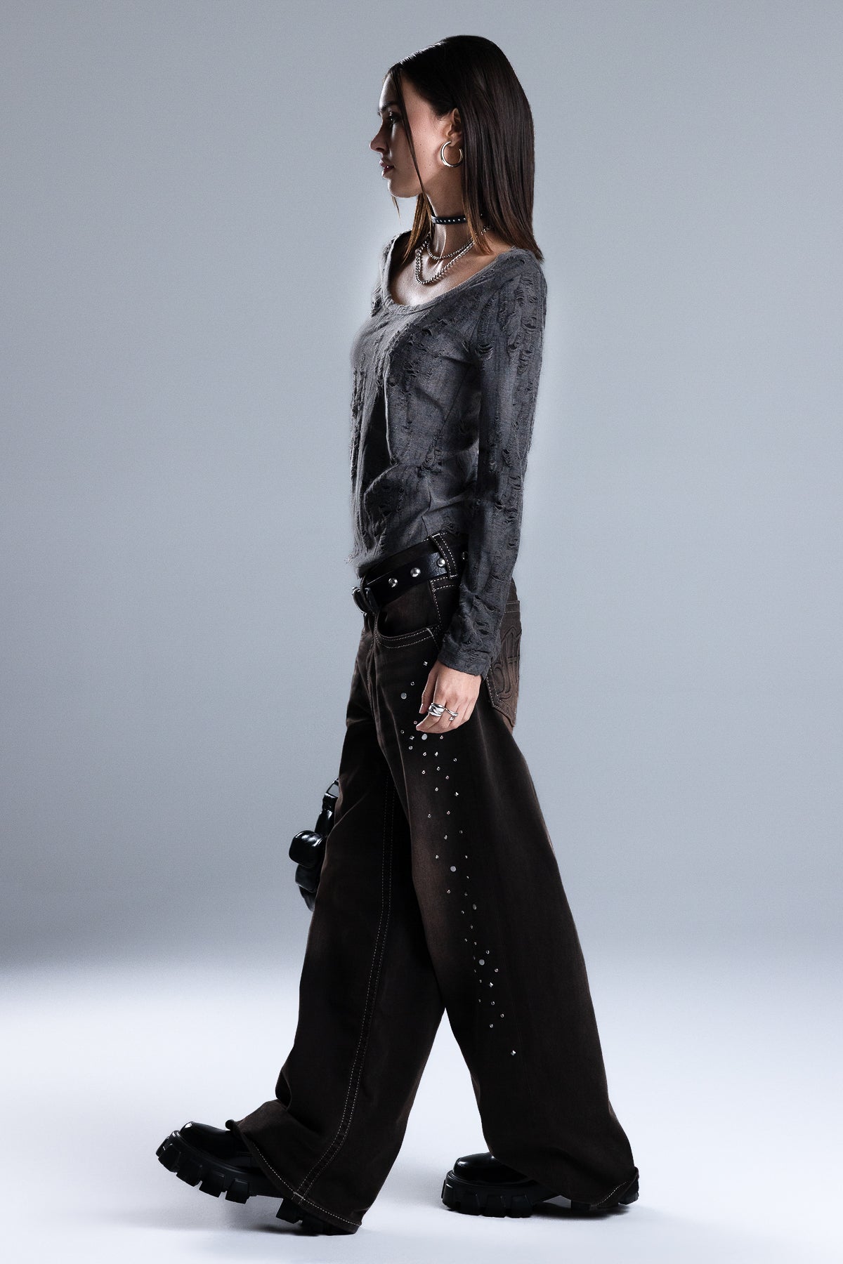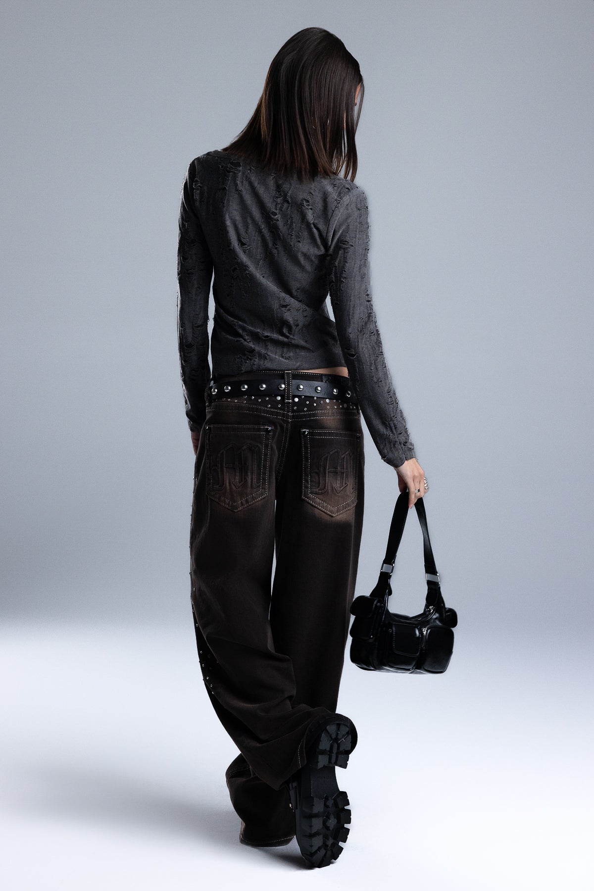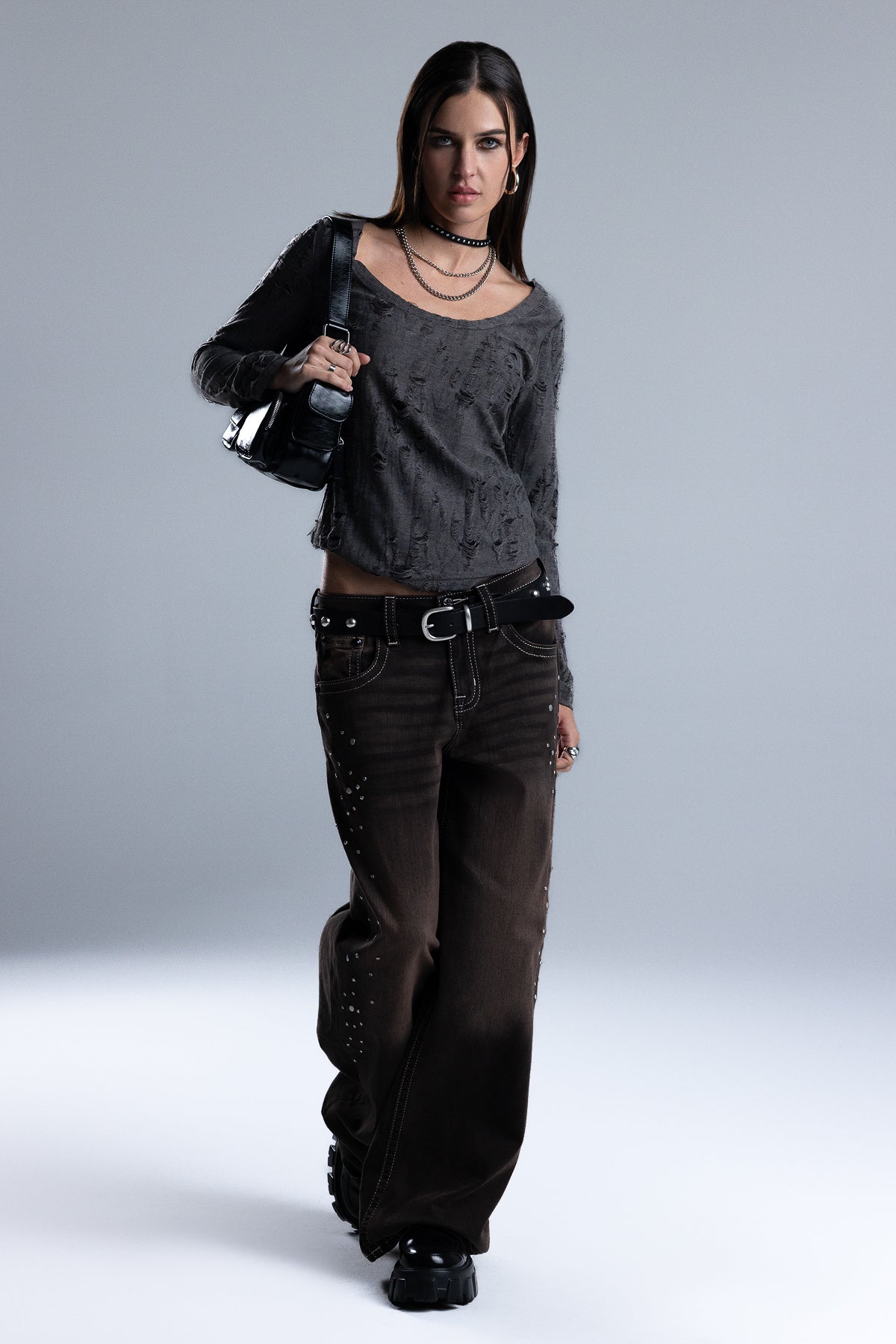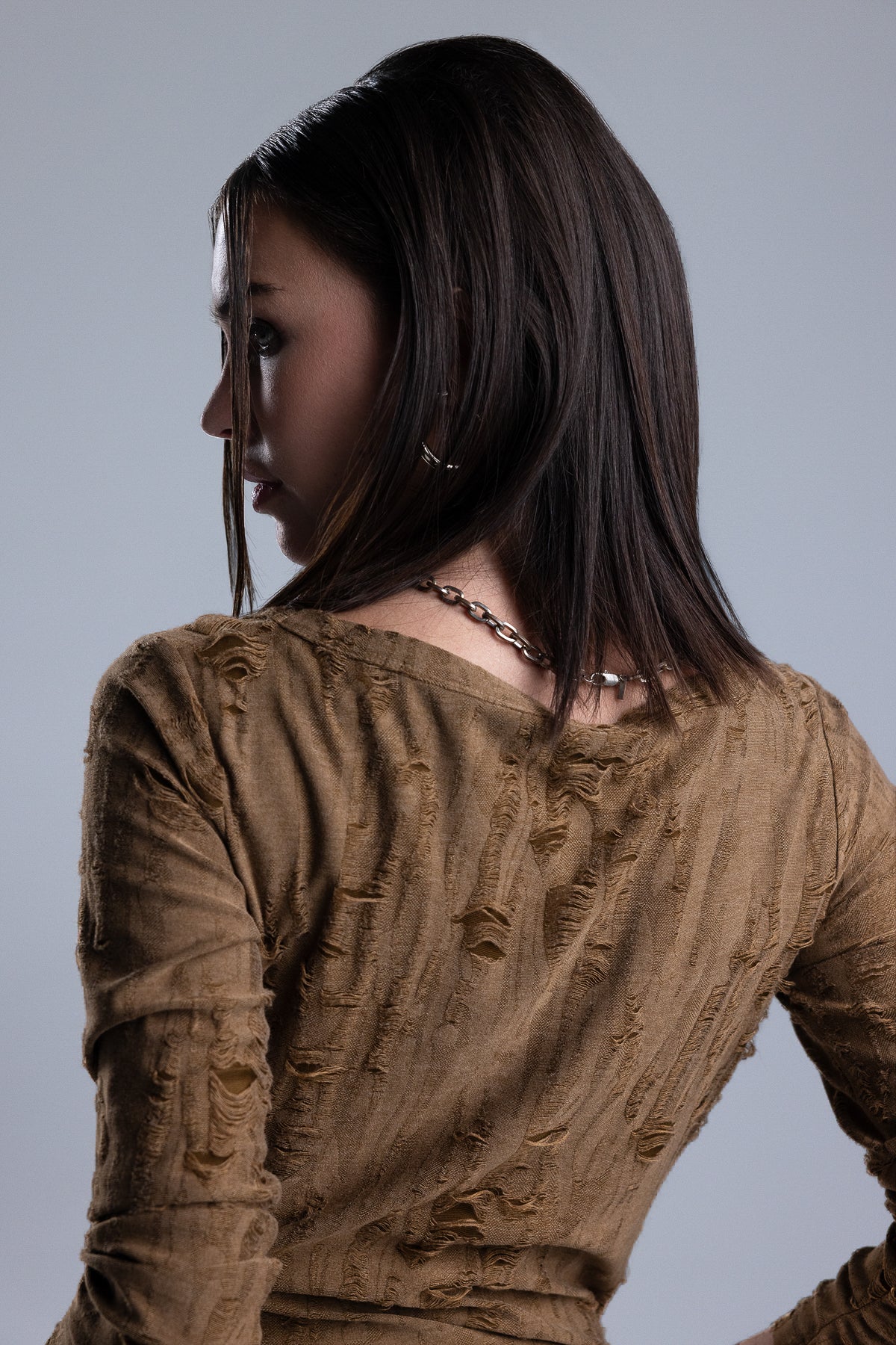 Fitted long-sleeve top – Soft stretch knit construction – Heavy distressed texturing – Subtle curved hem – Wide scoop neckline Style No. BMT0106L-BLACK, BMT0106L-CAMEL BRN