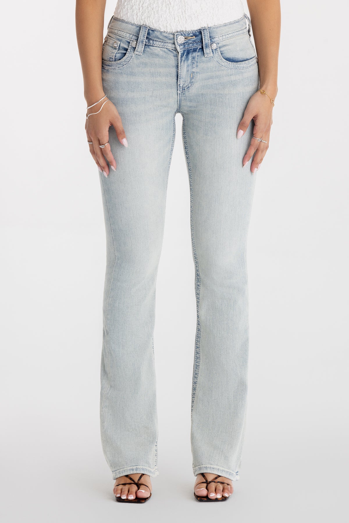 Washed, mid-rise bootcut jeans – Embroidered, leather appliqué gothic “M” design – Chevron stitched accents with rhinestone rivets – Embossed white studded leather cross Miss Me brand patch – Subtle whiskering highlights – 5-pocket design Model is wearing size: 25 Model Measurements: Height: 5’9″ Bust: 34B Waist: 25″ Hips: 36″ Fabric Content: 99% Cotton, 1% Elastane Care: Gentle machine wash inside-out with like colors in cold water. Tumble dry low. Style No. M9479BL-L327, M9479BS-L327, M9479BV-L327