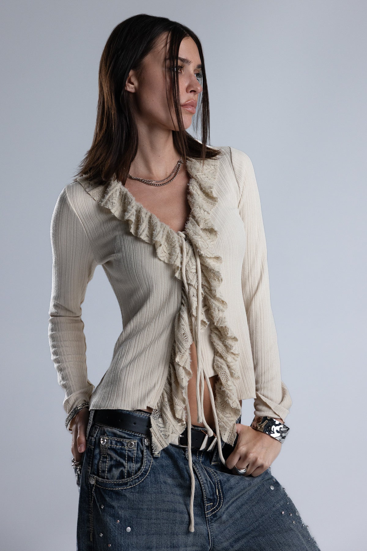 Ribbed long sleeve ruffle top – Pointelle lace trim – Layered ruffle accents – Knit hoop-and-latch button closure – Dual tie-front bow detailing – Soft V-neckline Style No. MT3235L-BEIGE, MT3235L-RUSSET RED