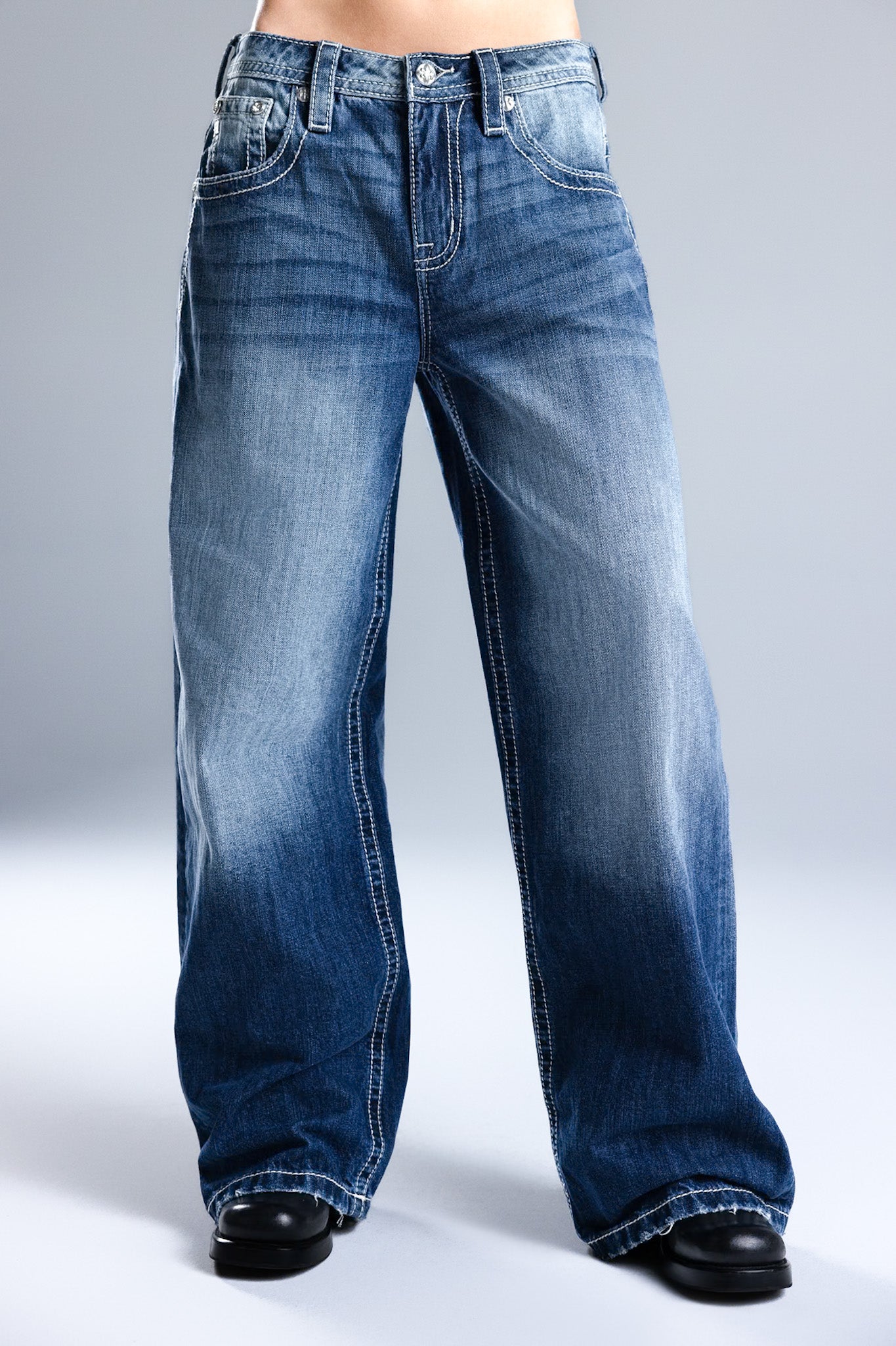 Gradient-washed finish, low to mid-rise baggy wide jeans – Embroidered leather appliqué winged crest design – Stitched rose, script, and star detailing – Rhinestone rivet accents – Embossed white studded leather cross Miss Me brand patch – Whiskering details – 5-pocket design Style No. 9650BWS-M1110, 9650BWV-M1110