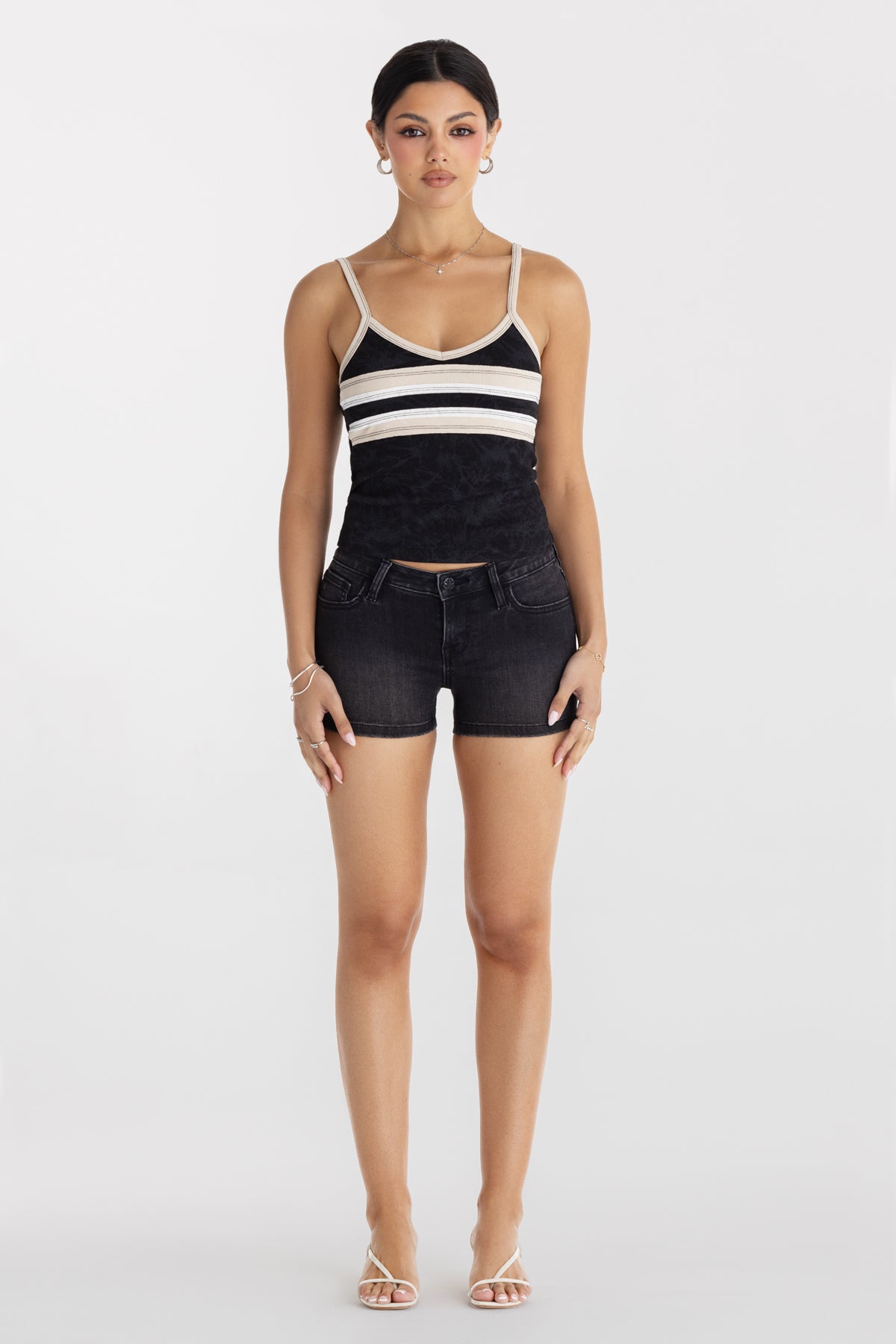 Washed, mid-rise denim shorts – Embroidered mini gothic Miss Me logo – Traditional back pocket design – Tailored, clean-finished hems – 5-pocket design Model is wearing size: 25 Model Measurements: Height: 5’9″ Bust: 34B Waist: 25″ Hips: 36″ Fabric Content: 72% Cotton, 25% RP, 3% Elastane Care: Gentle machine wash inside-out with like colors in cold water. Tumble dry low. Style No. Dark Grey: M1076H2-G24