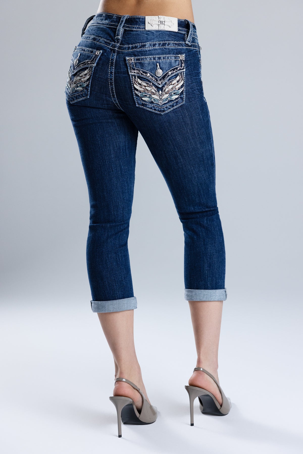 Washed finish, mid-rise capri jeans – Embroidered leather appliqué wing design – Layered decorative stitching detailing – Stud and rhinestone rivet accents – Embossed white leather cross Miss Me brand patch – Adjustable hems – Whiskering details – 5-pocket design Style No. M3080P87-D1175