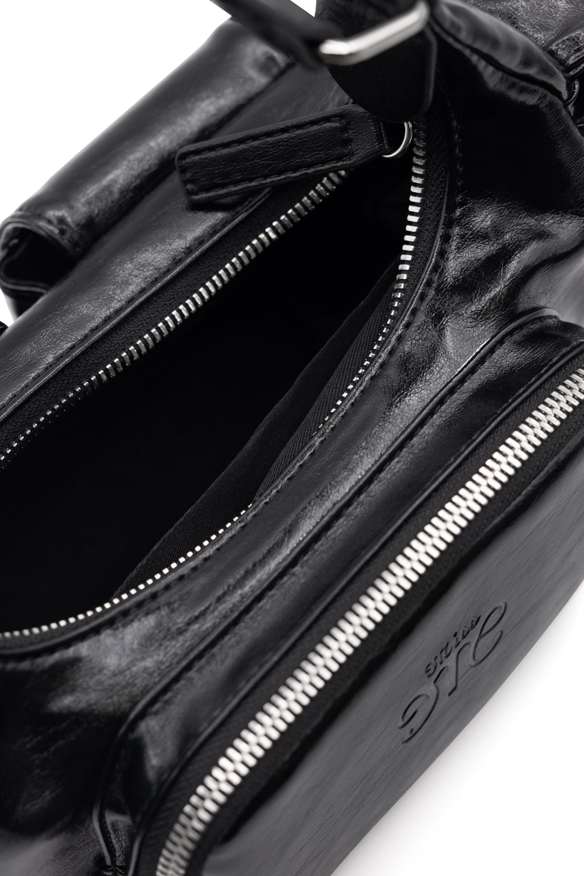 Black faux leather bag – Zip fastening – Exterior utility pockets with zipper and magnetic snap closures – Interior slit and zip pockets with Miss Me brand tag – Debossed Miss Me branding Fabric Content: Shell 100% Polyurethane; Lining 100% Polyester Care: Do not wash. Style No. BGS0114-BLACK