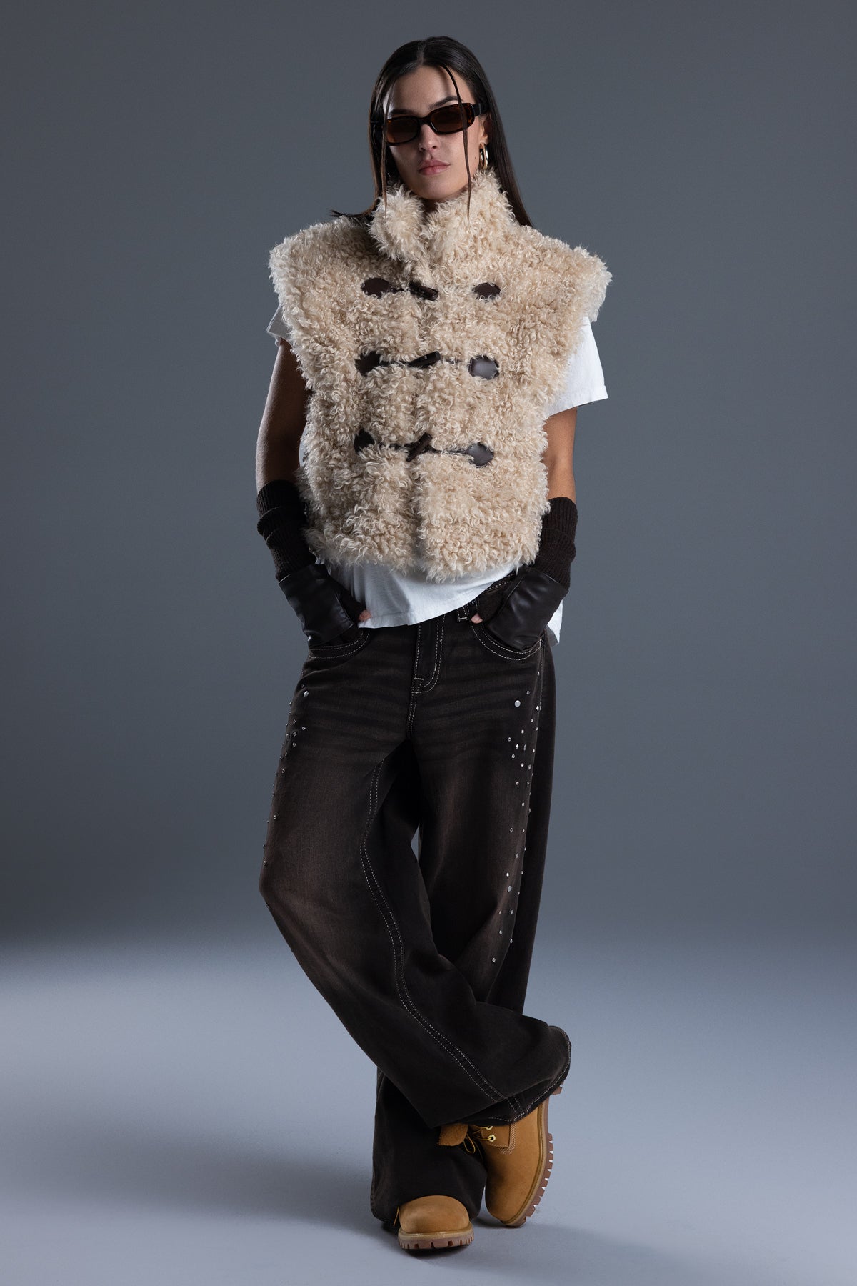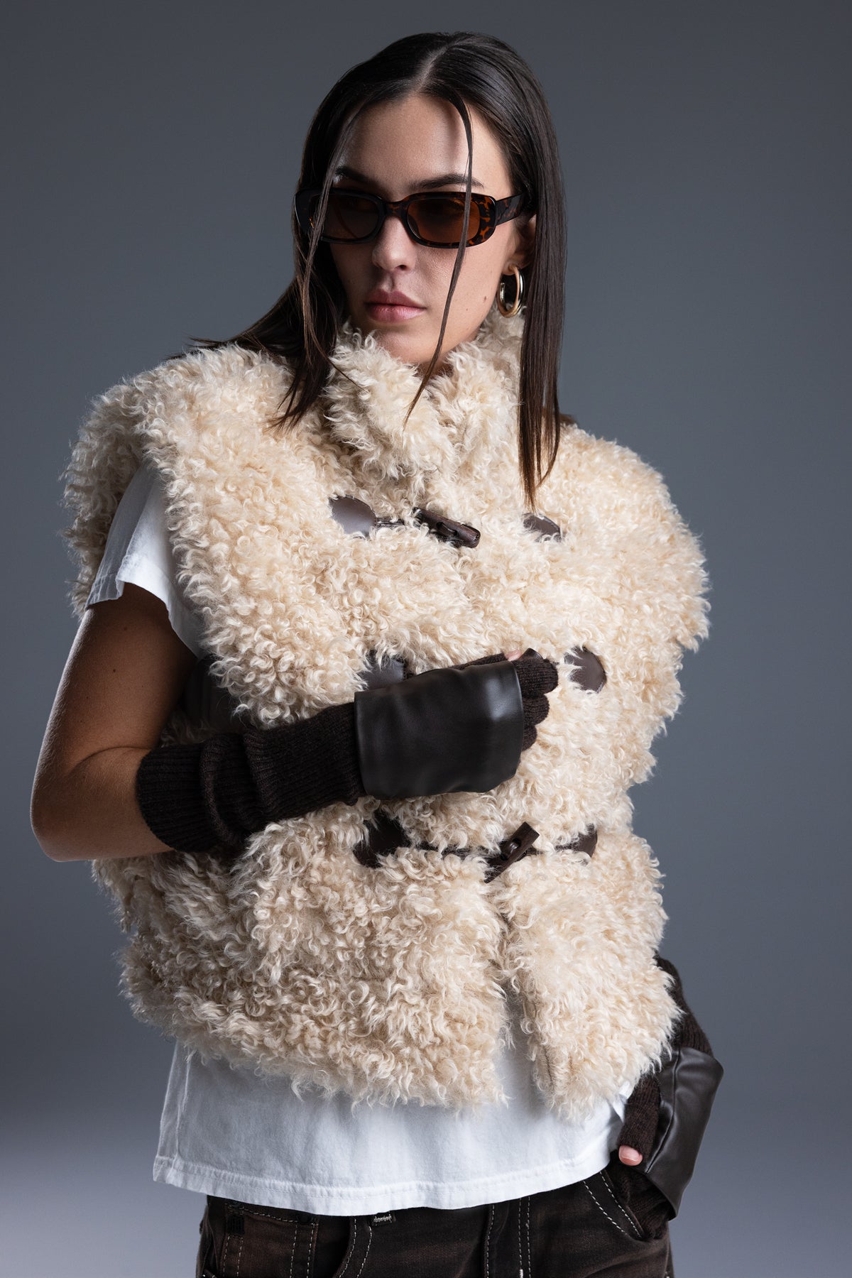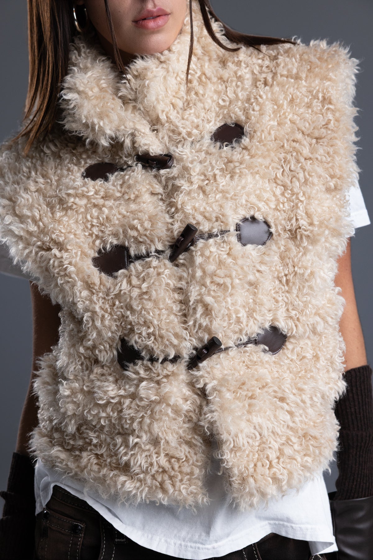 Relaxed fit, sherpa vest – Plush sherpa construction – Smooth woven lining – Leather loop-and-toggle closures – Mock neckline Model is wearing size: 25 Model Measurements: Height: 5????Bust: 32A Waist: 24??Hips: 34??Fabric Content: Self: 100% Polyester / Lining: 100% Polyester Care: Gentle machine wash inside-out with like colors in cold water. Tumble dry low. Style No. MJ0856T-BEIGE