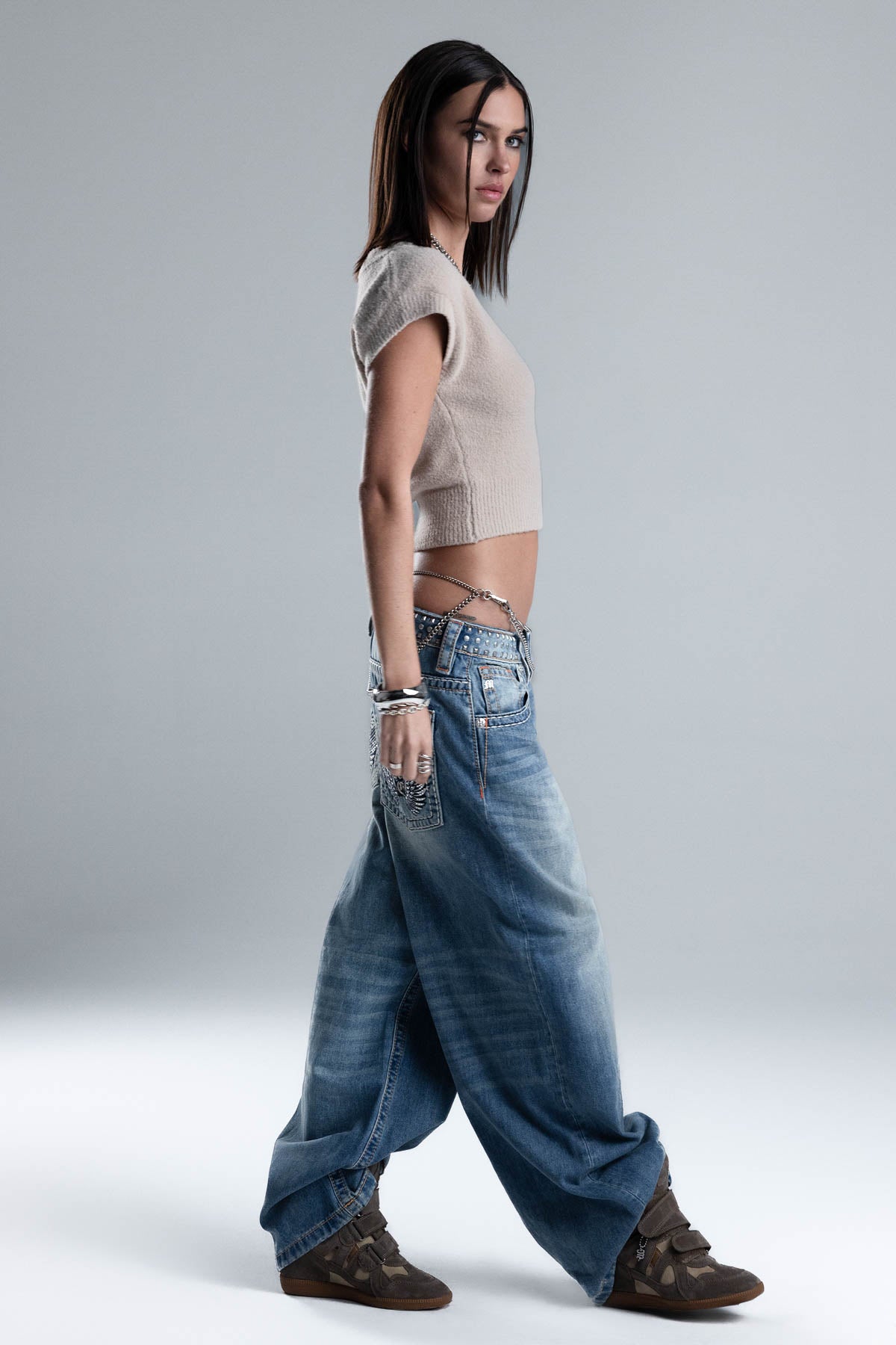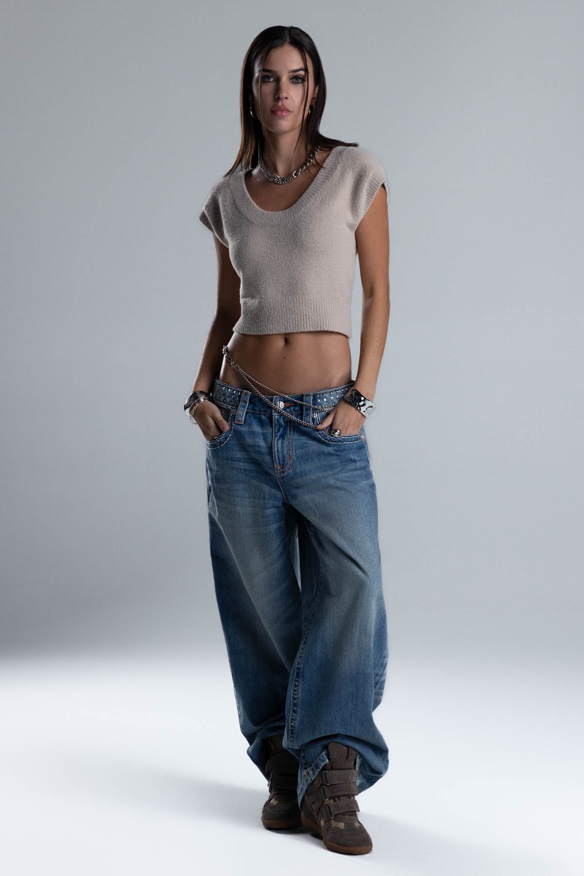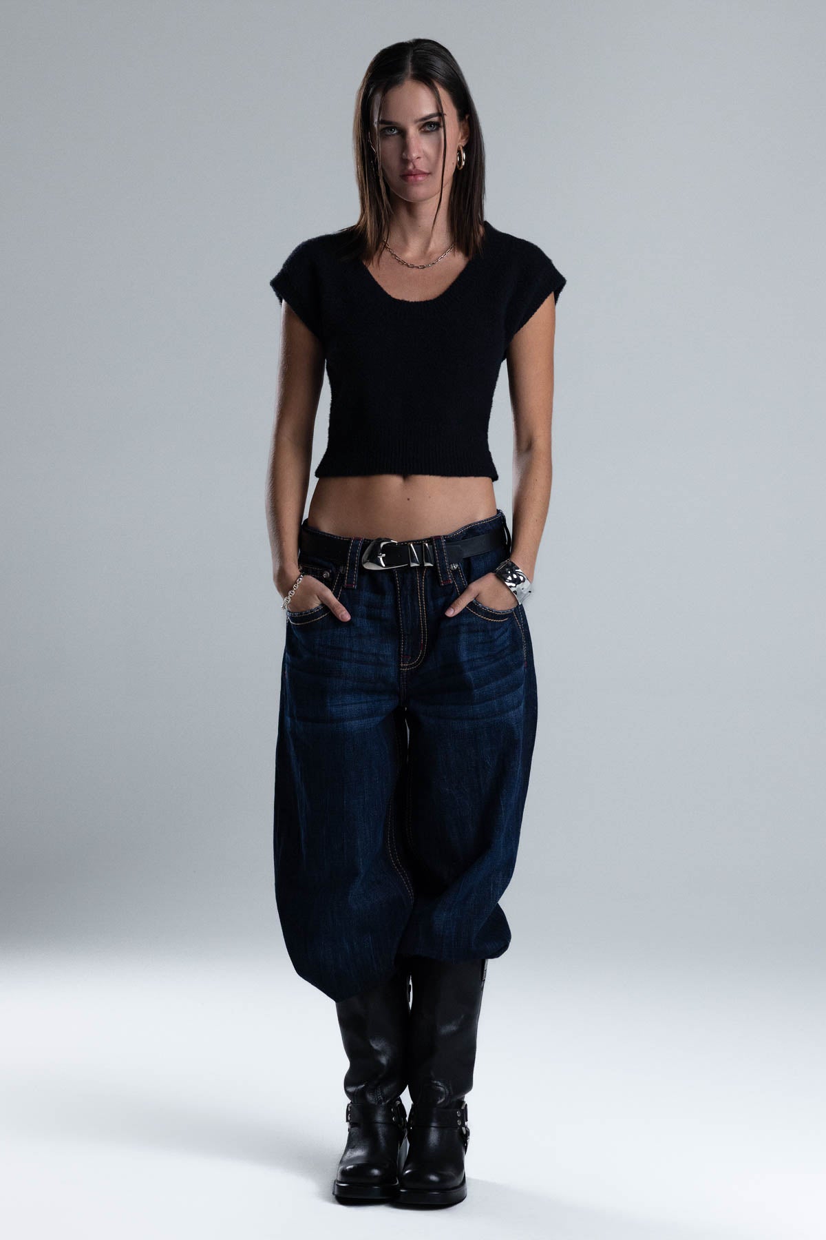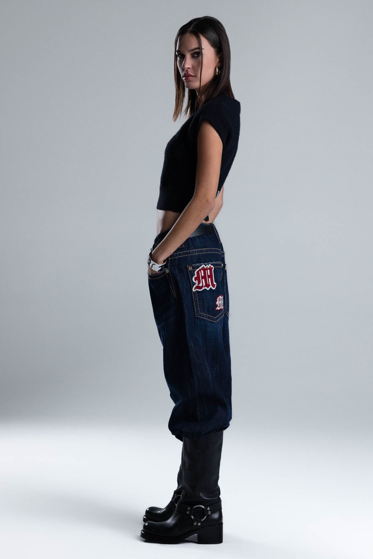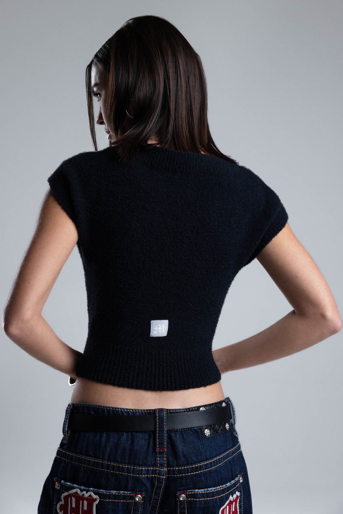 Fitted, cap-sleeve knit top – Soft, fuzzy knit construction – Ribbed trims and hem – Gothic Miss Me logo patch – Scoop neckline Style No. BMT0082T-BEIGE, BMT0082T-BLACK