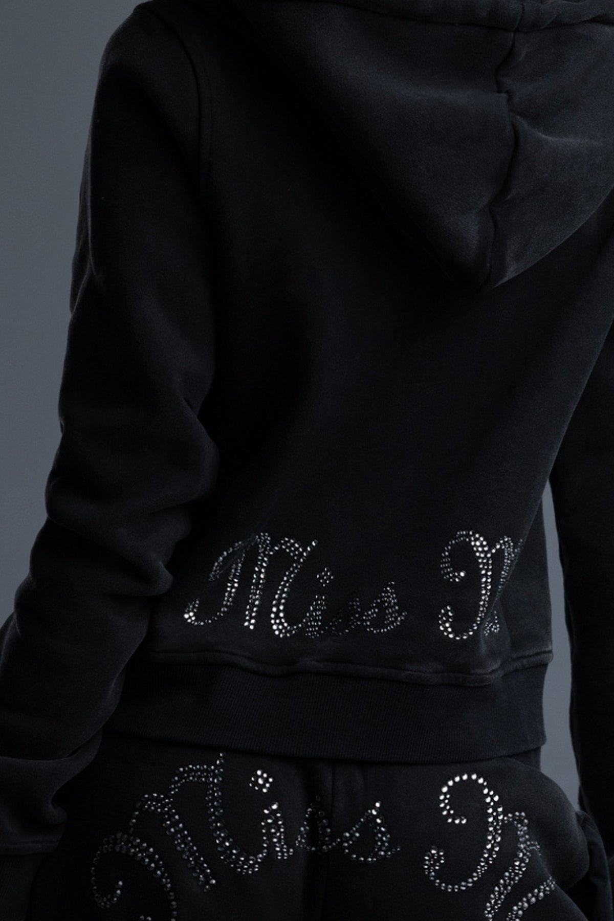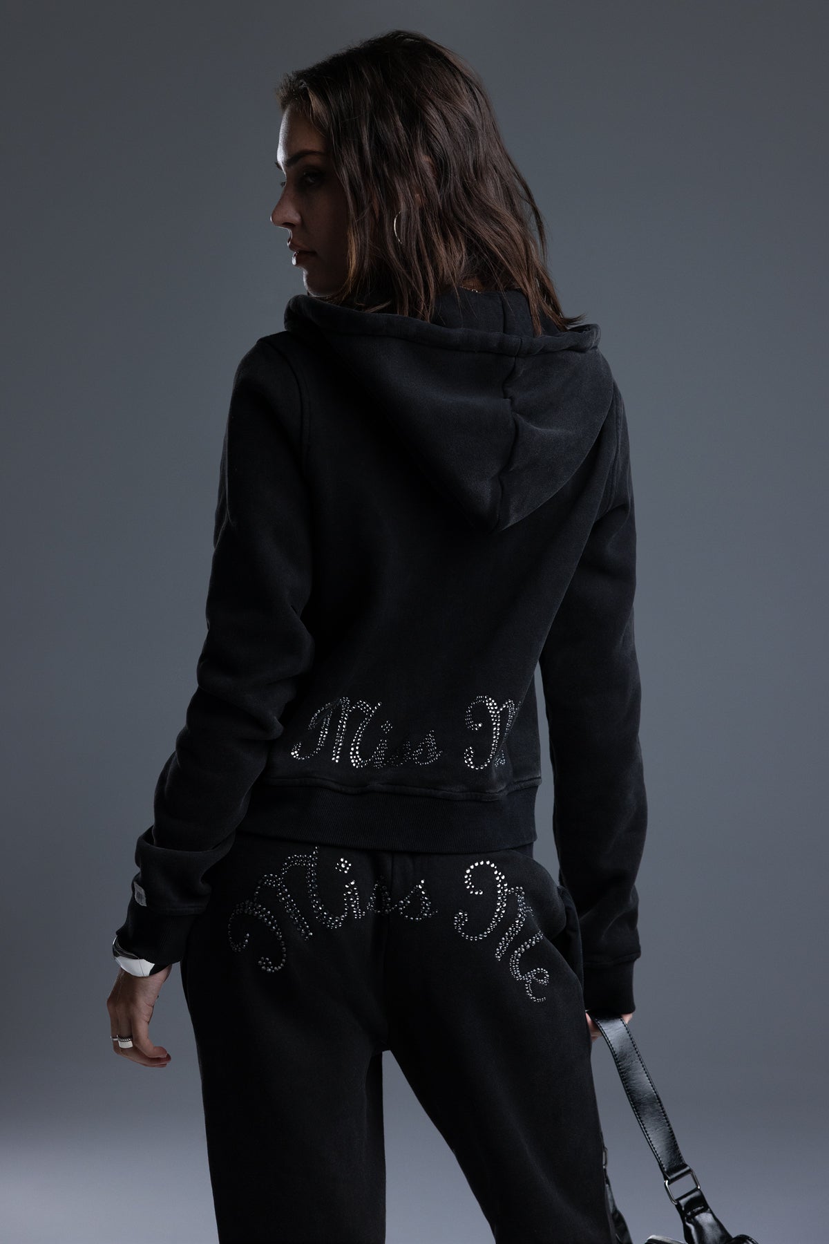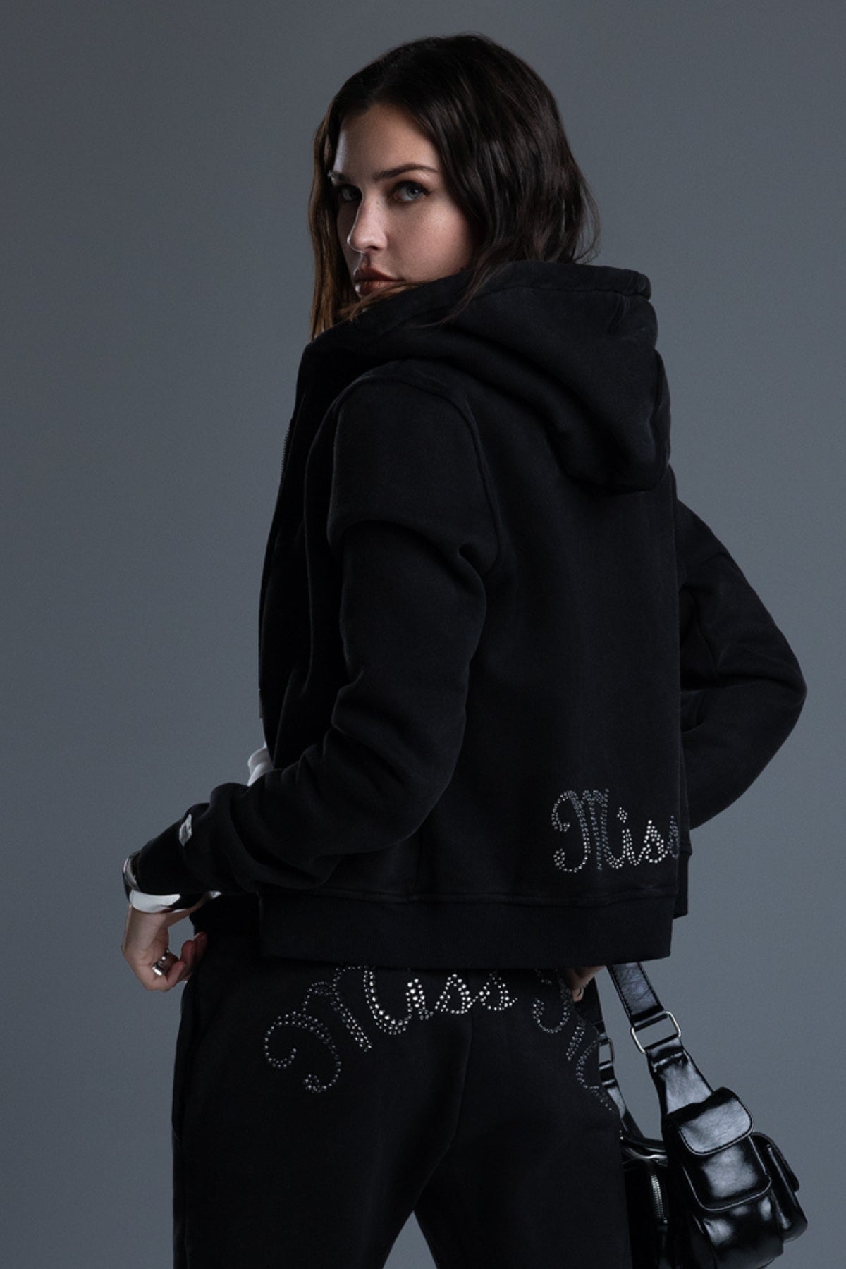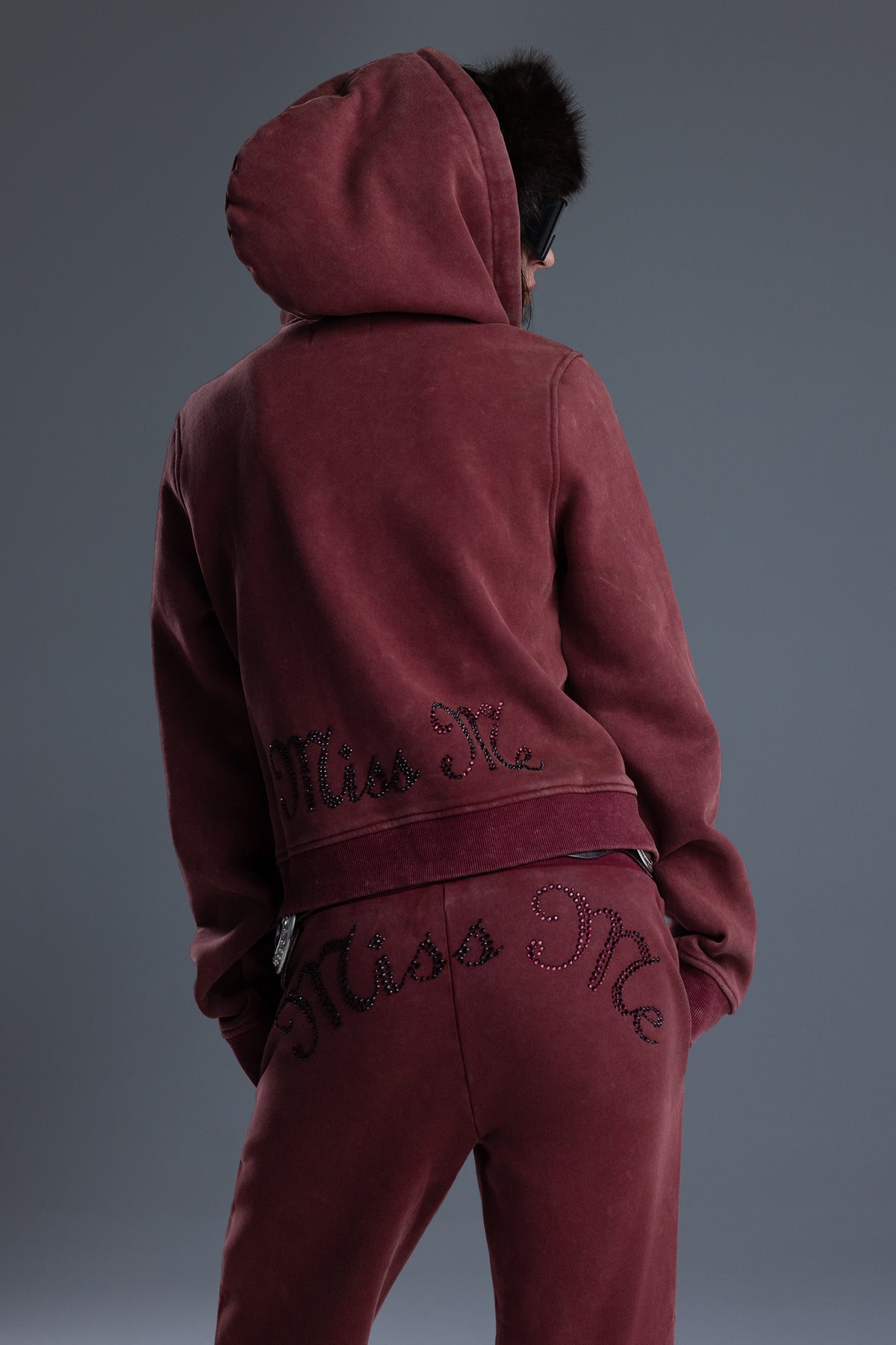 Fitted hoodie – Rhinestone-embellished Miss Me branding – Ribbed cuffs and hem – Adjustable drawstrings with branded aglets – Logo zipper pull tab – Zip-front closure Model is wearing size: 25 Model Measurements: Height: 5????Bust: 32A Waist: 24??Hips: 34??Fabric Content: Self: 50.7% Cotton, 49.3% Polyester / Contrast: 95.7% Cotton, 4.3% Spandex Care: Gentle machine wash inside-out with like colors in cold water. Tumble dry low. Style No. MJ0794L-RUSSET RED, MJ0794L-BLACK