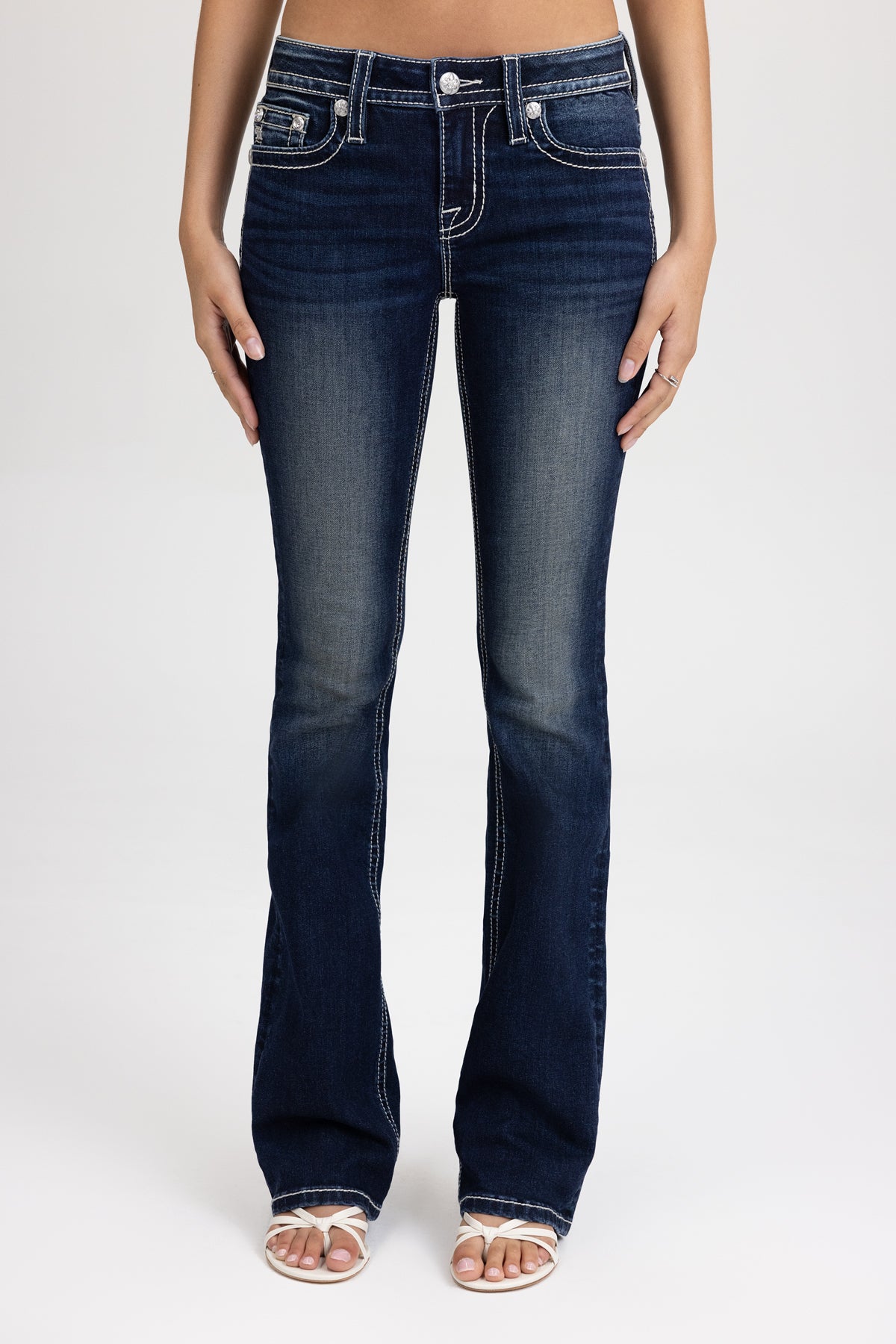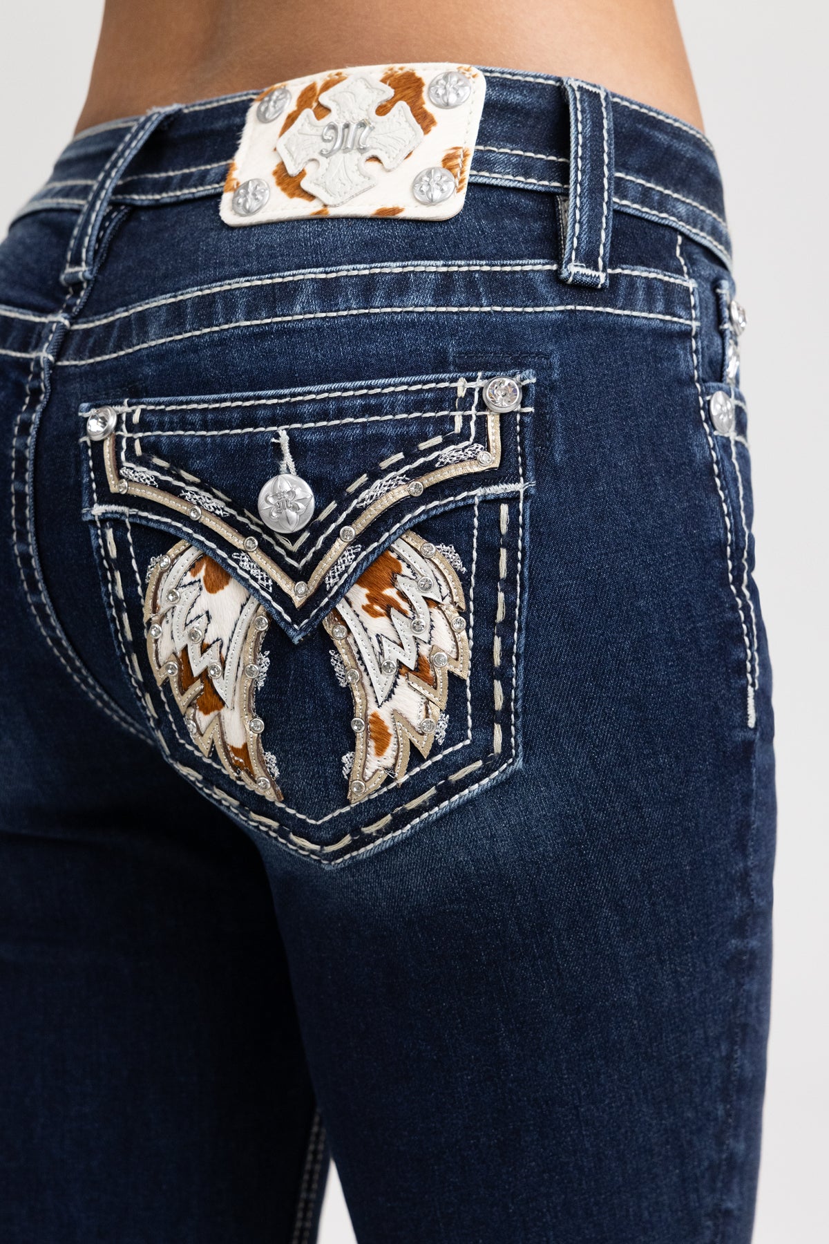 Washed, mid-rise bootcut jeans – Embroidered faux cowhide wing design – Rhinestone-studded leather appliqué accents – Metallic crosshatch mesh and saddle-stitched detailing – Embossed white studded leather cross faux cowhide Miss Me brand patch – Whiskering details – Functional back pockets – 5-pocket design Model is wearing size: 25 Model Measurements: Height: 5????Bust: 32B Waist: 25??Hips: 34??Fabric Content: 91% Cotton, 6% Polyester, 3% Elastane Care: Gentle machine wash inside-out with like colors in cold water. Tumble dry low. Style No. M5082B214L-D1151, M5082B214S-D1151, M5082B214V-D1151