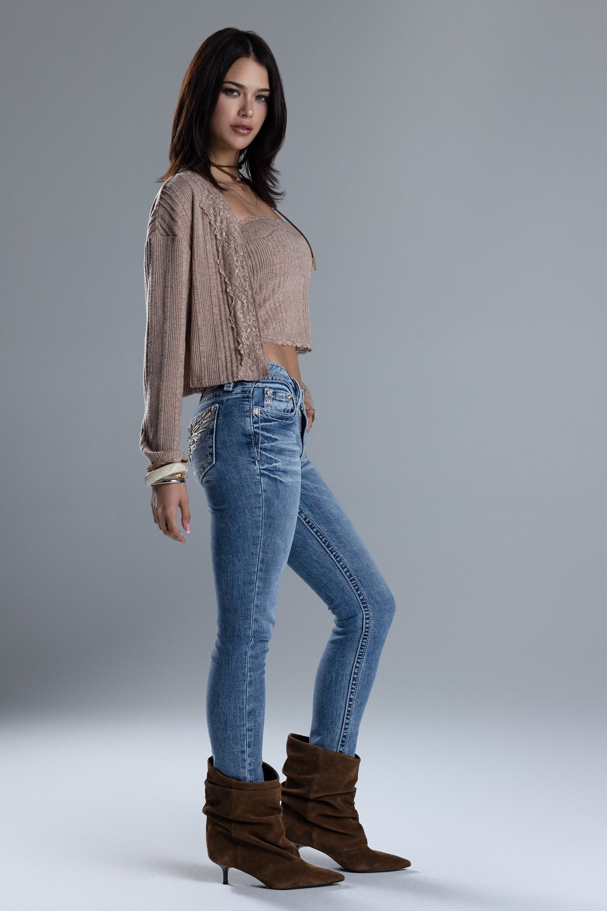 Matching sweater cardigan and tube top set – Ribbed knit construction – Lace trim detailing – Cropped open-front cardigan – Strapless neckline Style No. BMTP0003-DUSTY PINK, BMTP0003-GREY