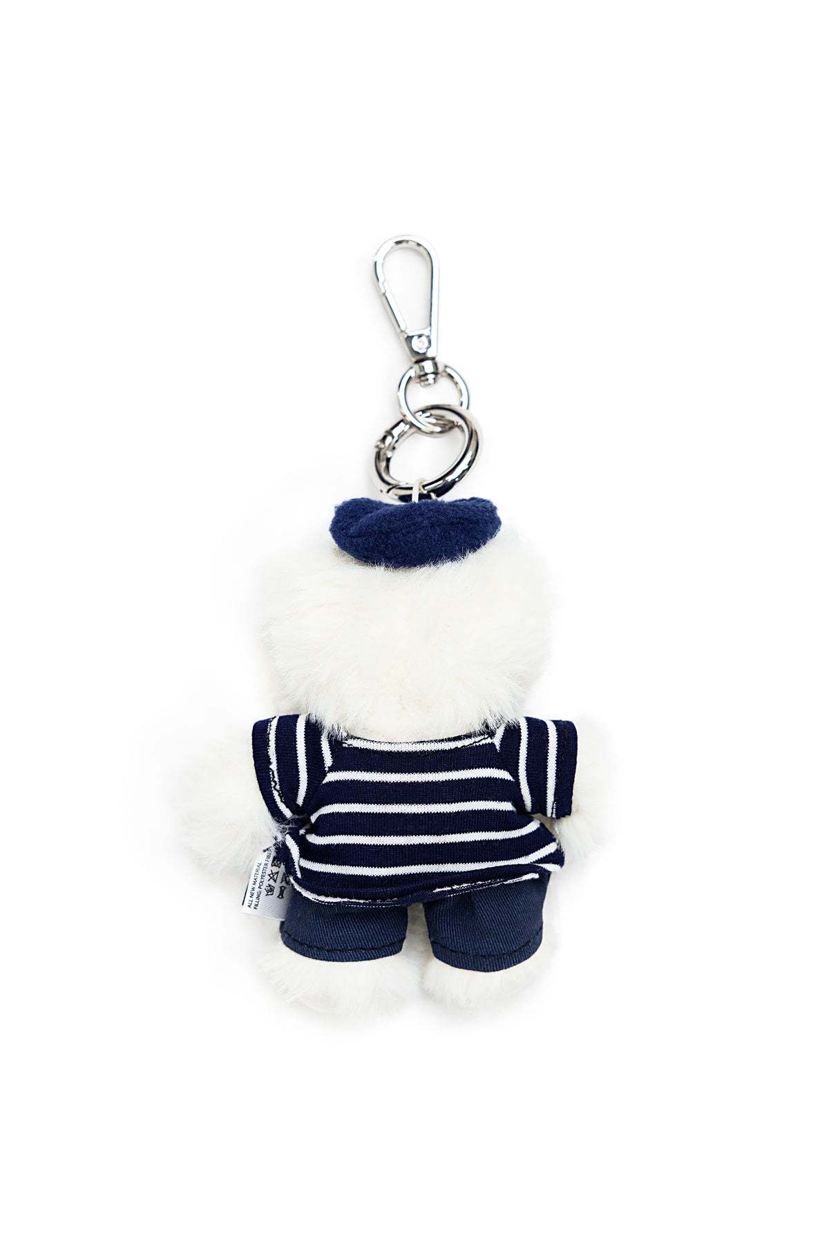 Plush teddy bear keychain – Luxe plush bear keychain made from premium-grade materials and fabric – Beret hat – Striped branded tee and denim pants – Sturdy metal clasp and key ring Style No. ACC0139-BLUE