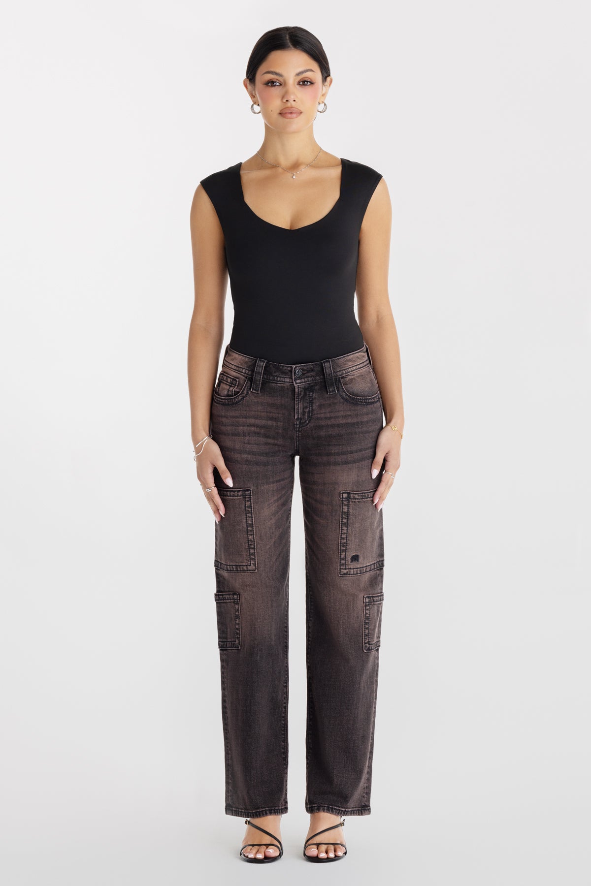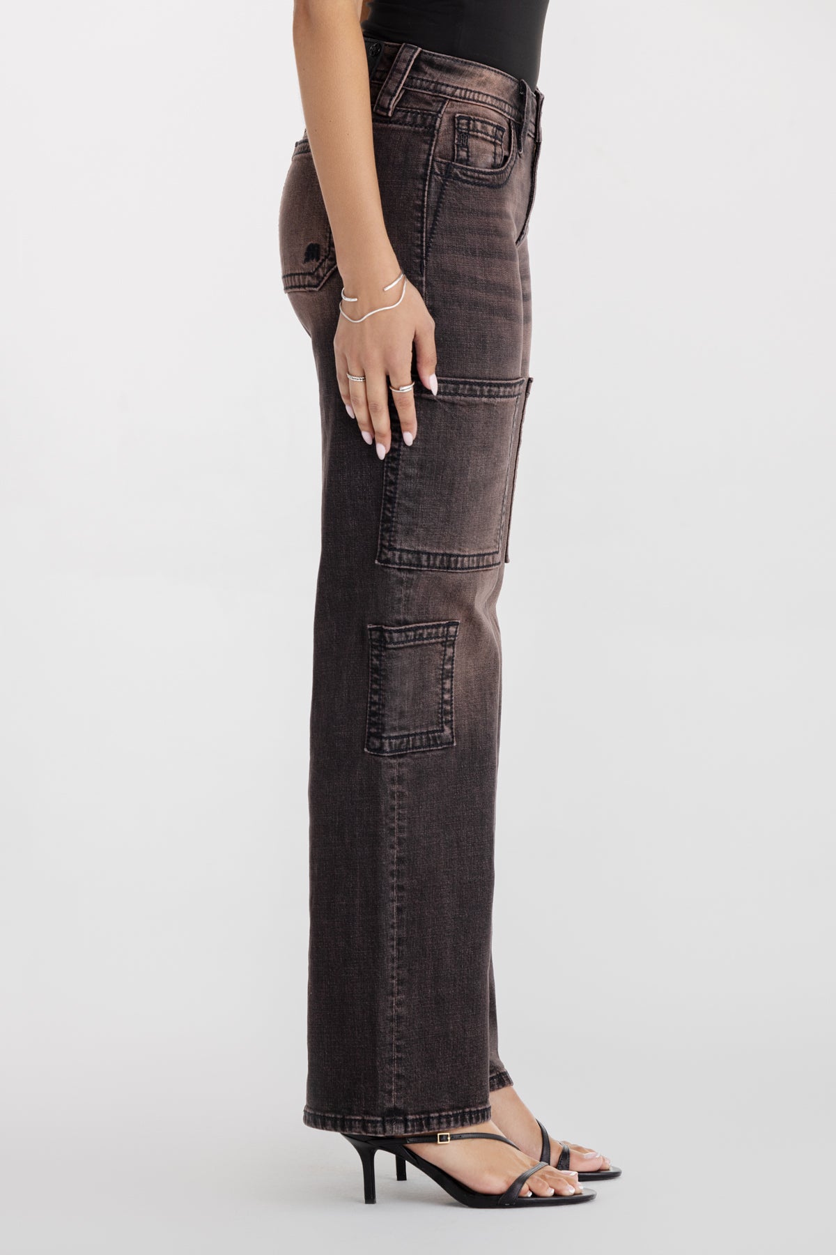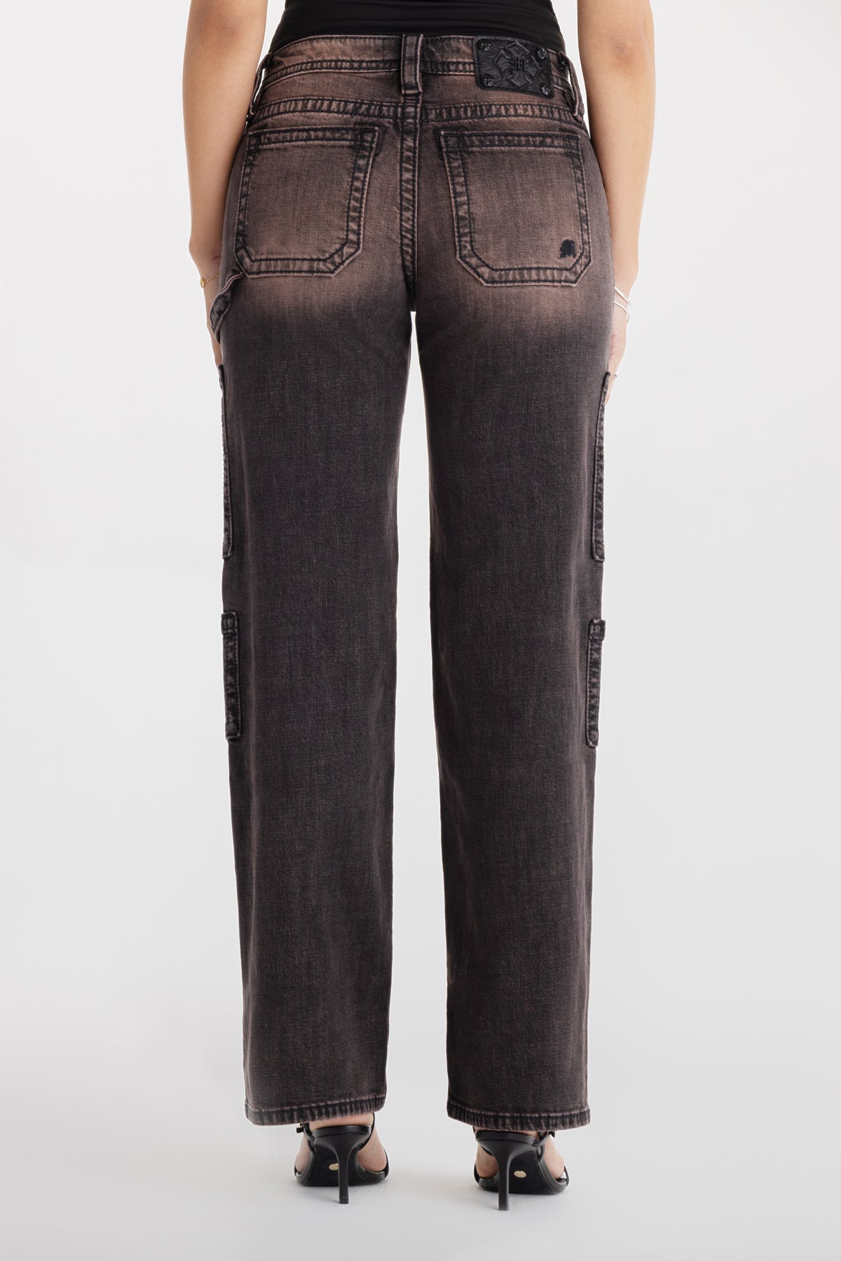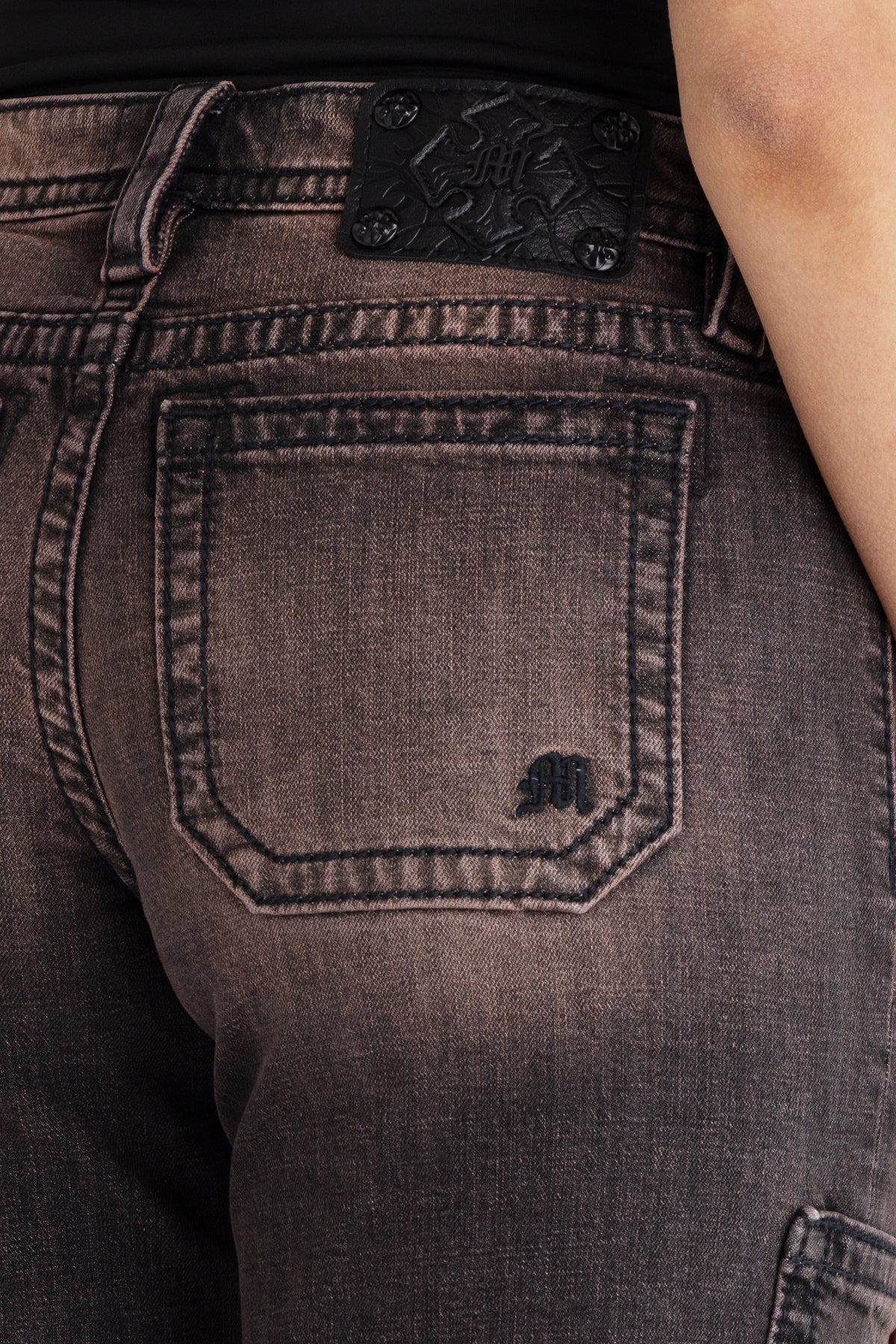 Washed, mid-rise cargo wide-leg jeans – Embroidered mini Gothic Miss Me logo – Quad open cargo pockets – Utility loop detail – Embossed black studded leather cross Miss Me brand patch – Whiskering details – 5-pocket design Model is wearing size: 25 Model Measurements: Height: 5’9″ Bust: 34B Waist: 25″ Hips: 36″ Fabric Content: 99% Cotton, 1% Elastane Care: Gentle machine wash inside-out with like colors in cold water. Tumble dry low. Style No. M2375WS-VTG BRGNDY, M2375WV-VTG BRGNDY
