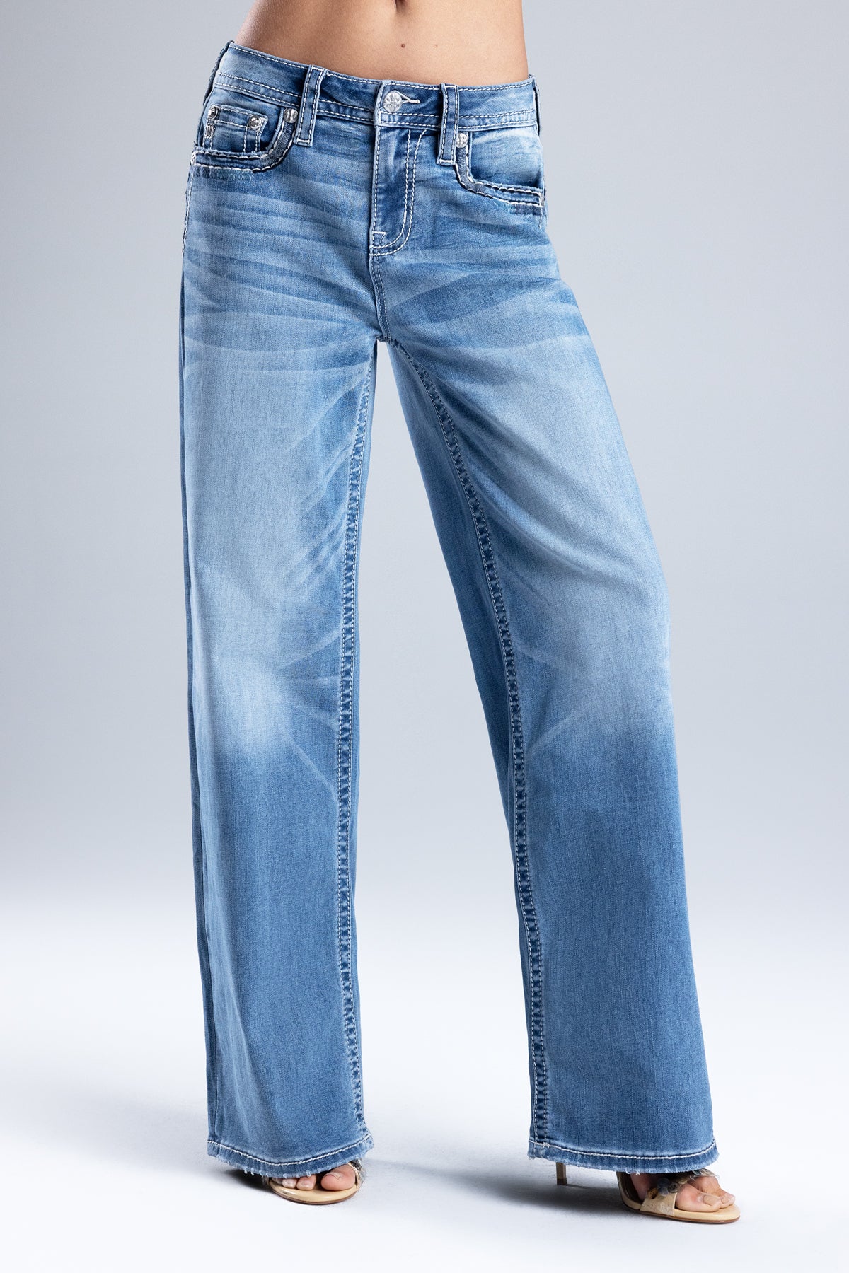 Washed, high-rise wide-leg jeans – Saddle-stitched border design – Textured soundwave embroidery – Embroidered mini Miss Me logo – Embossed white leather cross Miss Me brand patch – Whiskering details – 5-pocket design Style No. H5014W422L-M1036, H5014W422S-M1036, H5014W422V-M1036