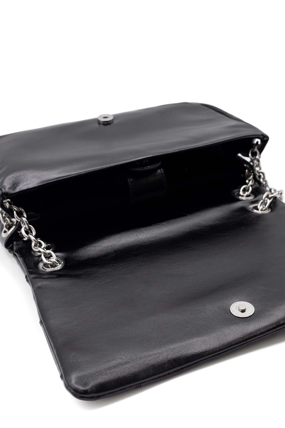 Black faux leather bag – Chain link strap with faux leather handle – Flap design with magnetic snap closure – Interior slit and zip pockets with Miss Me brand tag – Outer snap pocket – Textured puffer padding exterior – Engraved Miss Me metallic plate Fabric Content: Shell 100% Polyurethane; Lining 100% Polyester Care: Do not wash. Style No. BGS0117-BLACK