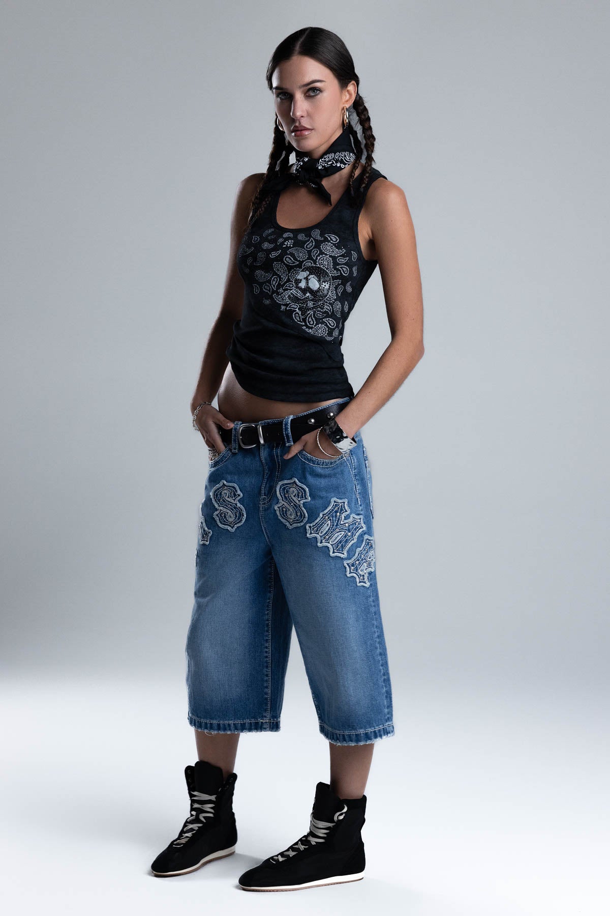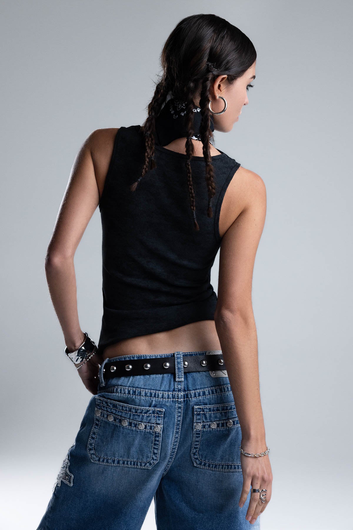 Acid-washed slim fit graphic tank top – Skull and paisley graphic embellished with rhinestone details – Scoop neckline – Stretchy ribbed knit fabric Style No. BMT0088T-WHITE, BMT0088T-BLACK