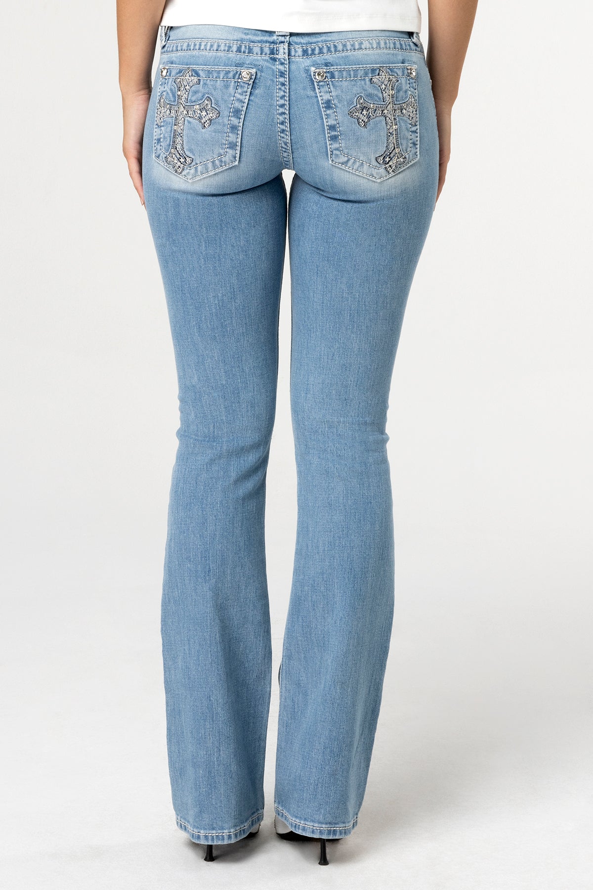 Mid-rise, light-wash bootcut jeans – Studded and sequined cross embroidery back pocket design – Rhinestone rivets – Embossed black leather cross Miss Me brand patch – Slight fading – 5-pocket design Style No. M3936B2-L284; M3936B2S-L284; M3936B2V-L284