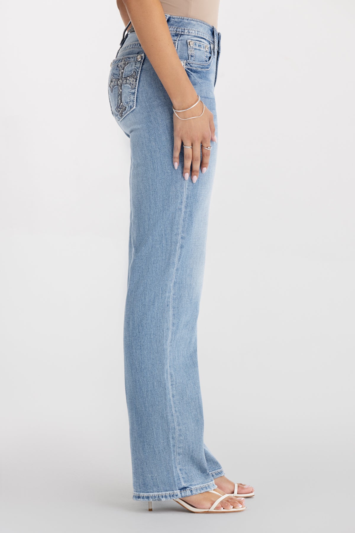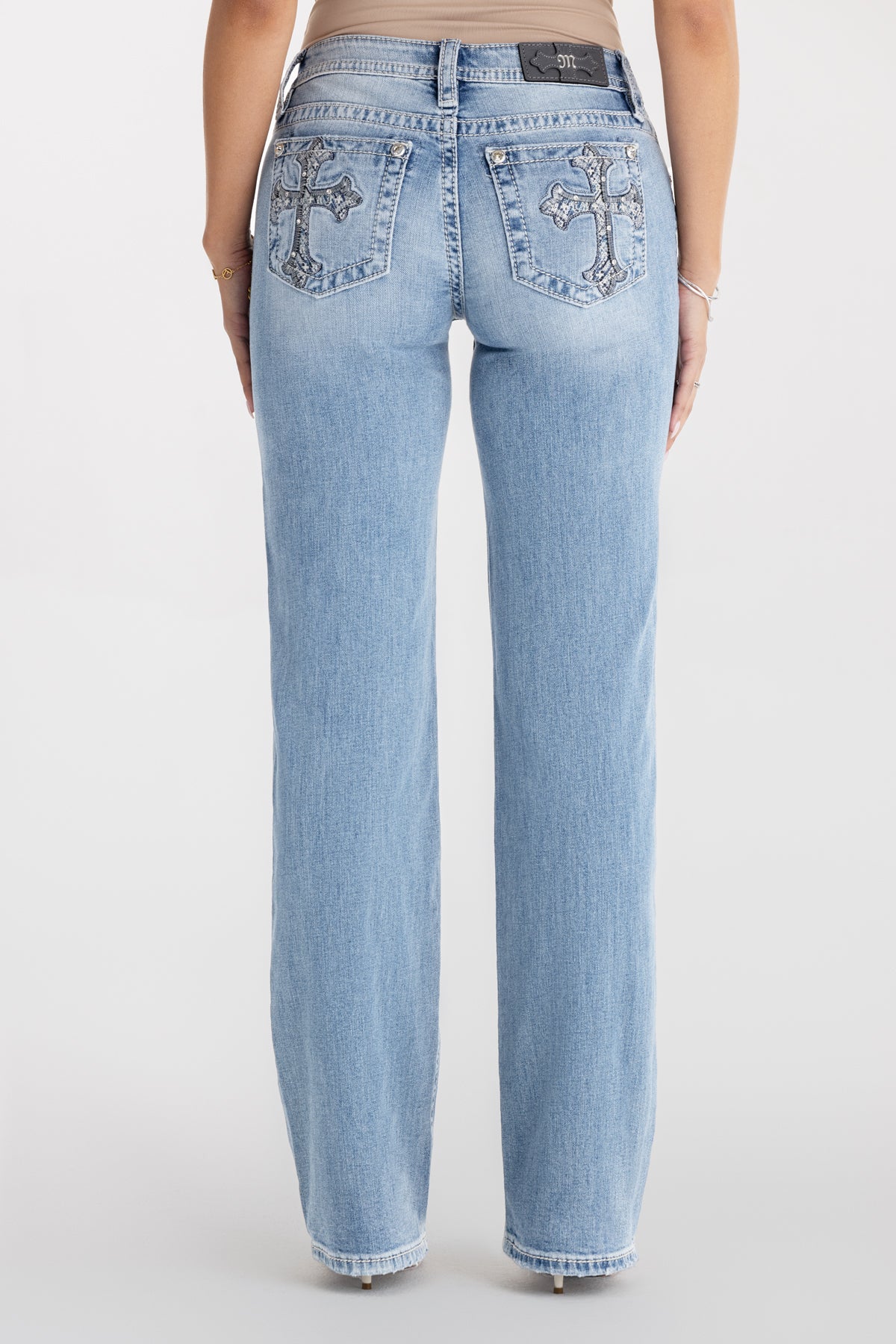 Washed, mid-rise slim wide jeans – Embroidered cross with stud and sequin accents – Rhinestone rivets – Embossed black leather cross Miss Me brand patch – Subtle raw-edge hem – Whiskering details – 5-pocket design Model is wearing size: 25 Model Measurements: Height: 5’9.5″ Bust: 34″ Waist: 24″ Hips: 35″ Fabric Content: 99% Cotton, 1% Elastane Care: Gentle machine wash inside-out with like colors in cold water. Tumble dry low. Style No. M9510SWL-L341, M9510SWV-L341, M9510SWS-L341