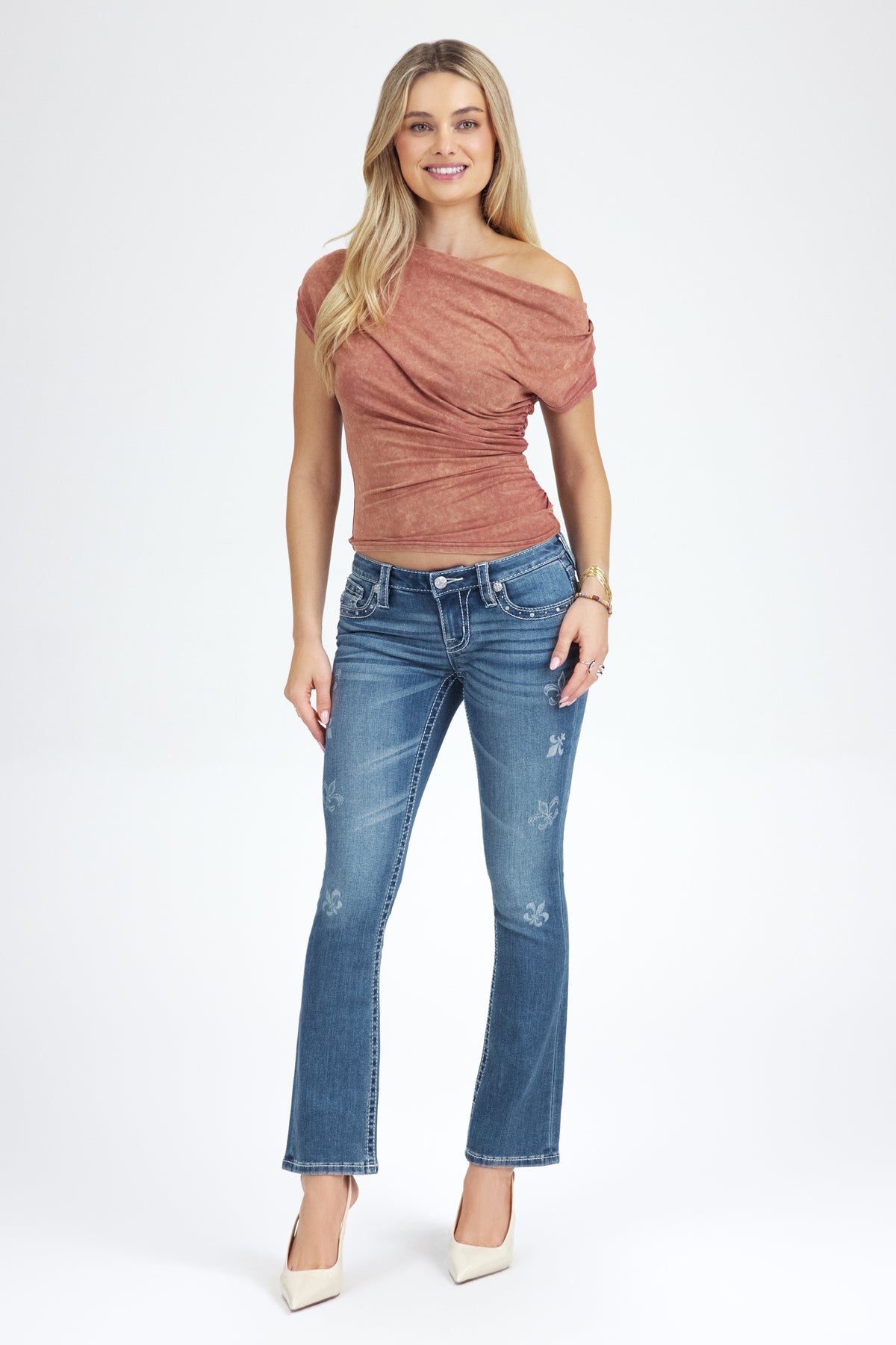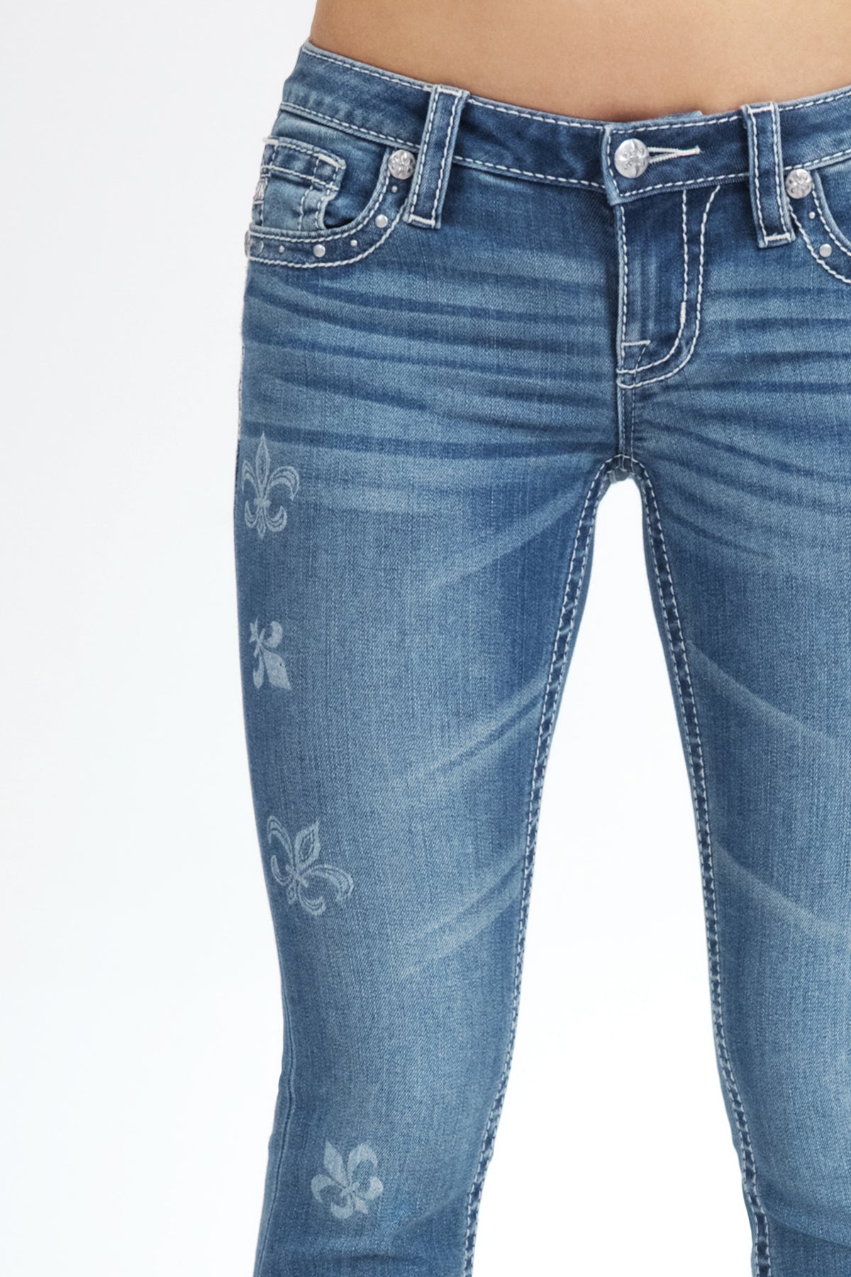 Low-rise, washed slim bootcut jeans – Simple M logo with mini rhinestone details – Flat silver rivet hem detail on front and back pockets – Laser etched Fleur-De-Lis on front – Rhinestone rivets – Embossed white leather logo brand patch – Slight fading Fabric Content: 52% Cotton, 27% Lyocell, 20% Polyester, 1% Elastane Care: Gentle machine wash inside-out with like colors in cold water, Tumble dry low Model is wearing size: 26 Model Measurements: Height: 5????Bust: 34B Waist: 25??Hips: 36??Style No. L9344SB-V114, L9344SBS-V114