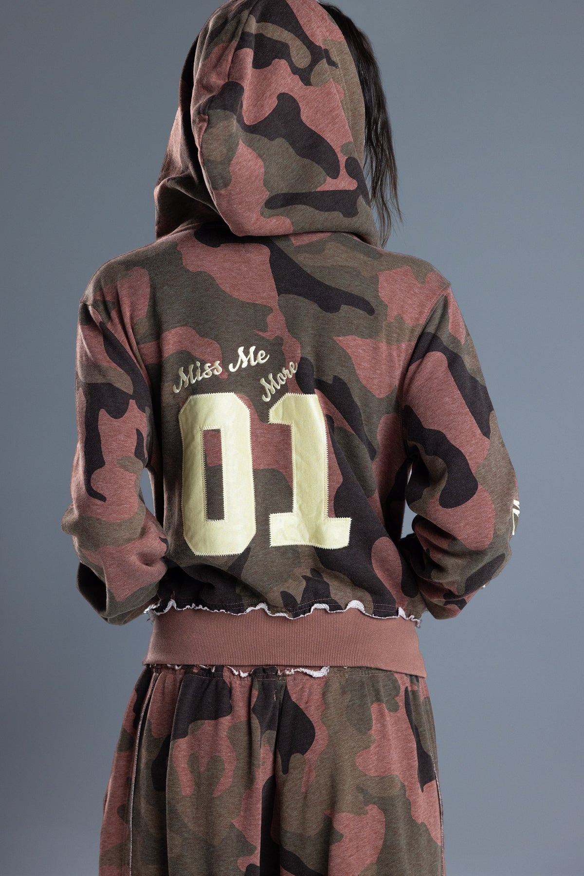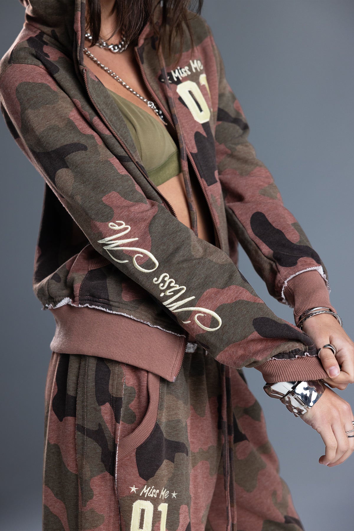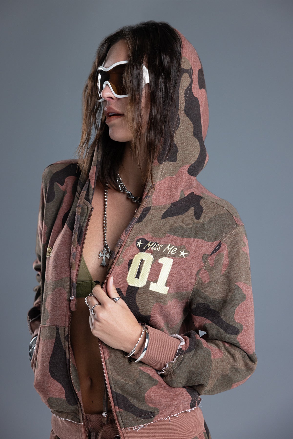 Zip-up hoodie jacket – Embroidered “Miss Me 01” branding – Branded patch and script sleeve accents – Layered raw-edge seam detailing – Ribbed cuffs and hem – Adjustable drawcord hood with logo zipper pull tab – Zip-front closure Style No. BMJ0028L-MAROON RED