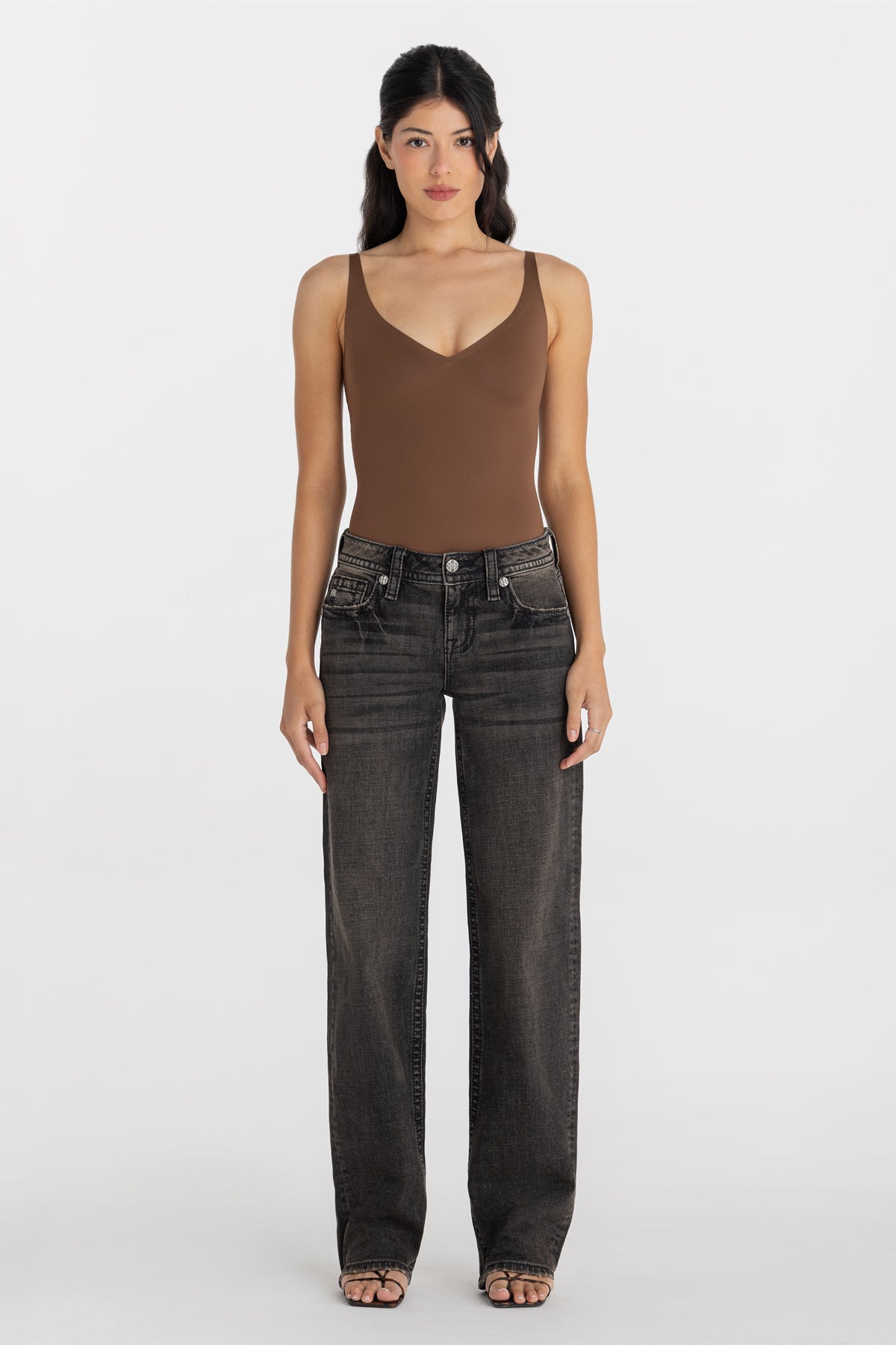 Washed, mid-rise bootcut jeans – Embroidered leather appliqué border design – Rhinestone rivet accents – Abraded pocket edges – Embossed black studded leather cross Miss Me brand patch – Whiskering details – Functional back pockets – 5-pocket design Model is wearing size: 25 Model Measurements: Height: 5’9″ Bust: 34B Waist: 25″ Hips: 36″ Fabric Content: 99% Cotton, 1% Elastane Care: Gentle machine wash inside-out with like colors in cold water. Tumble dry low. Style No.L9546SWL-B051, L9546SWS-B051, L9546SWV-B051