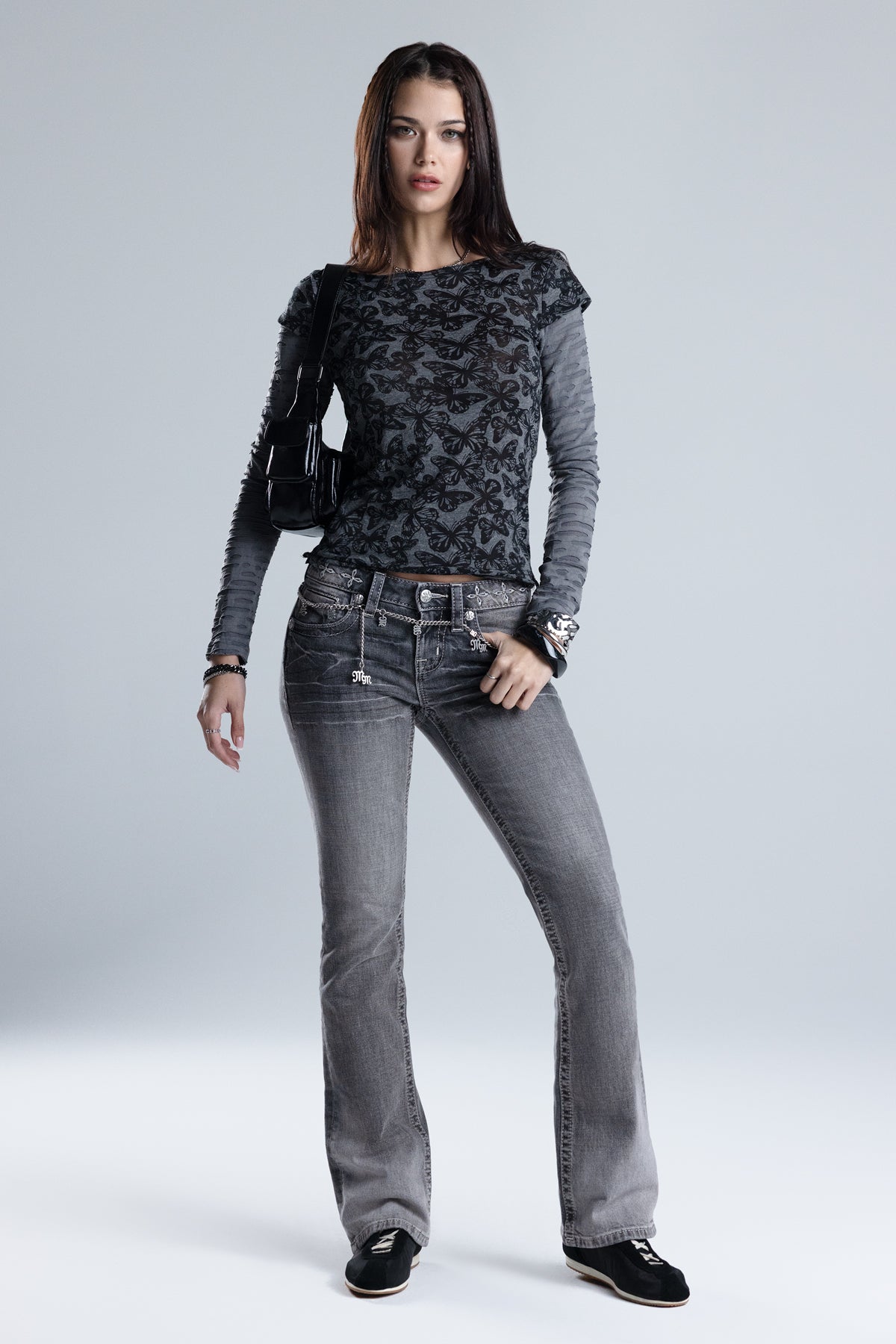 Relaxed fit, layered long-sleeve top – All-over butterfly print mesh design – Textured semi-sheer sleeve layering – Raw-edge trim detailing – Wide scoop neckline Style No. BMT0125L-CHRC BLK