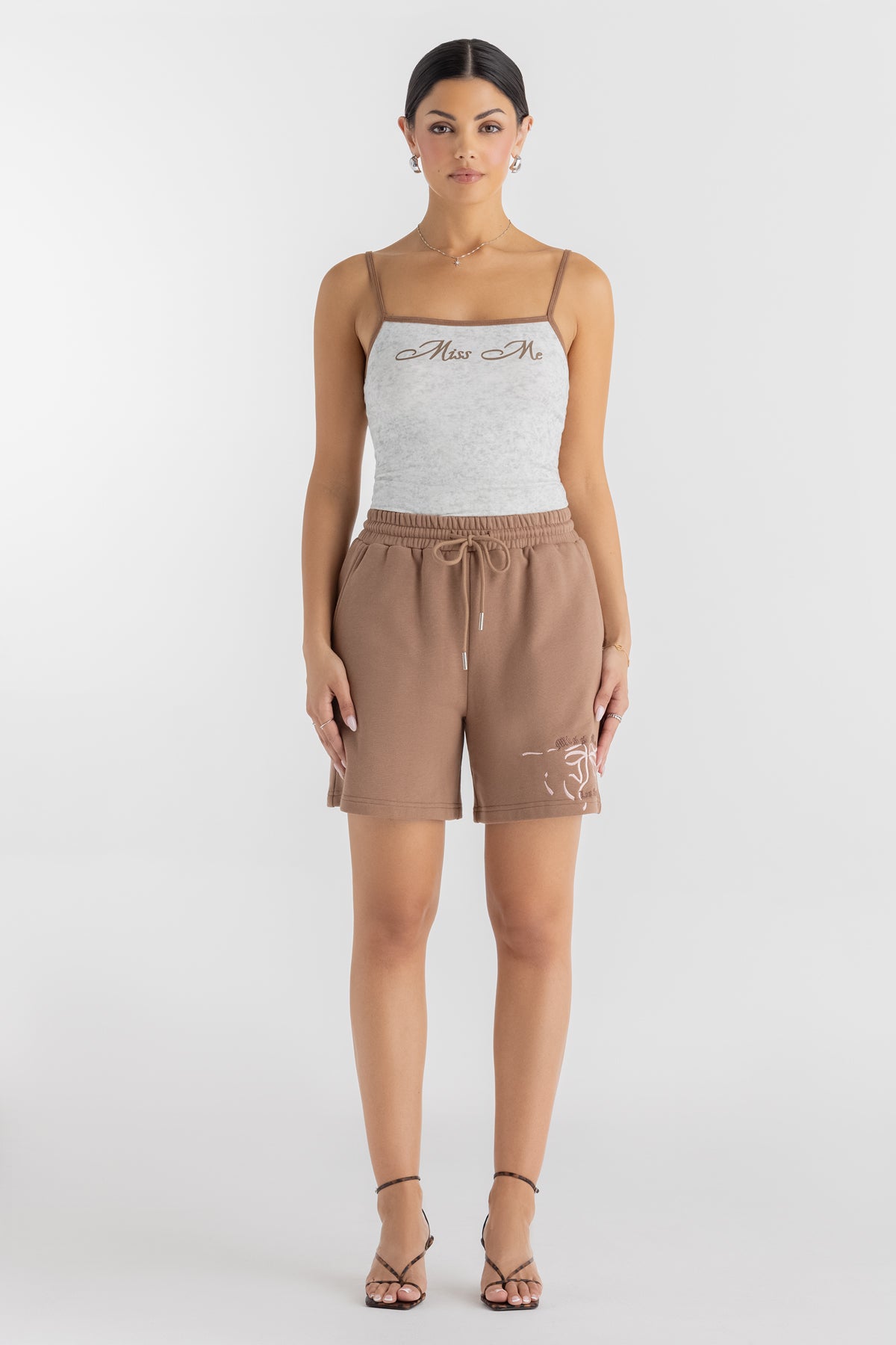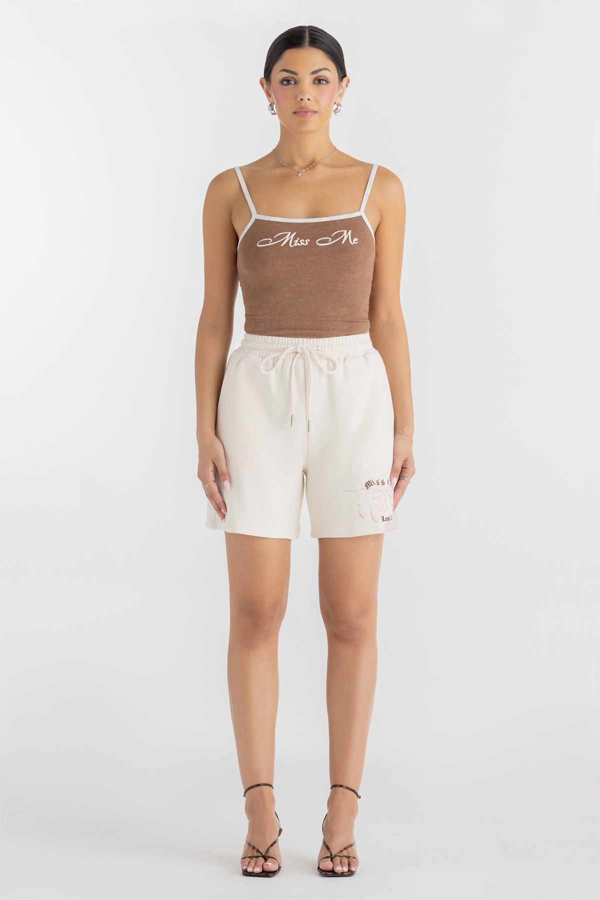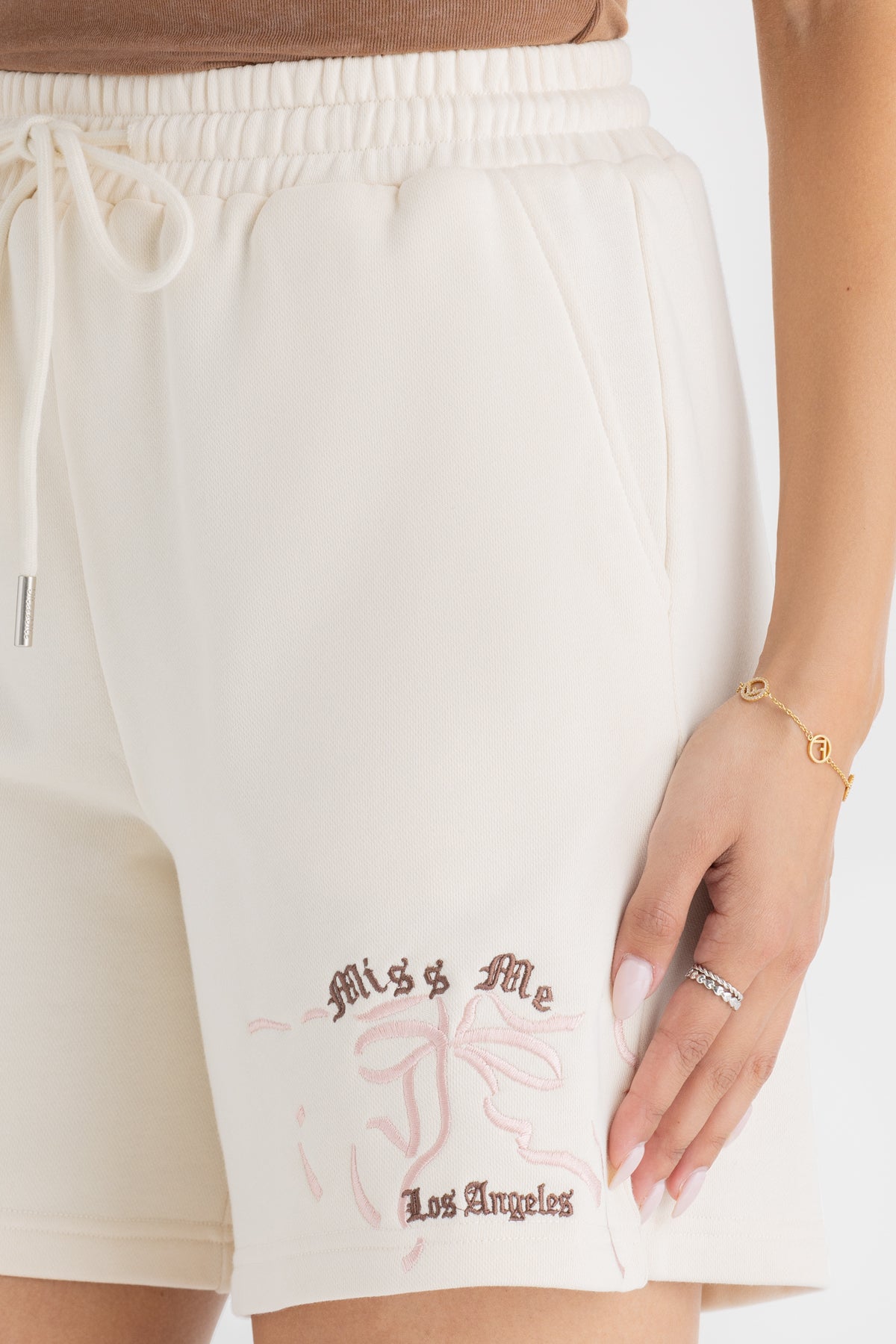 Sweat shorts – Ribbon and cross motif on back pocket – Embroidered front ribbon detail – Gothic Miss Me branding – Ruched waistline – Adjustable drawstrings with metal aglets – 3-pocket design Model is wearing size: S Model Measurements: Height: 5????Bust: 34B Waist: 25??Hips: 36??Fabric Content: Self: 52.4% Cotton, 47.6% Polyester; Trim: 100% Cotton Care: Gentle machine wash inside-out with like colors in cold water. Tumble dry low. Style No. BMP0028S-BEIGE, BMP0028S-COCOA BRN