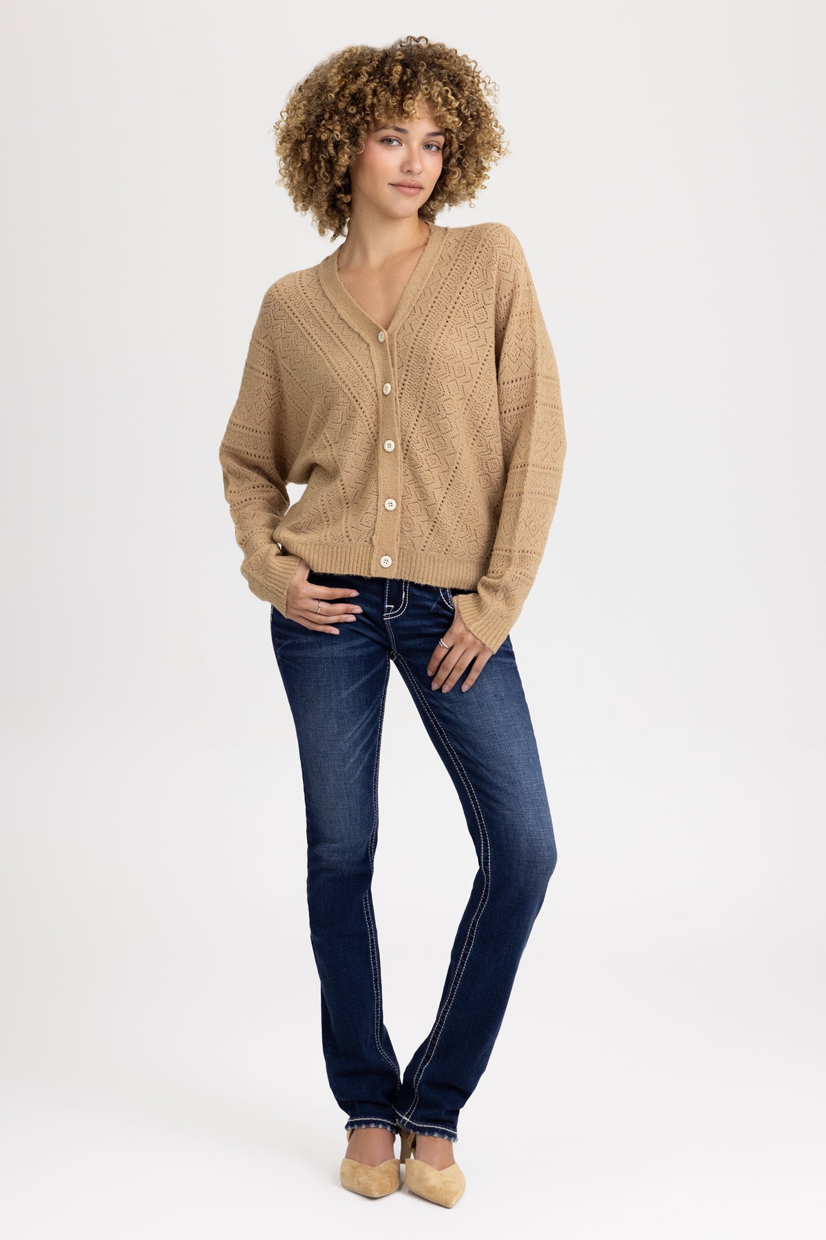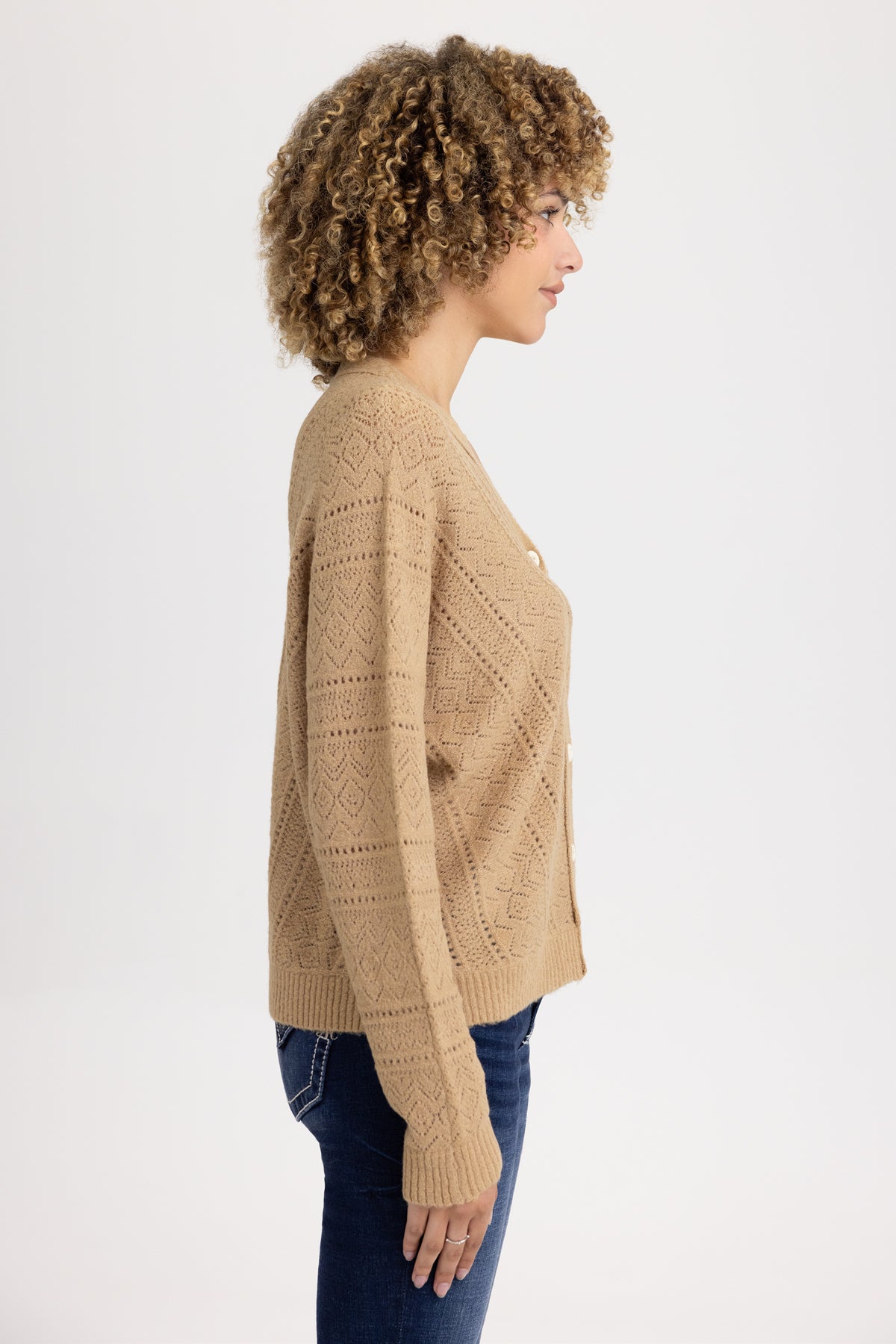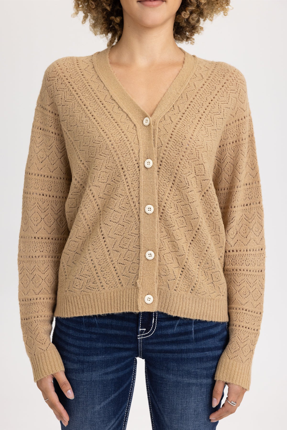 Pointelle knit cardigan – Geometric pointelle pattern – Paneled textured back design – V-neckline – Ribbed cuffs and hem – Front button closure – Relaxed fit Model is wearing size: S Model Measurements: Height: 5????Bust: 32B Waist: 25??Hips: 34??Fabric Content: Self: 77% Acrylic, 20% Nylon, 3% Spandex Care: Gentle hand wash cold. Lay flat to dry. Style No. MSW0468L-TAUPE BEIG