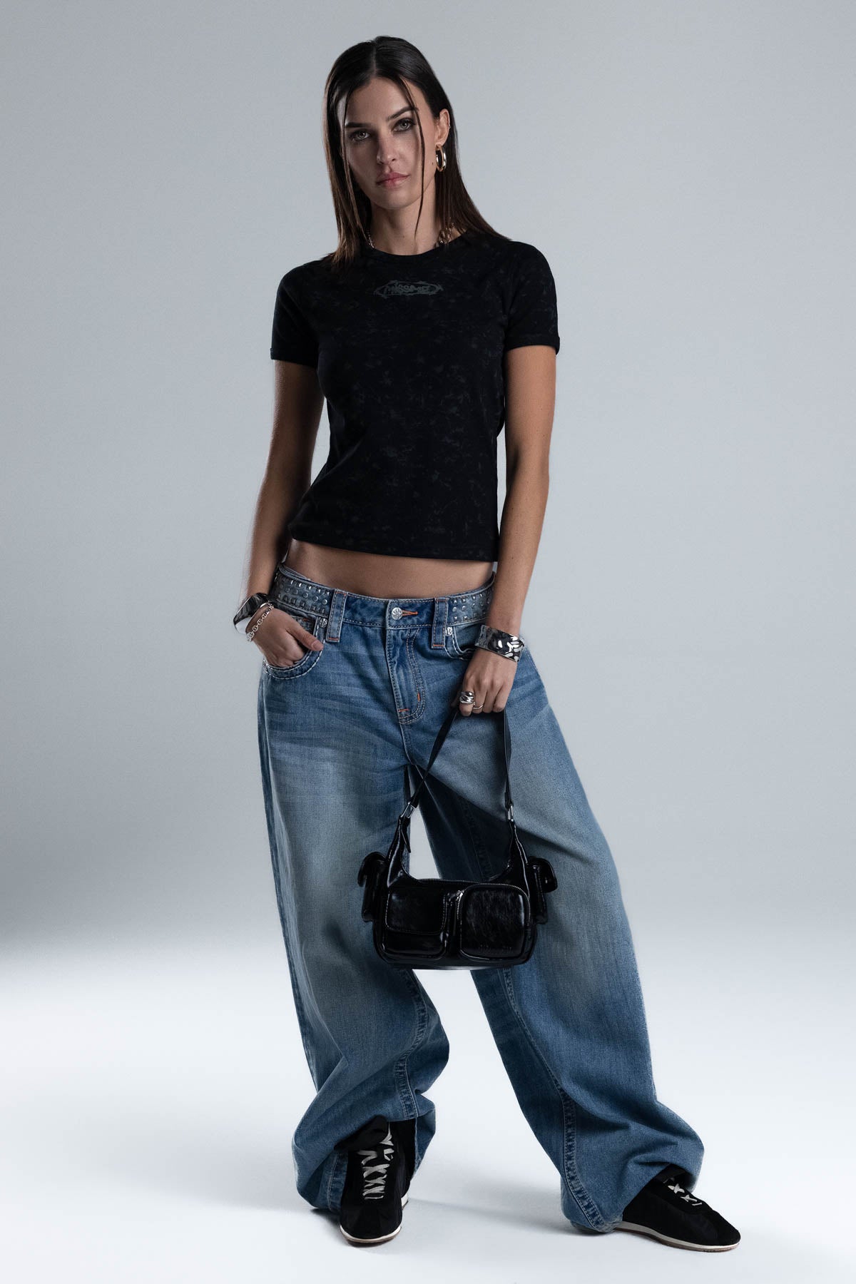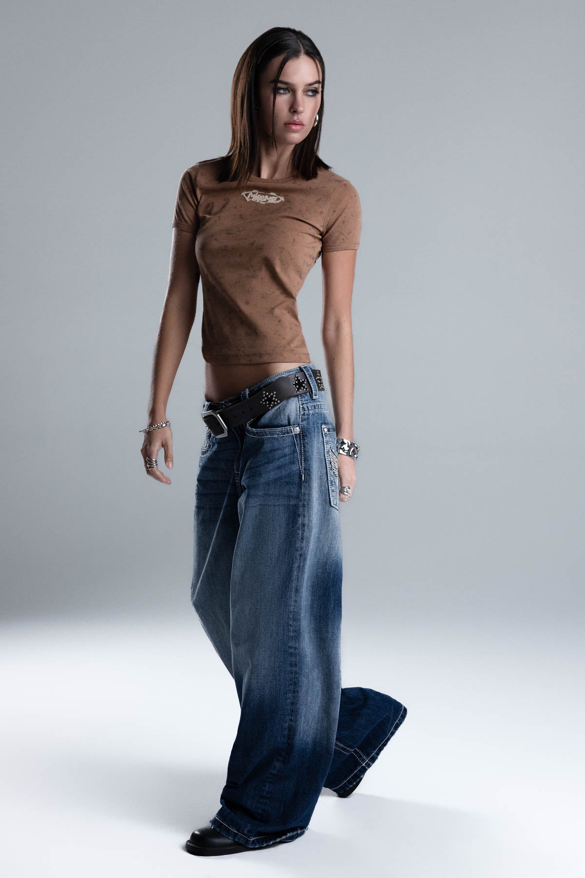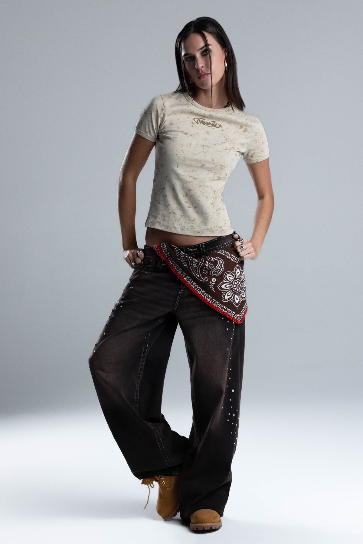Acid-washed graphic tee – Barbed wire-framed logo graphic – Classic crew neckline – Slim fit silhouette Style No. BMT0061S-BEIGE, BMT0061S-BLACK, BMT0061S-COCOA BRN