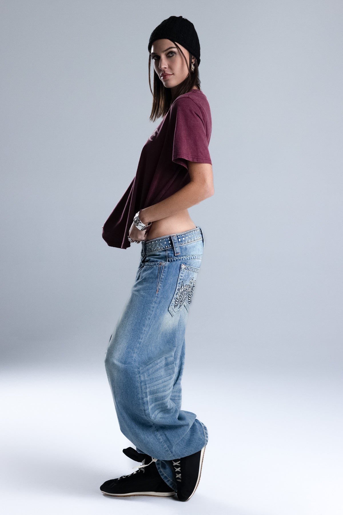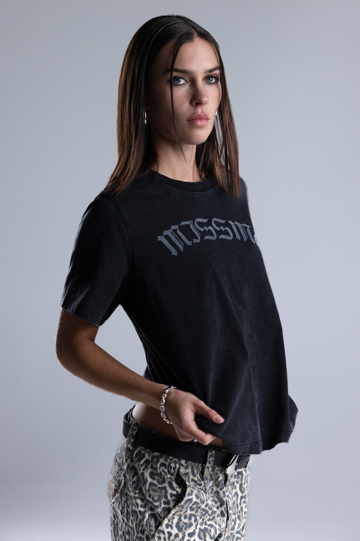 Relaxed fit graphic tee – Vintage gothic Miss Me script graphic – Soft washed cotton finish – Straight hem – Crew neckline Style No. BMT0879S-CHRC BLK, BMT0879S-RUSSET RED